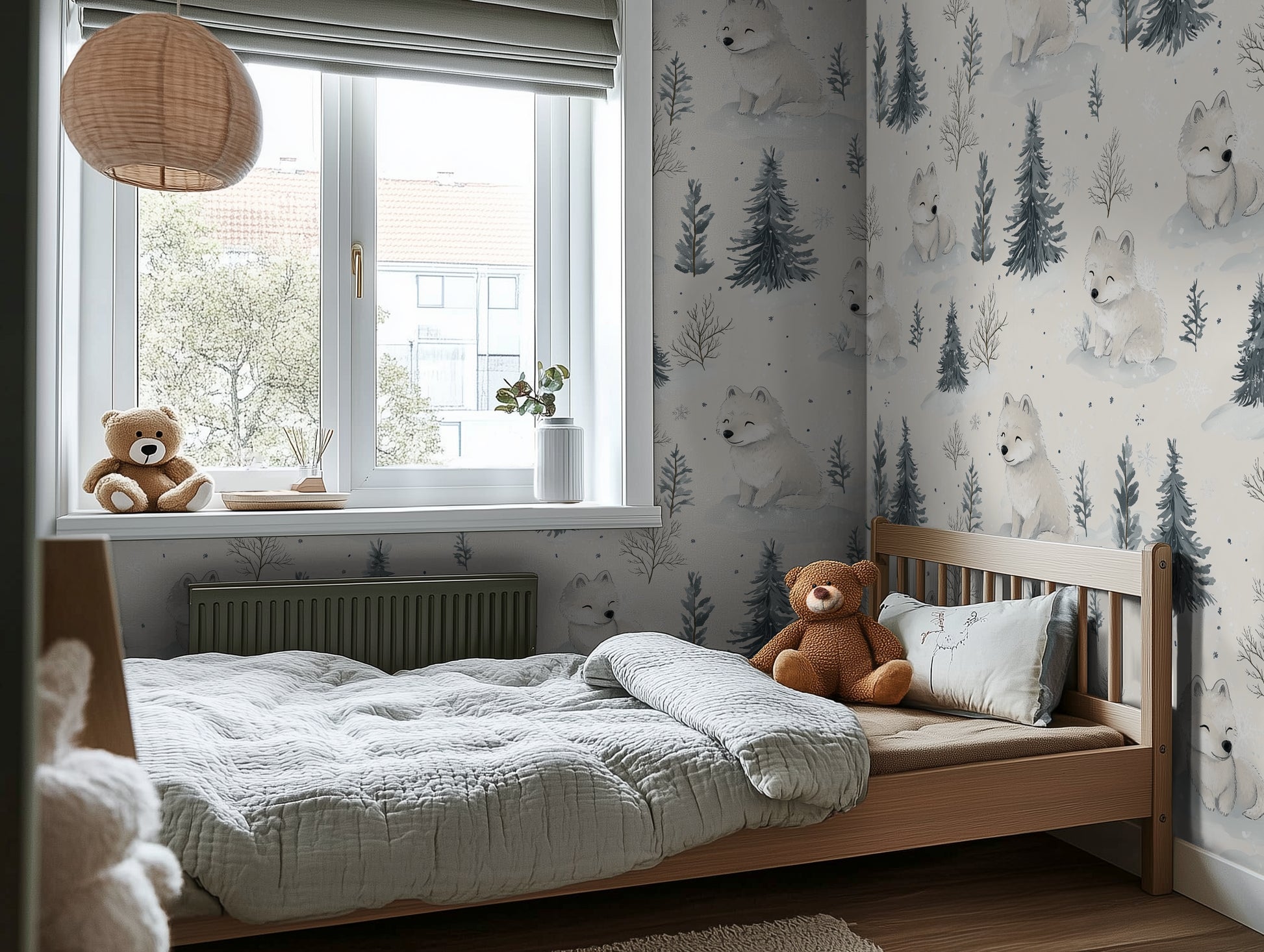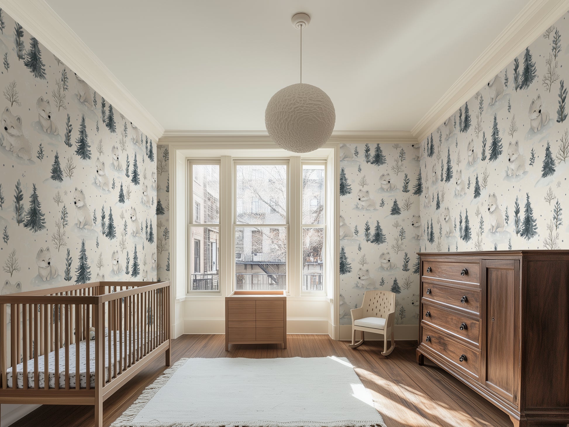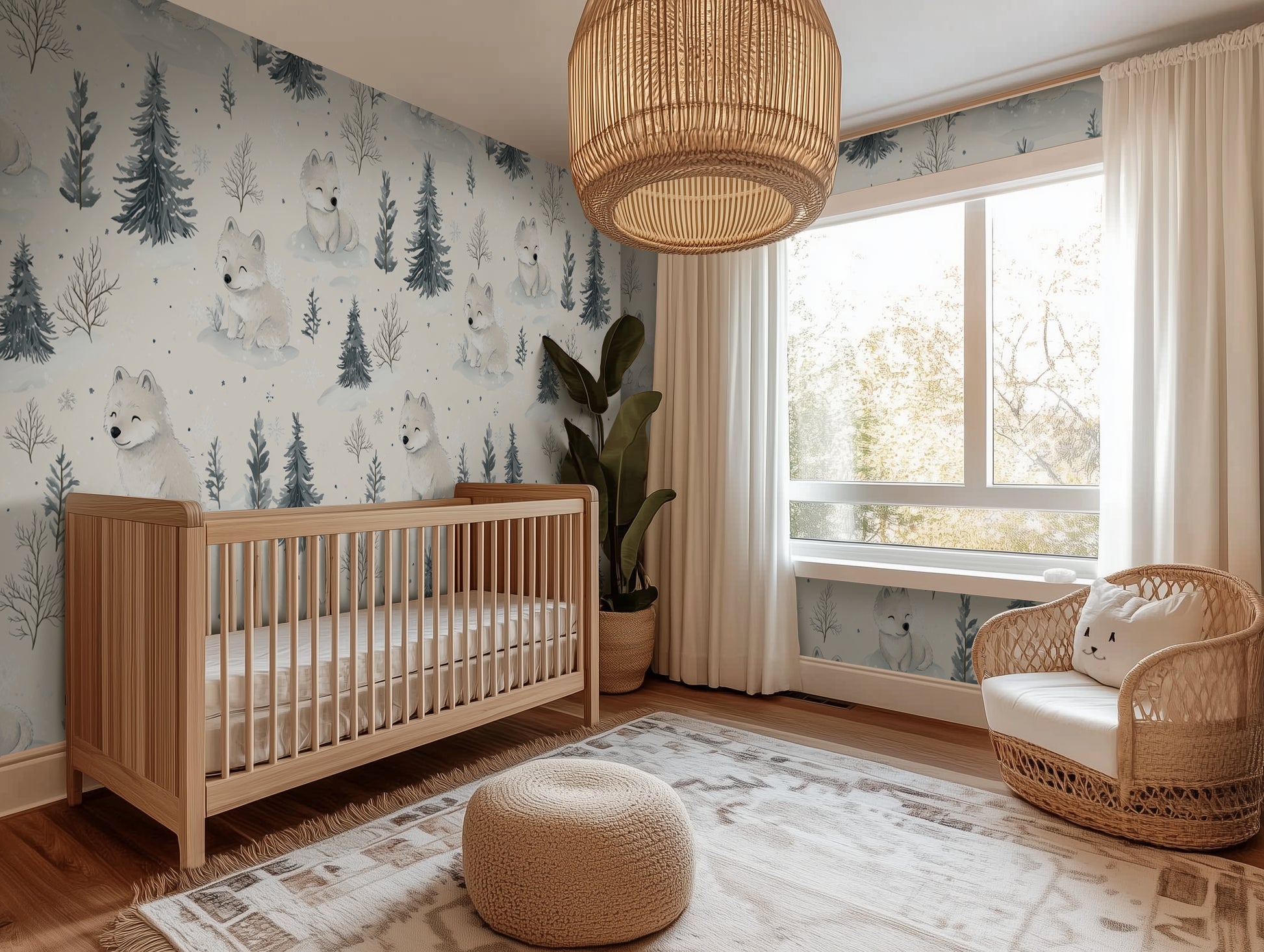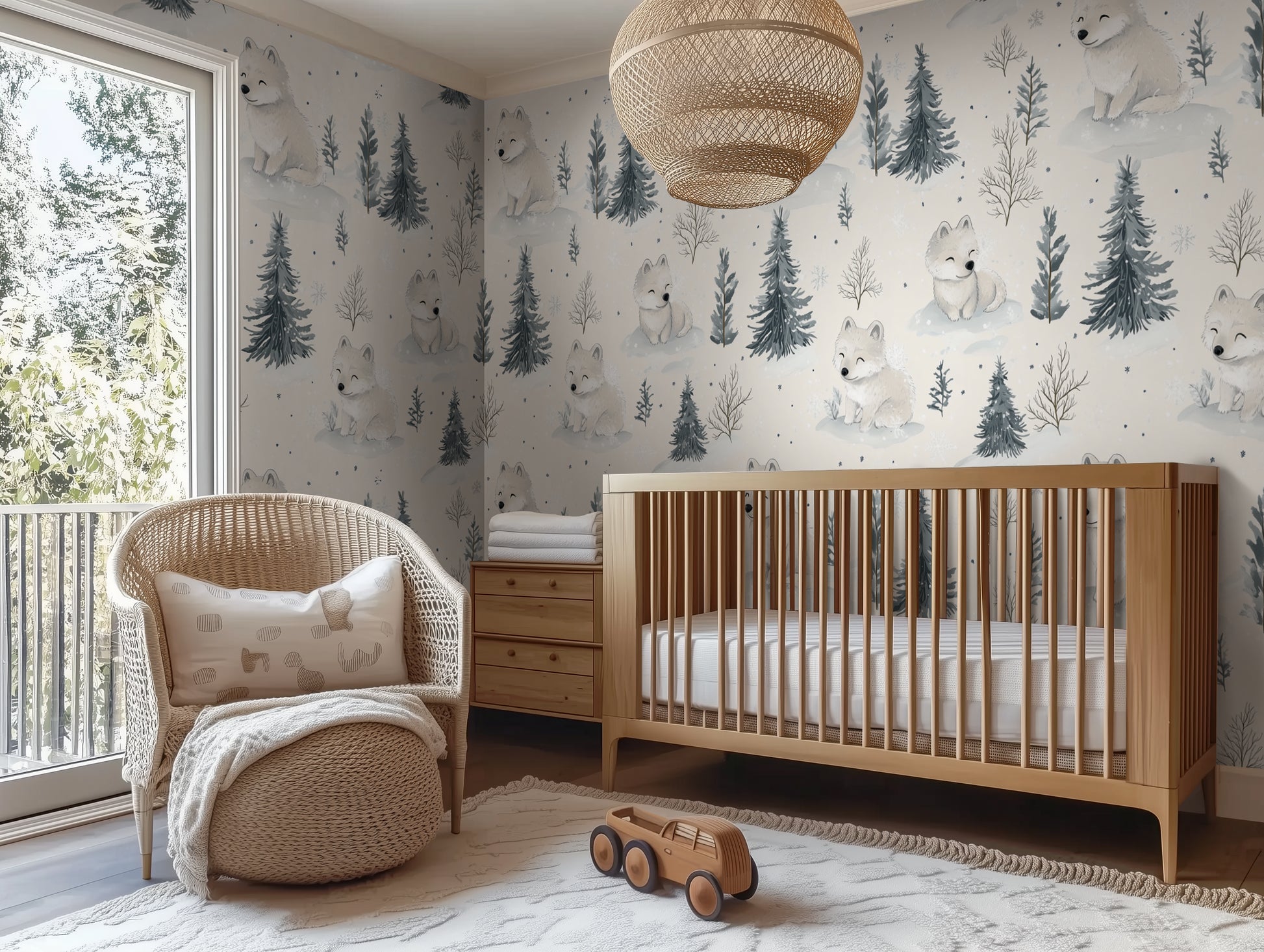 Neutral nurseries and woodland winter themes are both trending—and this design hits the sweet spot. Soft, snowy, and just a little wild, it’s perfect for modern homes with playful hearts.