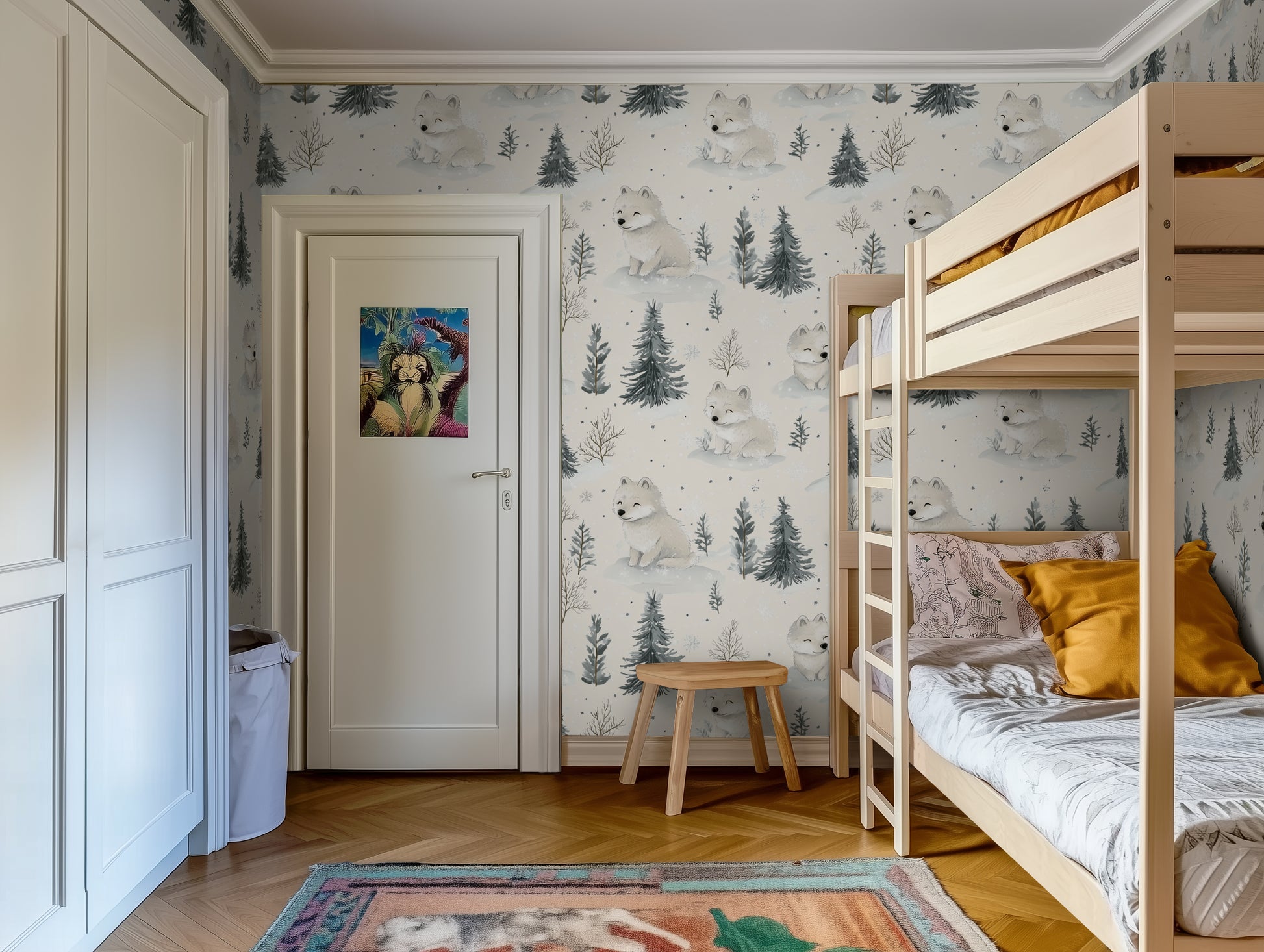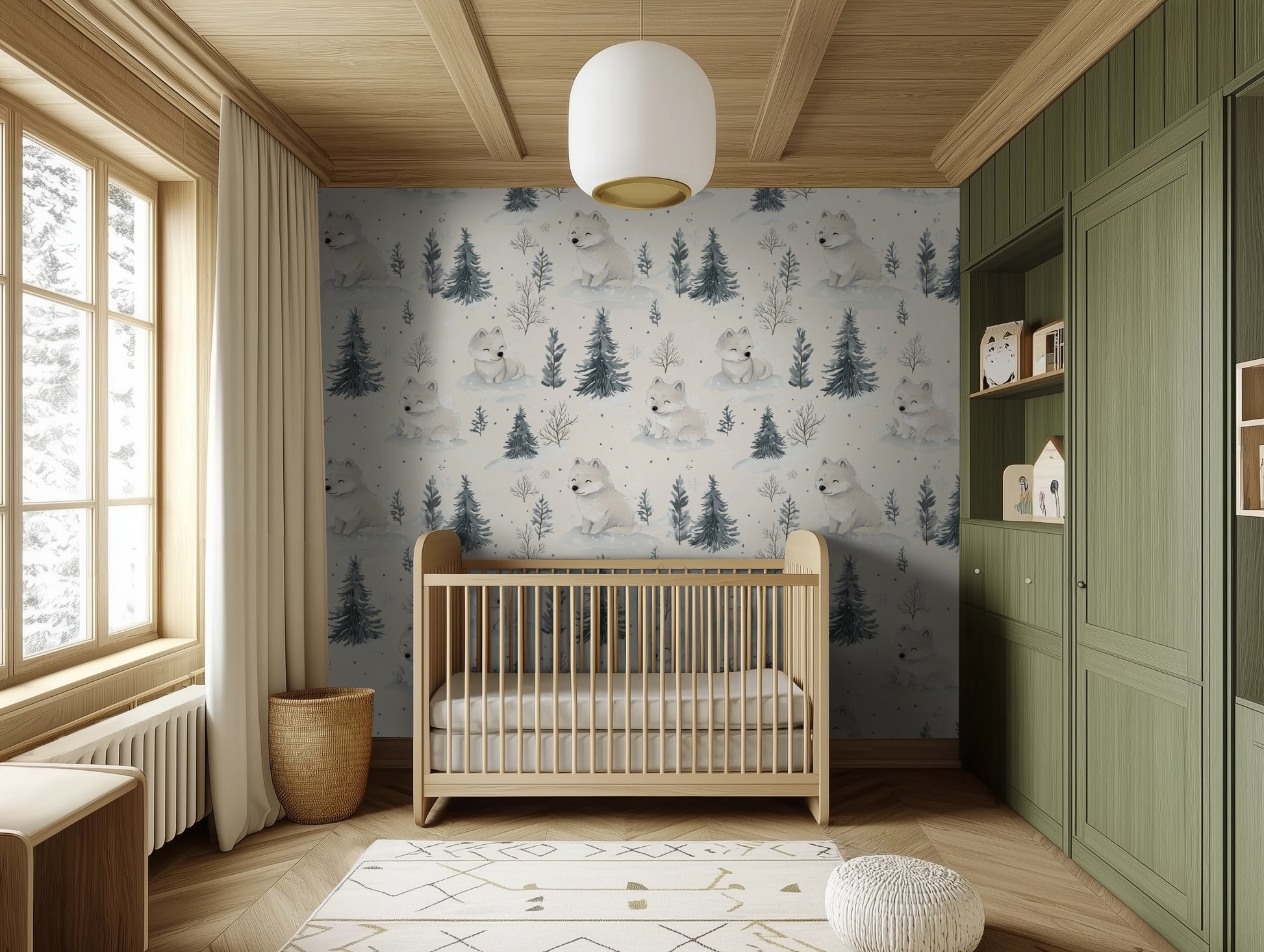 Meet the fluffiest snow guardians this side of bedtime. Baby Wolves in the Snow features baby arctic wolves nestled among evergreen trees and drifting flakes. Their soft expressions and snowy world create a feeling of calm and coziness, perfect for transforming a child’s room into a peaceful retreat.