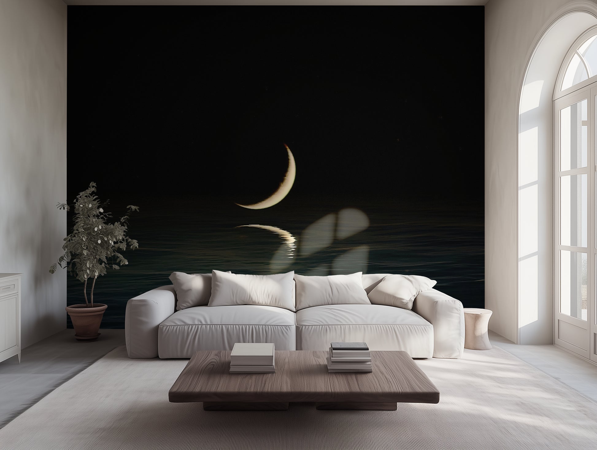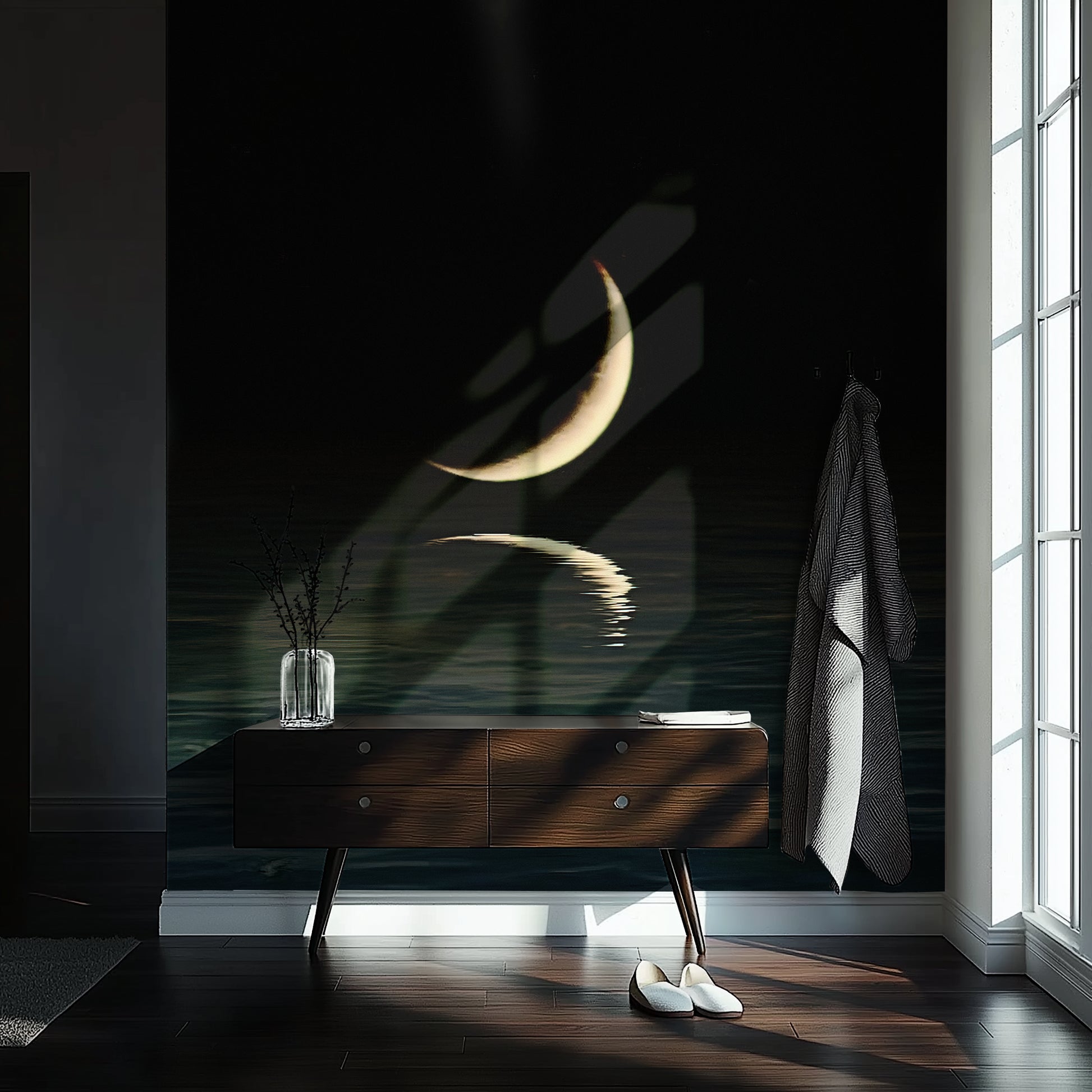 A crescent moon hovers just above the waterline, glowing over dark waves. Moonwake is intimacy in space—a quiet beacon in the dark. This modern moon wallpaper wraps your space in calm mystery, like a lullaby carved in silver.