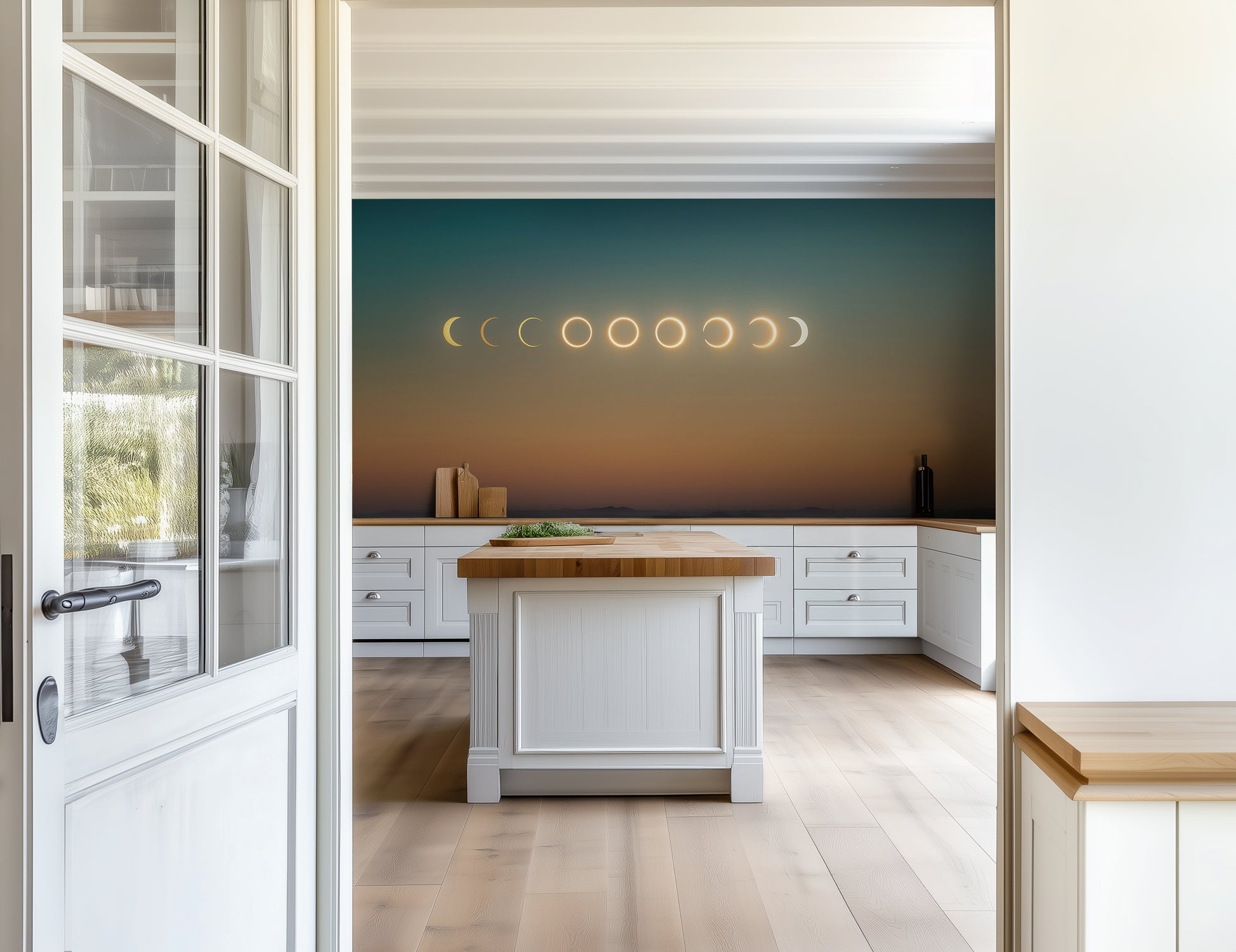 A sequence of moon phases glows above a darkening horizon—like a message etched in sky. Lunacode is celestial rhythm, clean and sacred. This moon phase wallpaper brings a quiet sense of alignment to your home, like the room itself is moving with the universe.