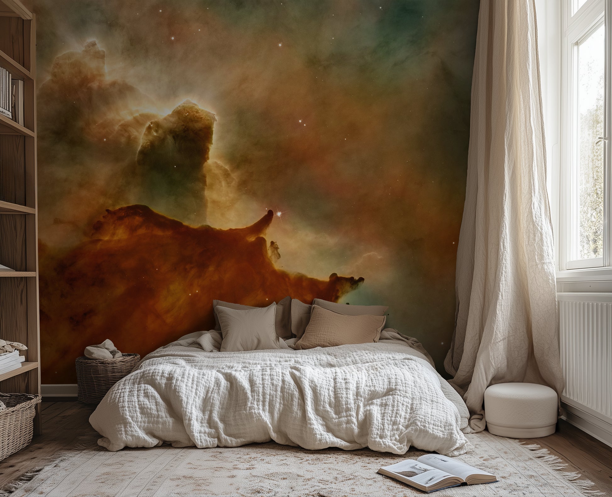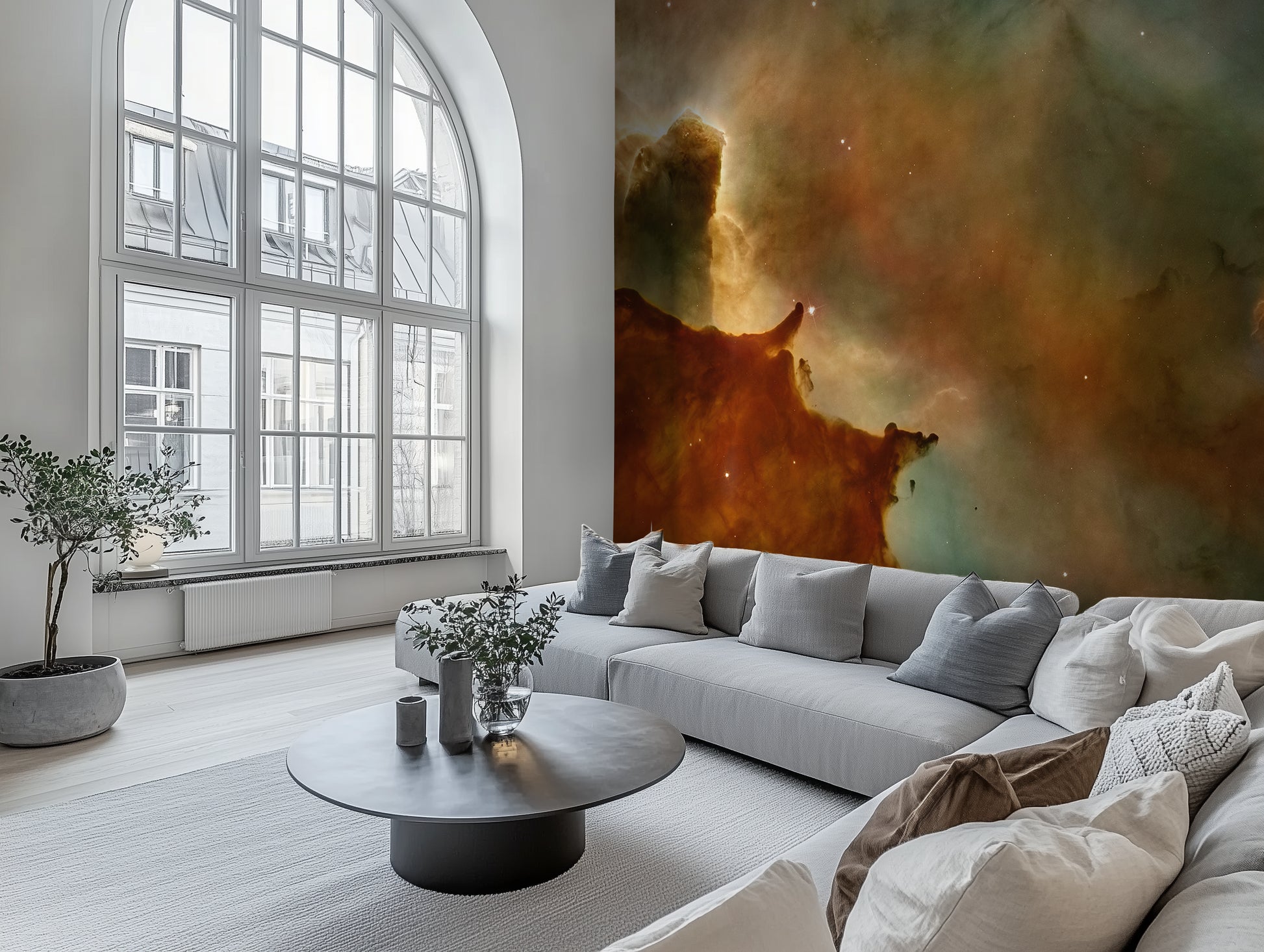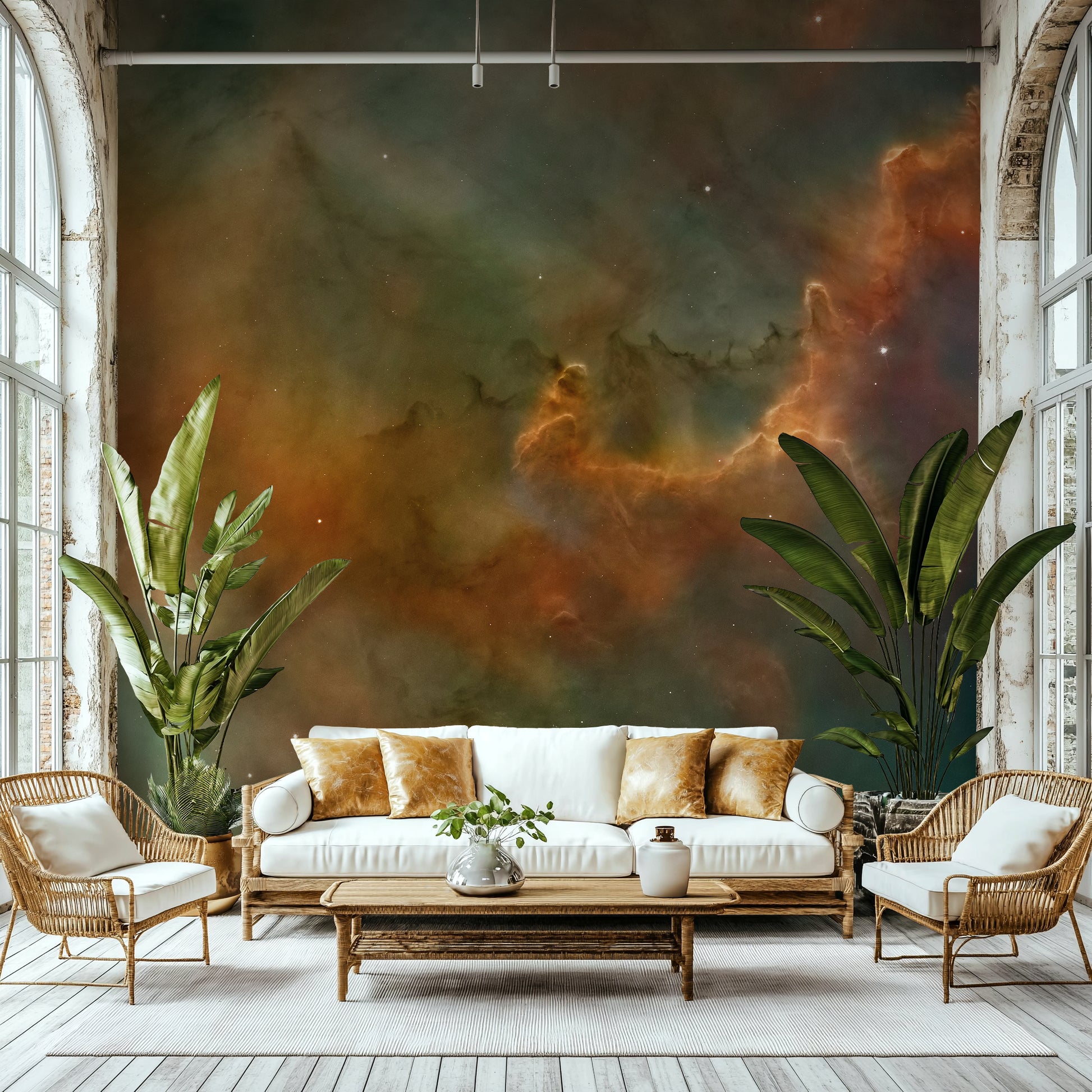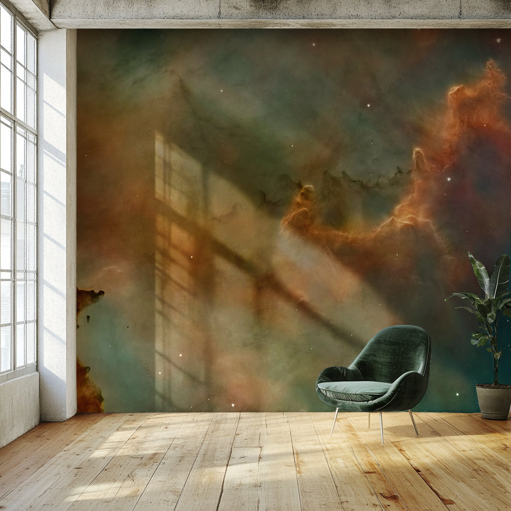 Waves of copper, teal, and fire swirl in the great unknown. Nebulon Drift is chaos turned to beauty—an abstract, swirling scene of stardust and fire. This nebula wallpaper electrifies a room with creative energy and mystery, like the background of a forgotten space saga.