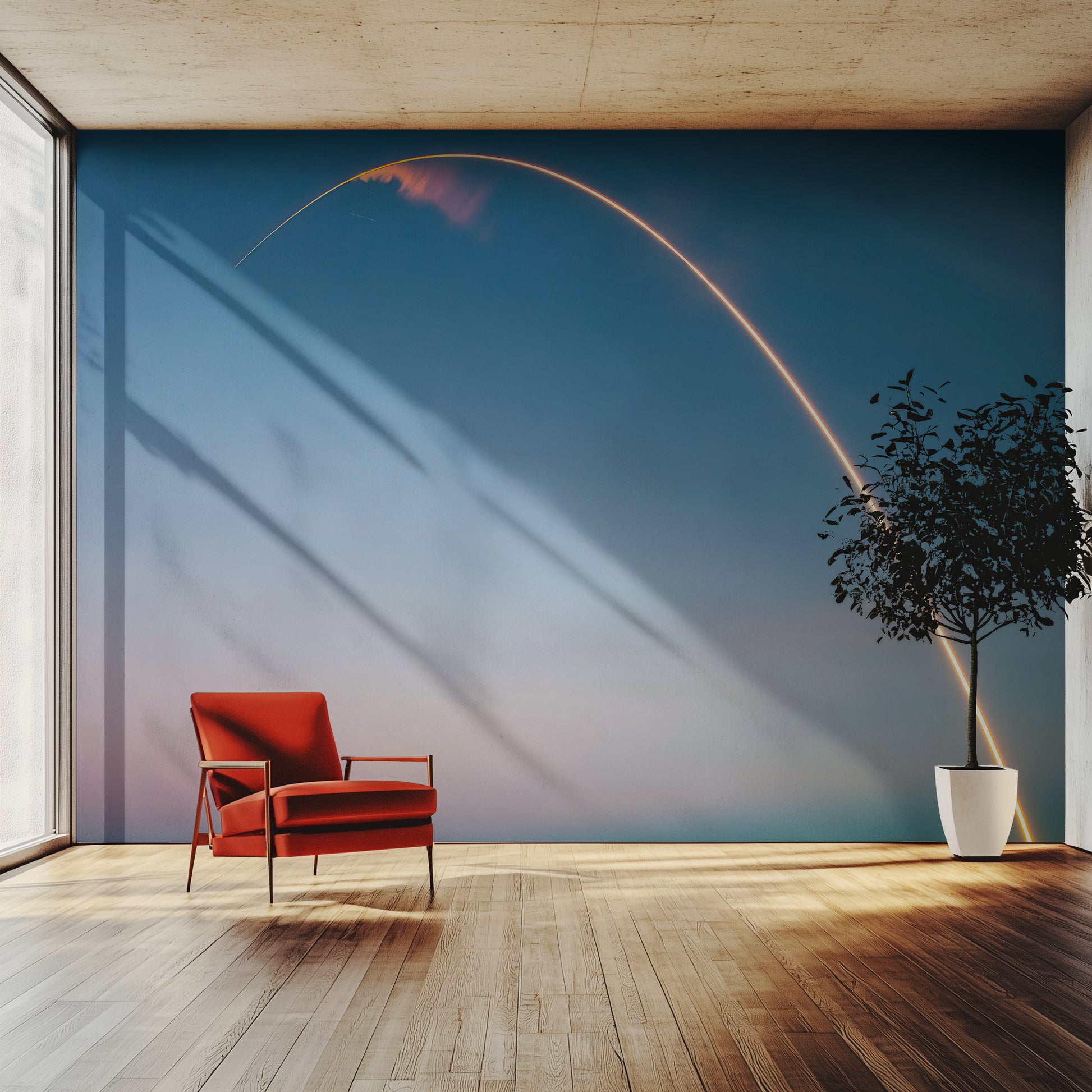 A glowing arc of fire streaks across a dusky sky—the afterimage of liftoff. Skyburner is all ambition, all momentum—the moment a rocket breaks gravity. This modern space wallpaper fills your space with motion and purpose, making it feel focused, futuristic, and full of energy.