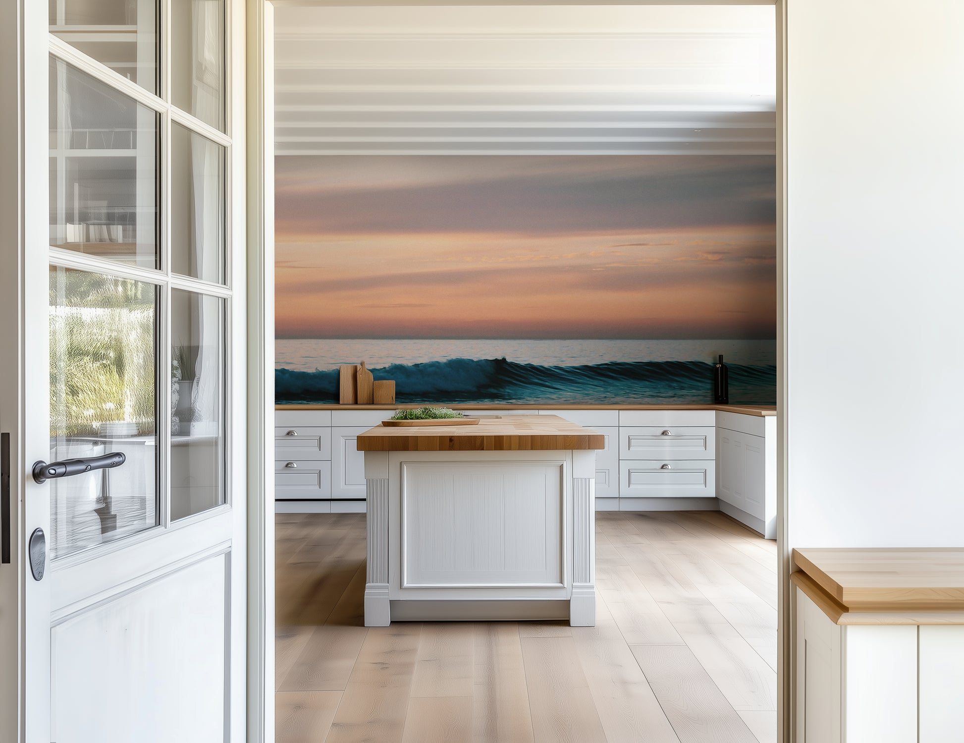 A curling wave hums across the surface, soft and slow. Tide Song is rhythm in water—graceful, grounded, and endlessly peaceful. This gently moving coastal wallpaper brings the ocean’s breath into everyday spaces.