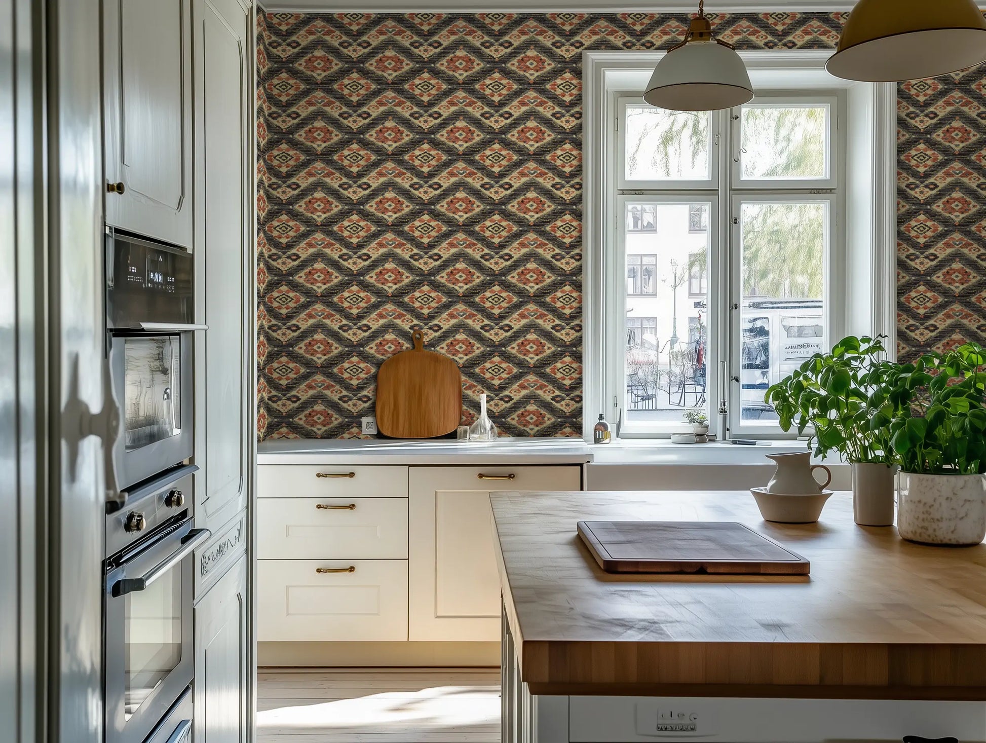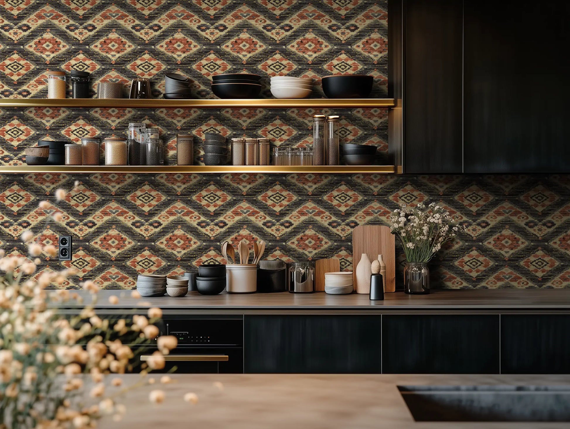 The rhythm of the dunes, the warmth of handwoven fabric, the timeless beauty of a pattern passed through generations—Desert Tapestry is a design rooted in nomadic craftsmanship and the shifting landscapes of the desert. Inspired by ancient kilim textiles, Berber rugs, and the earthy hues of sunlit sand, this wallpaper weaves ochre, deep charcoal, and warm ivory into a bold, geometric composition.