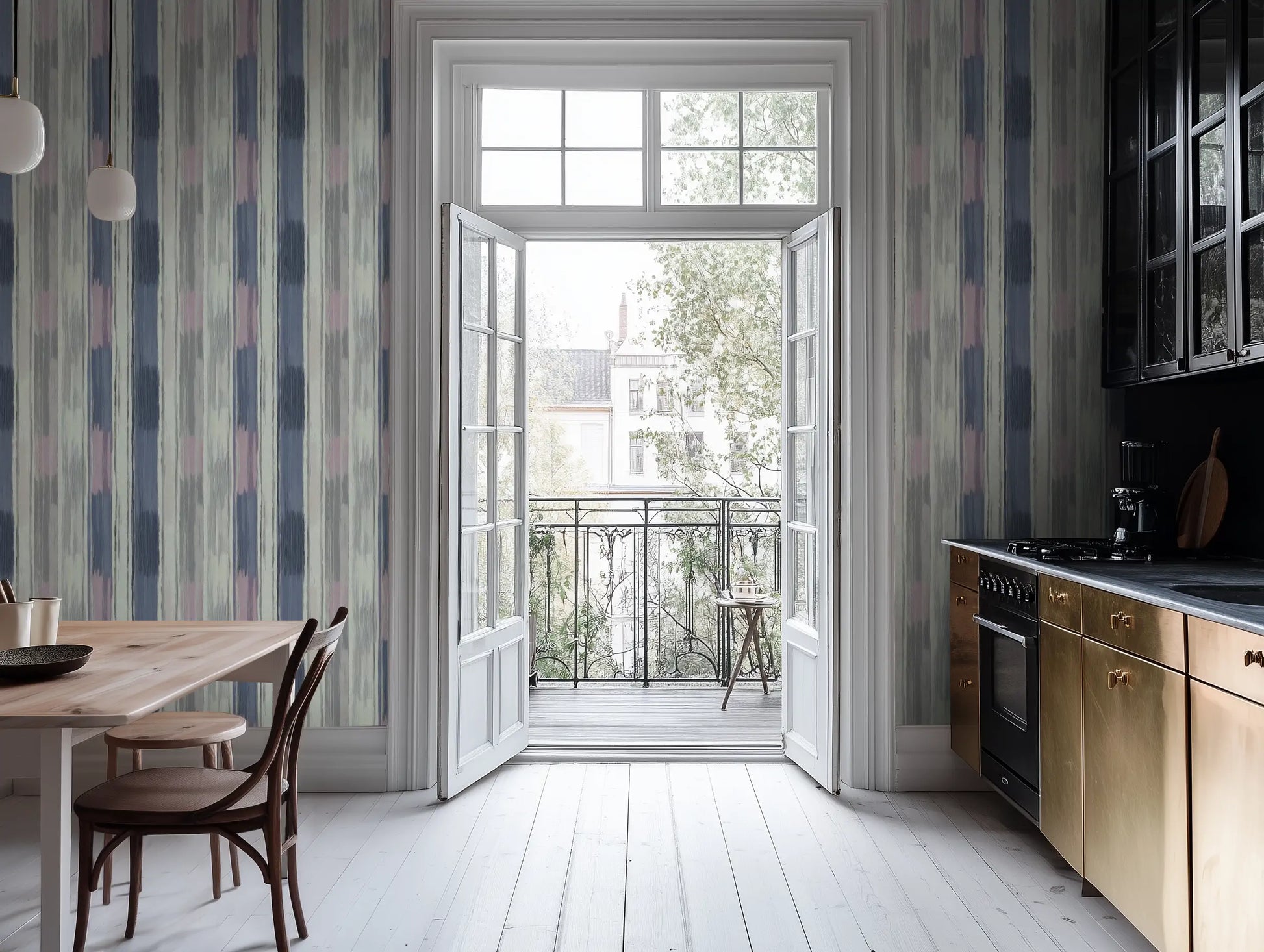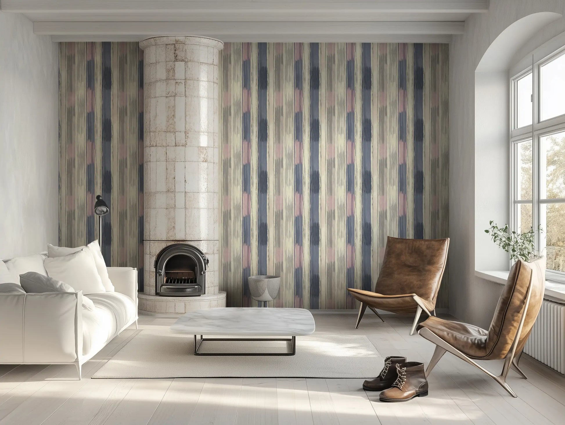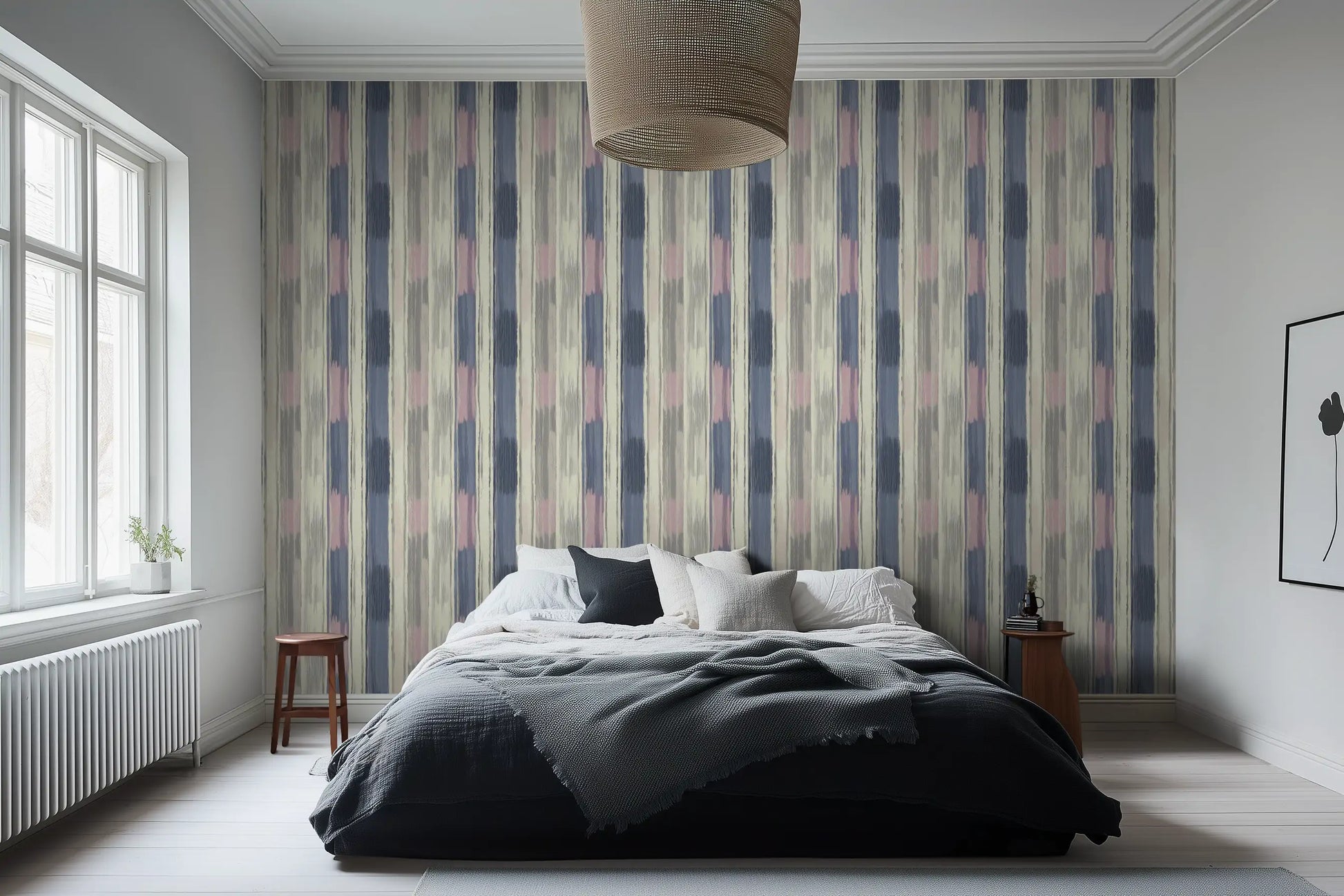 Shadows stretch, winds whisper, and the last light of the day lingers—Nightfall Strata translates this fleeting moment into a layered, painterly stripe pattern, where silver-blue, lavender, and deep slate streak across the wall like the last light over shifting sands.