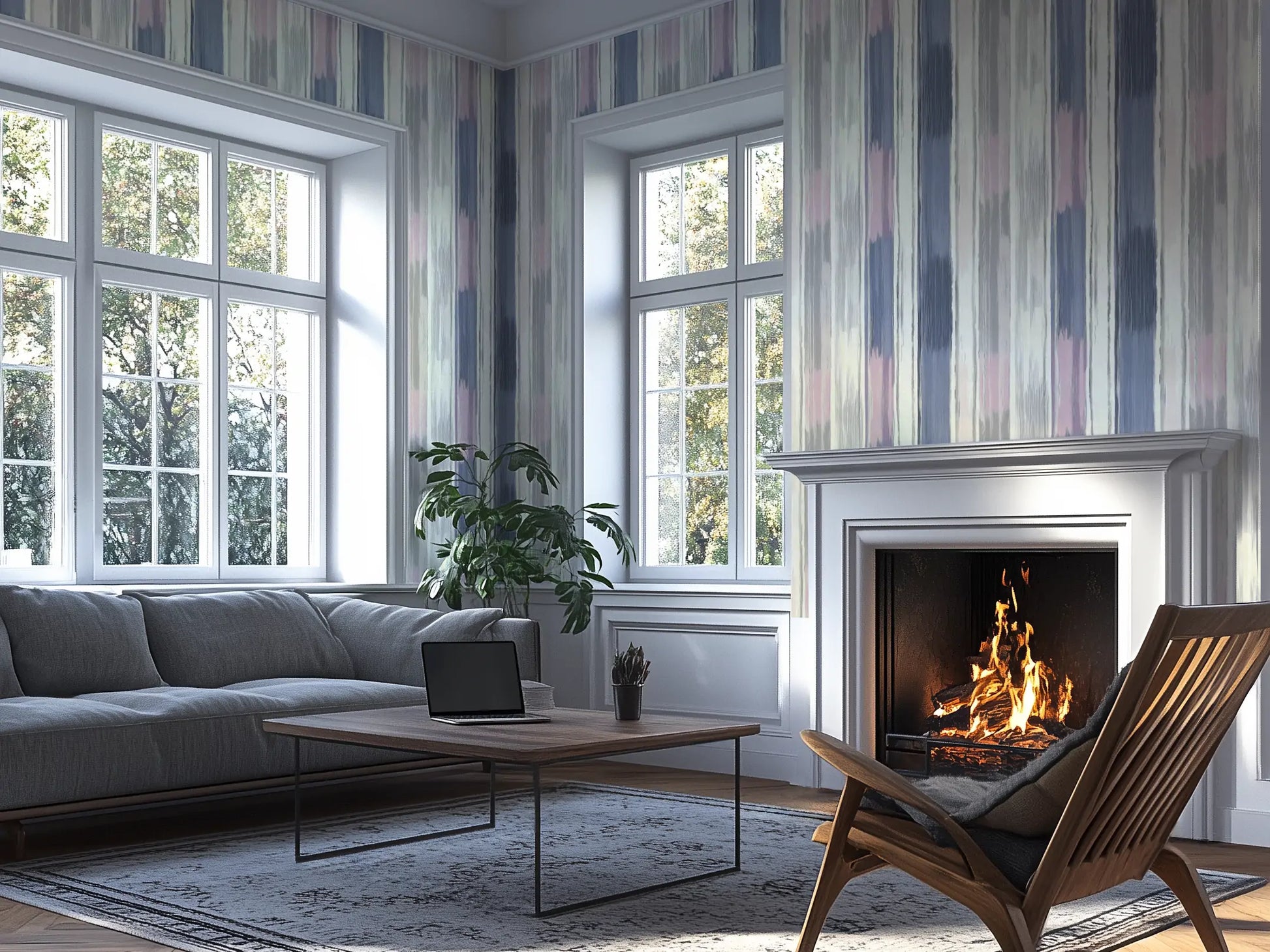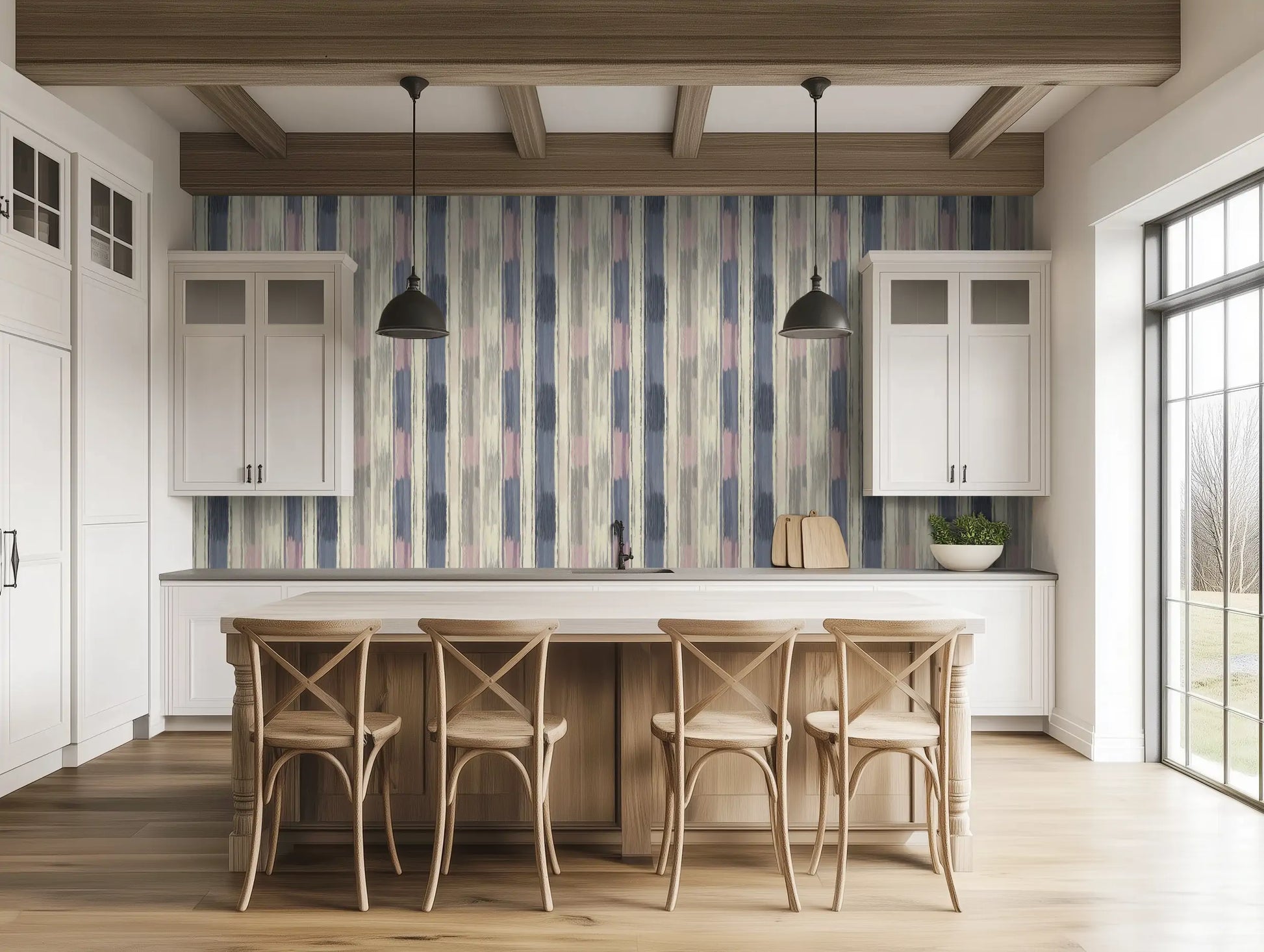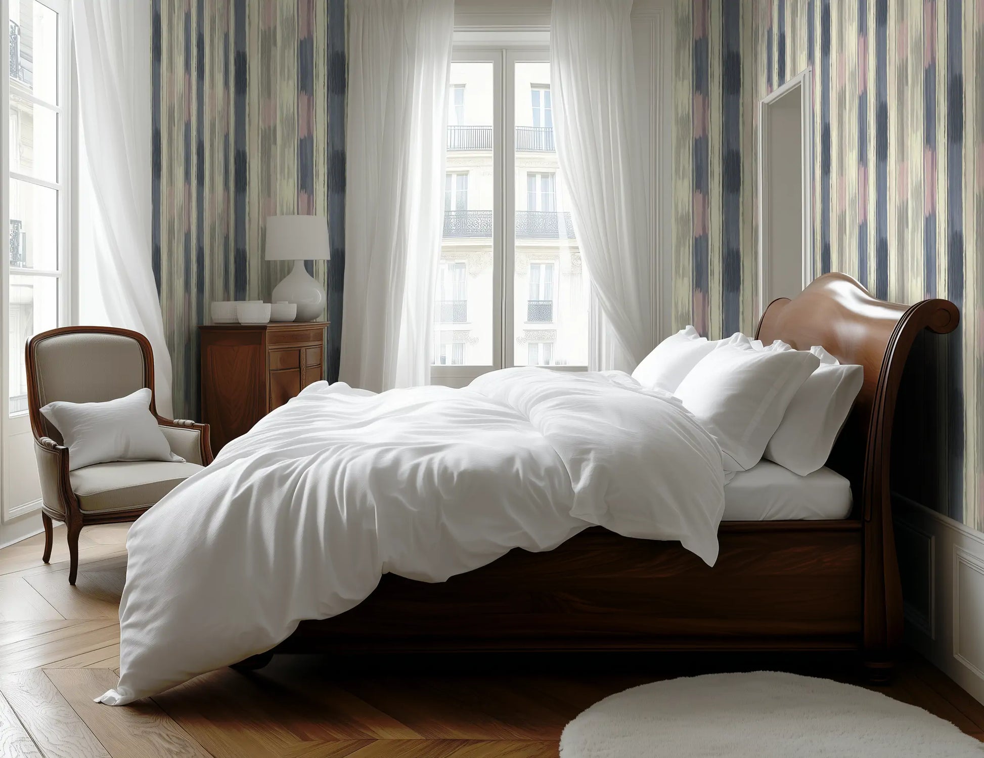 Shadows stretch, winds whisper, and the last light of the day lingers—Nightfall Strata translates this fleeting moment into a layered, painterly stripe pattern, where silver-blue, lavender, and deep slate streak across the wall like the last light over shifting sands.