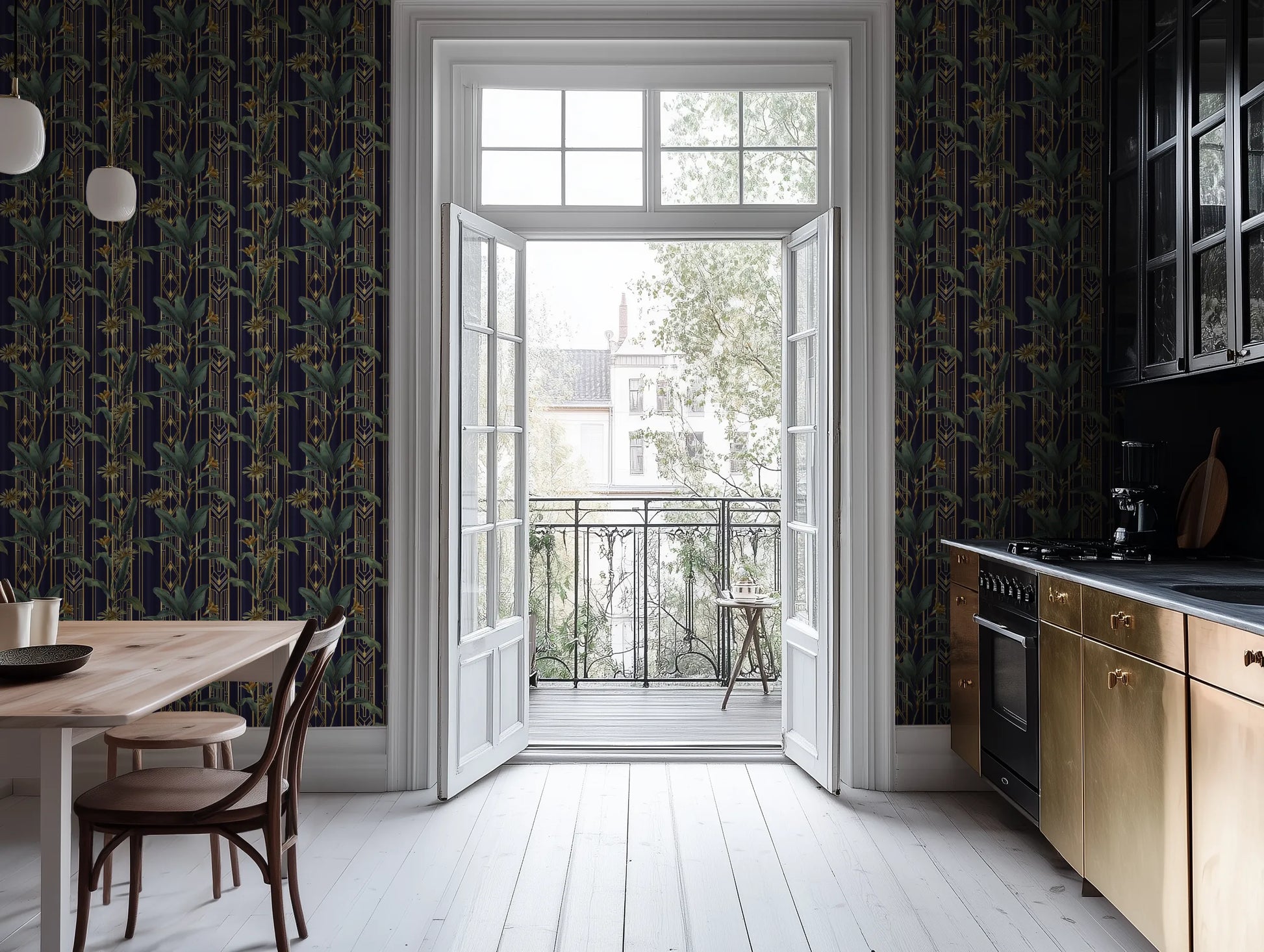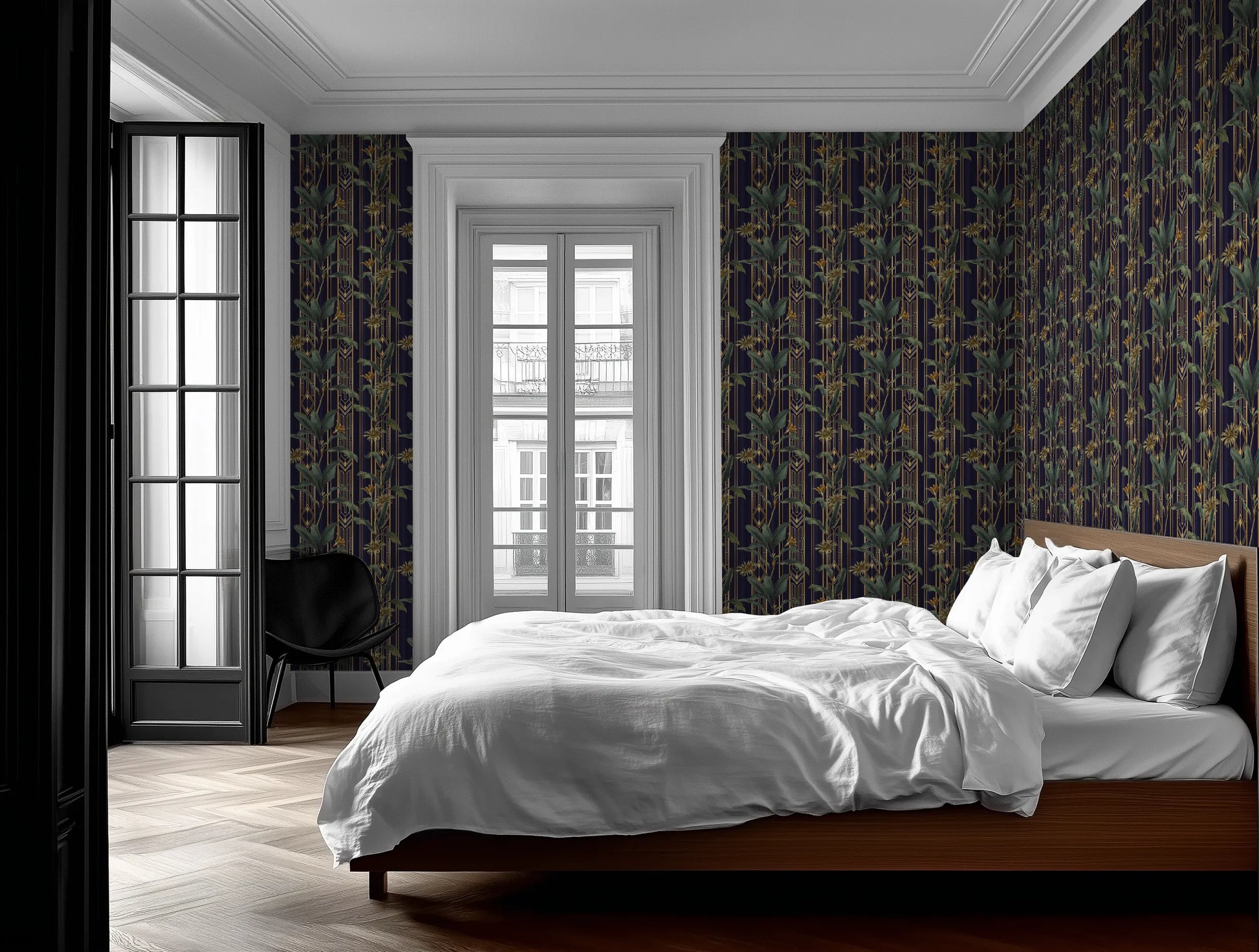 Rich in contrast and depth, this wallpaper transforms any bedroom, dining room, living space, or lounge into an atmosphere of moody elegance and old-world mystique. The structured Deco framework plays against the organic sprawl of the botanicals, creating a perfect balance between sophistication and wild allure.
