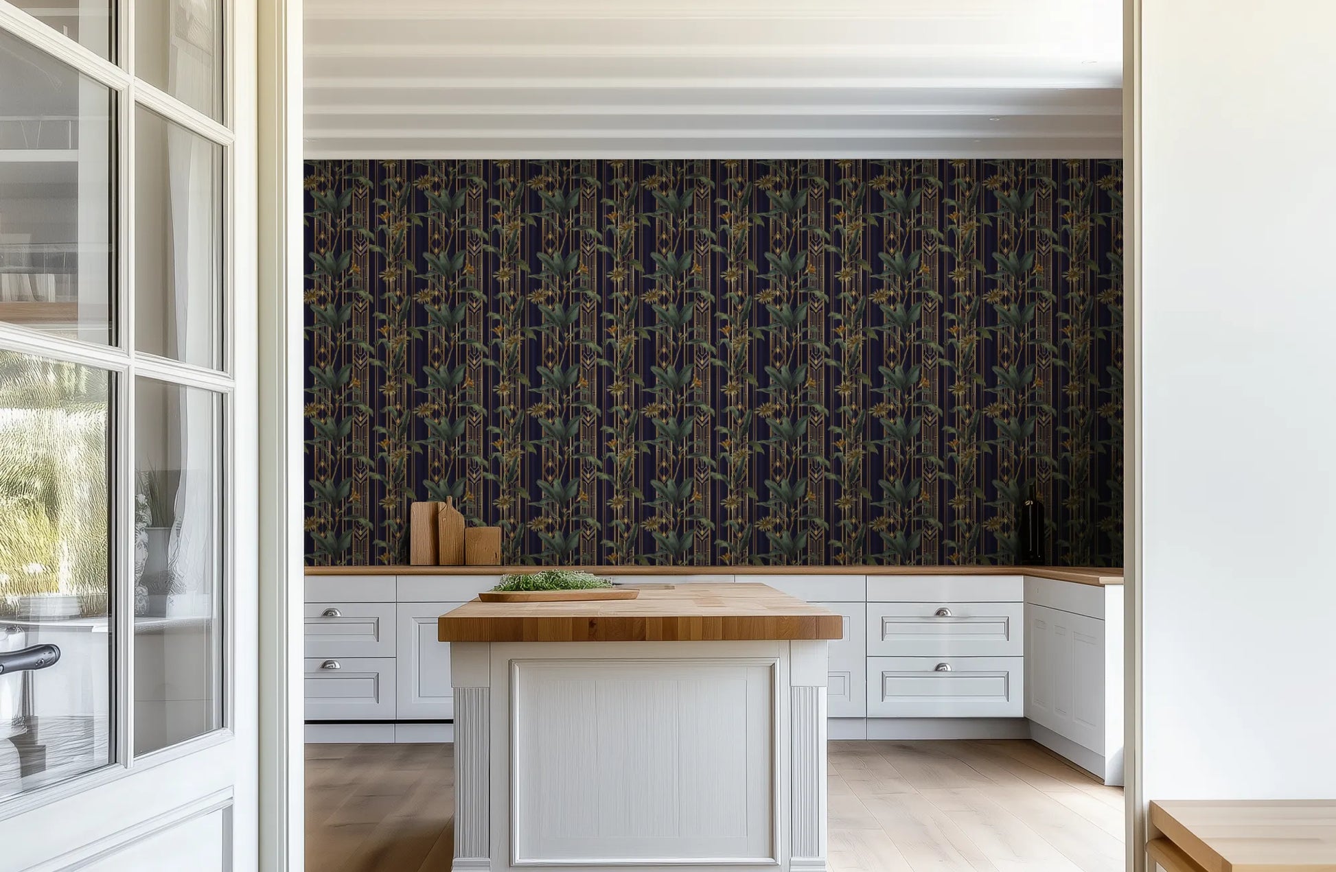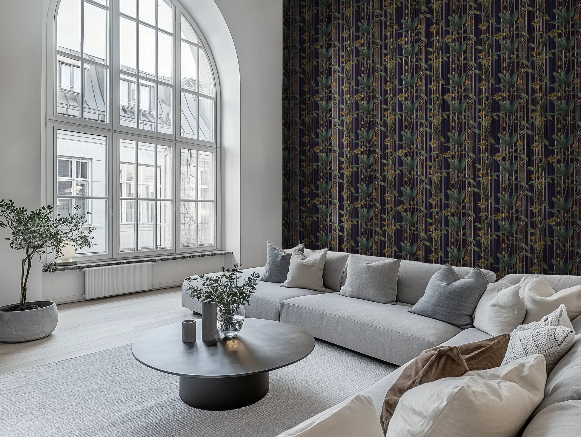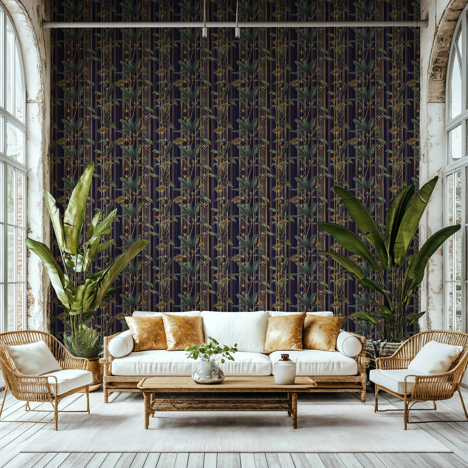 Step into a world where the jungle meets the jazz age—Midnight Tapestry is a luxurious collision of gilded Art Deco geometry and untamed botanical beauty, set against a deep, midnight blue backdrop. Towering tropical foliage and golden wild blooms weave through sleek architectural lines, evoking the glamour of a hidden garden in the heart of a grand Gatsby-era ballroom.