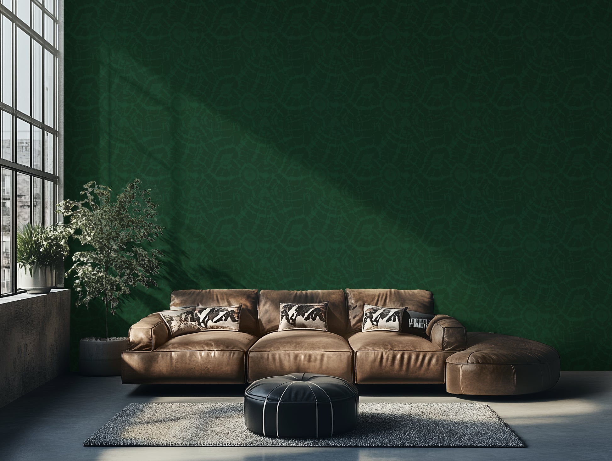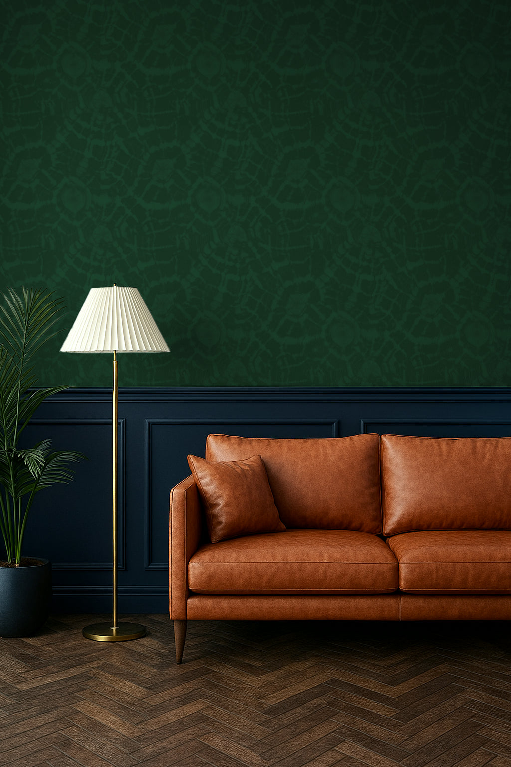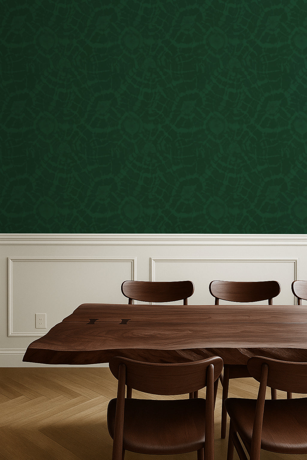 The dark green tones bring moody sophistication while the tortoise-shell geometry adds understated movement. Perfect for statement walls in dining rooms, cozy bedrooms, or study spaces, it layers beautifully with brass, leather, and warm neutrals.