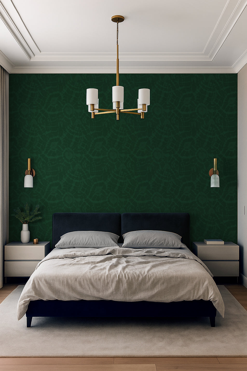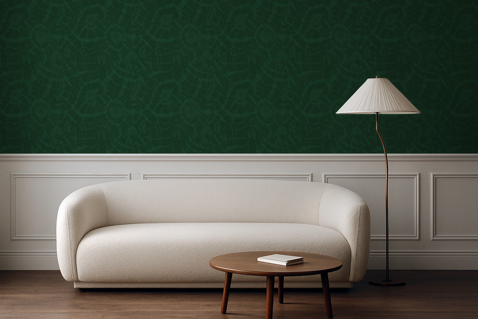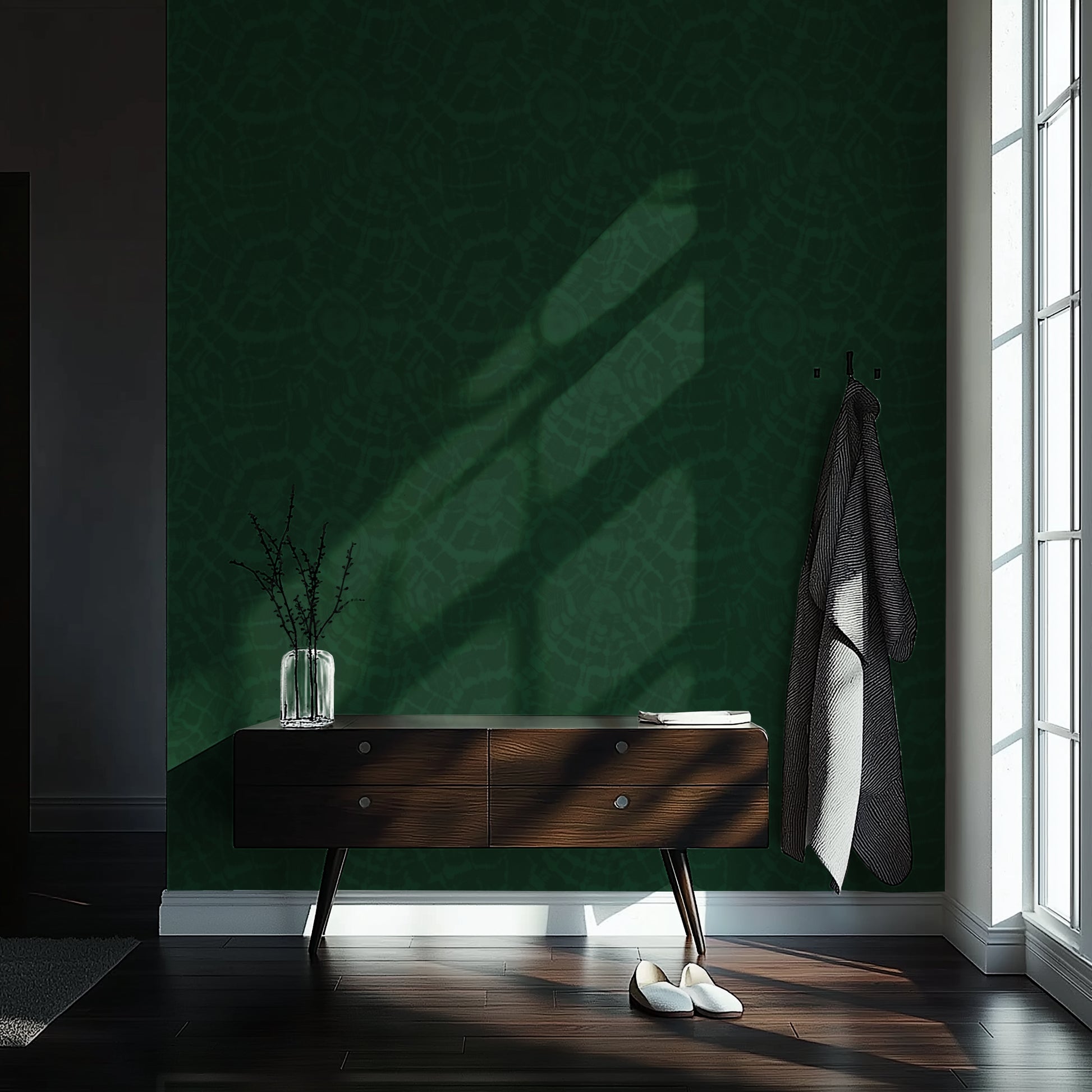The dark green tones bring moody sophistication while the tortoise-shell geometry adds understated movement. Perfect for statement walls in dining rooms, cozy bedrooms, or study spaces, it layers beautifully with brass, leather, and warm neutrals.