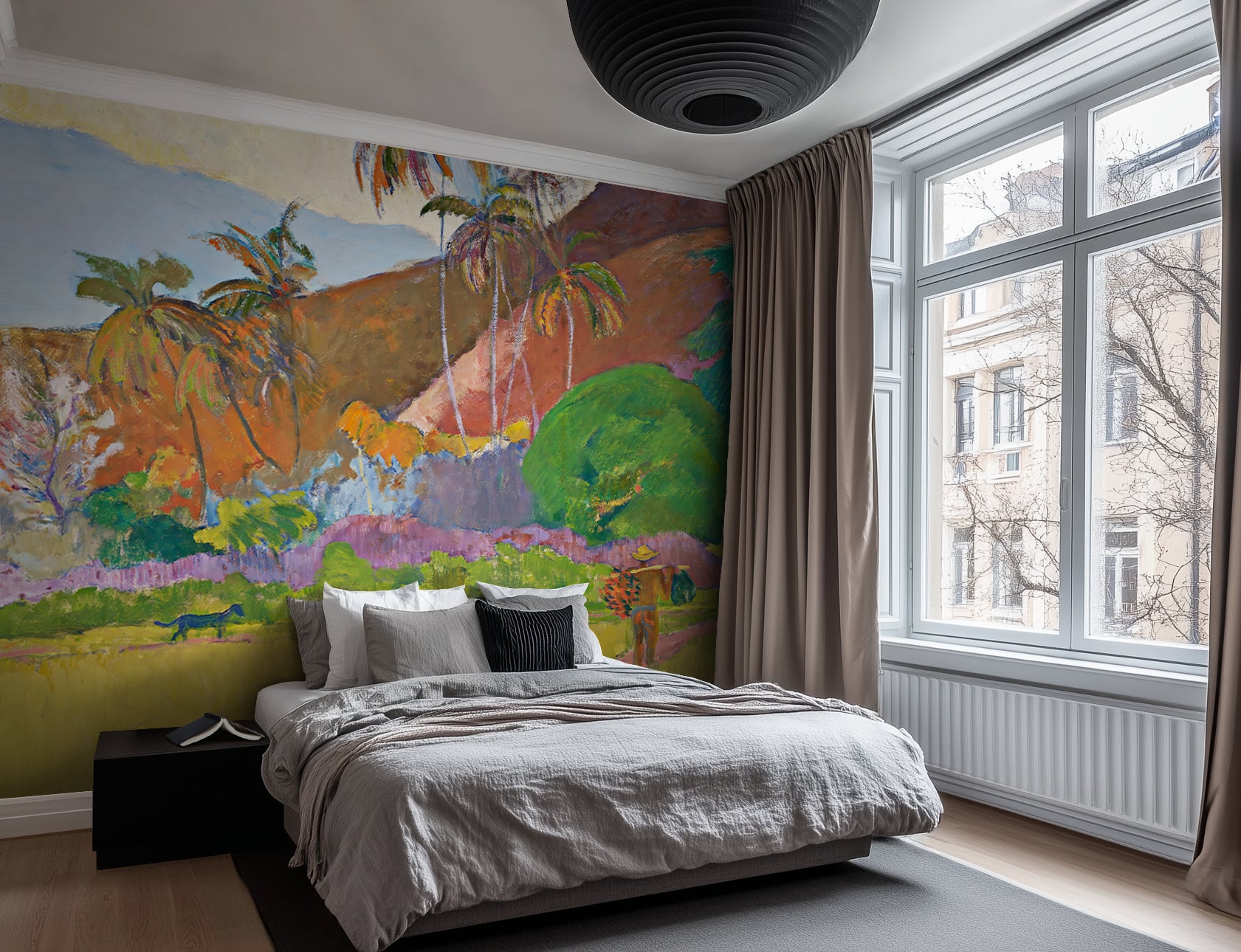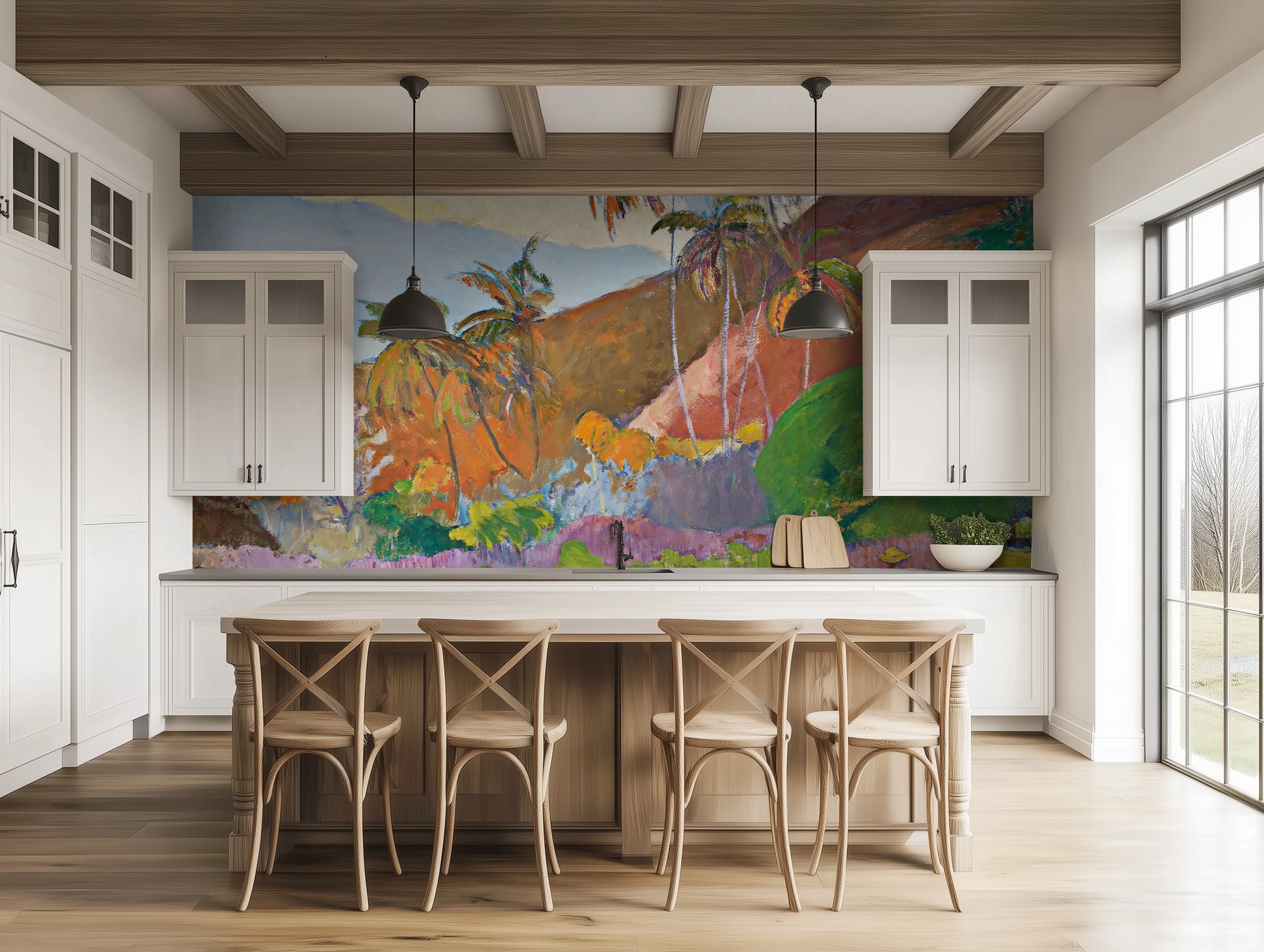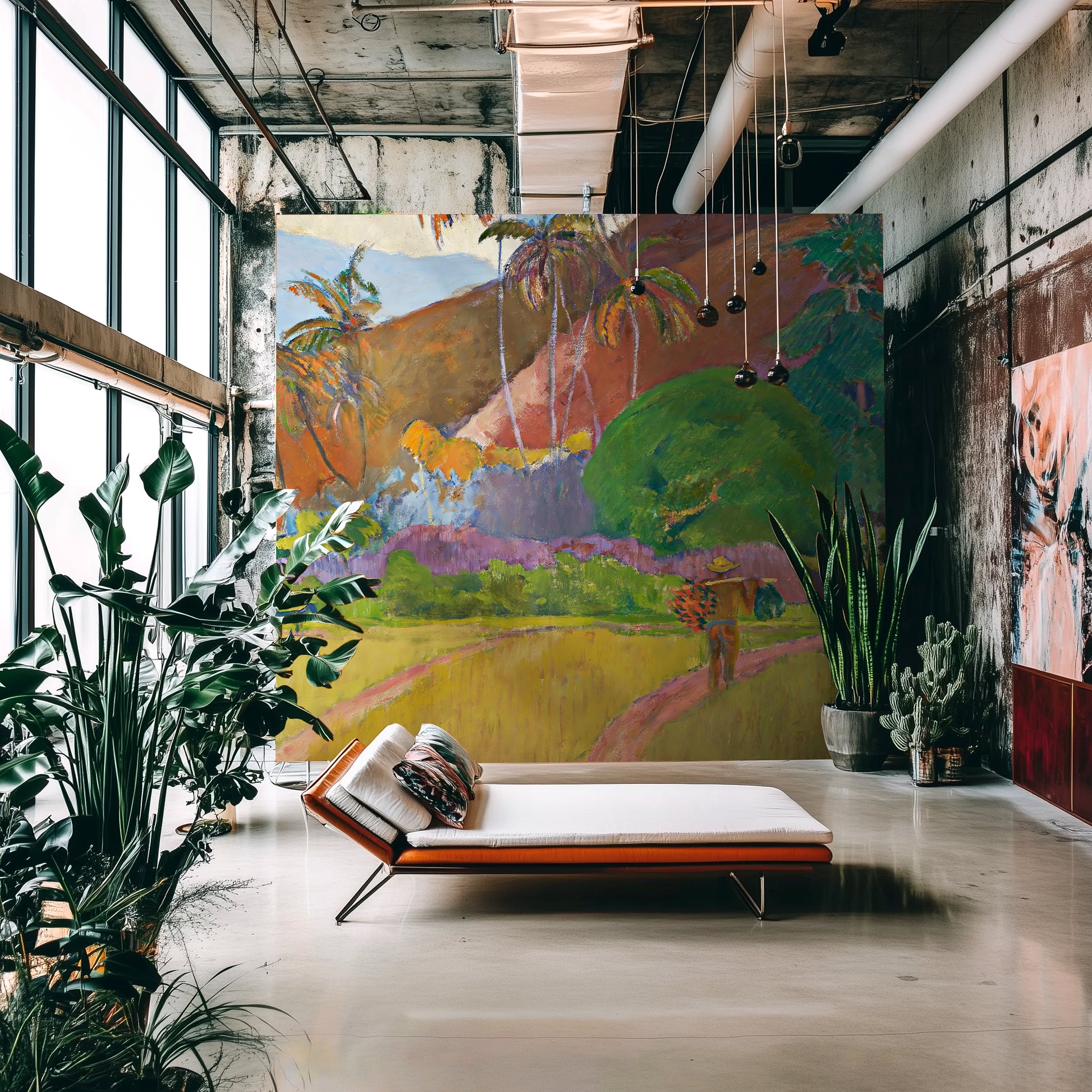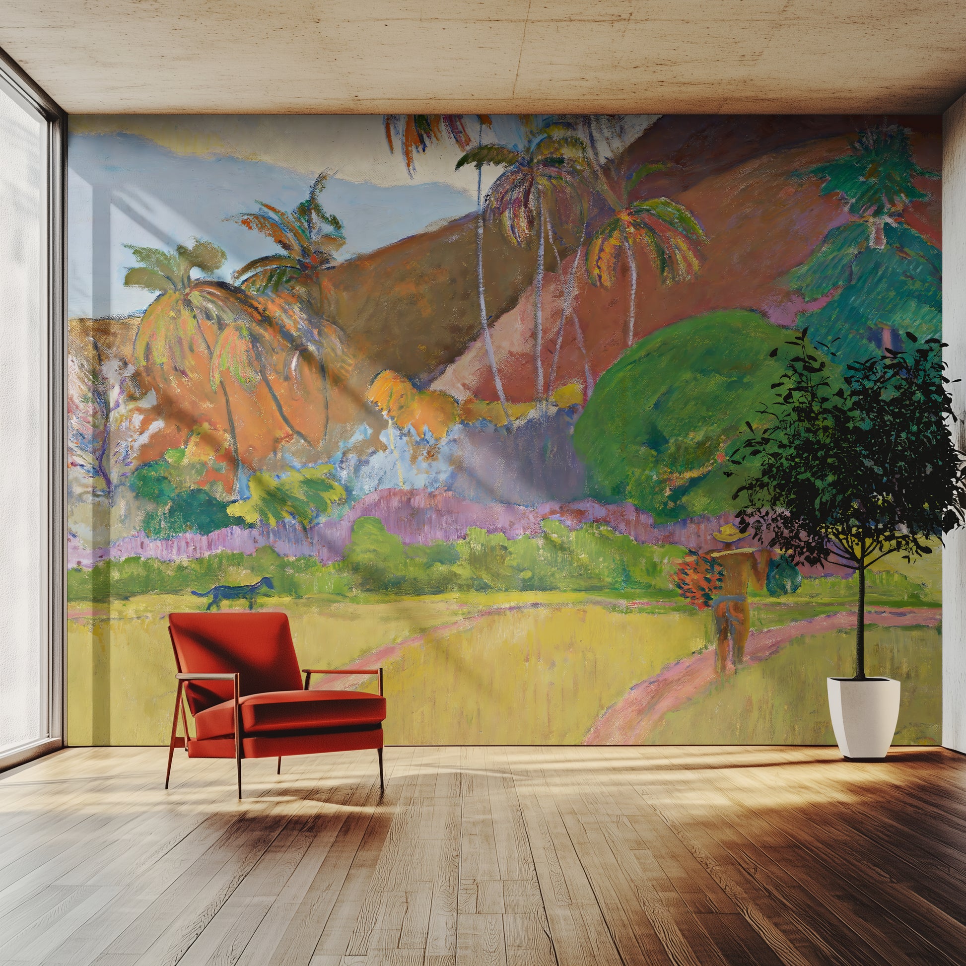 This wallpaper is based on the original painting by Paul Gauguin, now in the public domain. It has been respectfully upscaled and adapted for large-scale interior use under a public domain license.