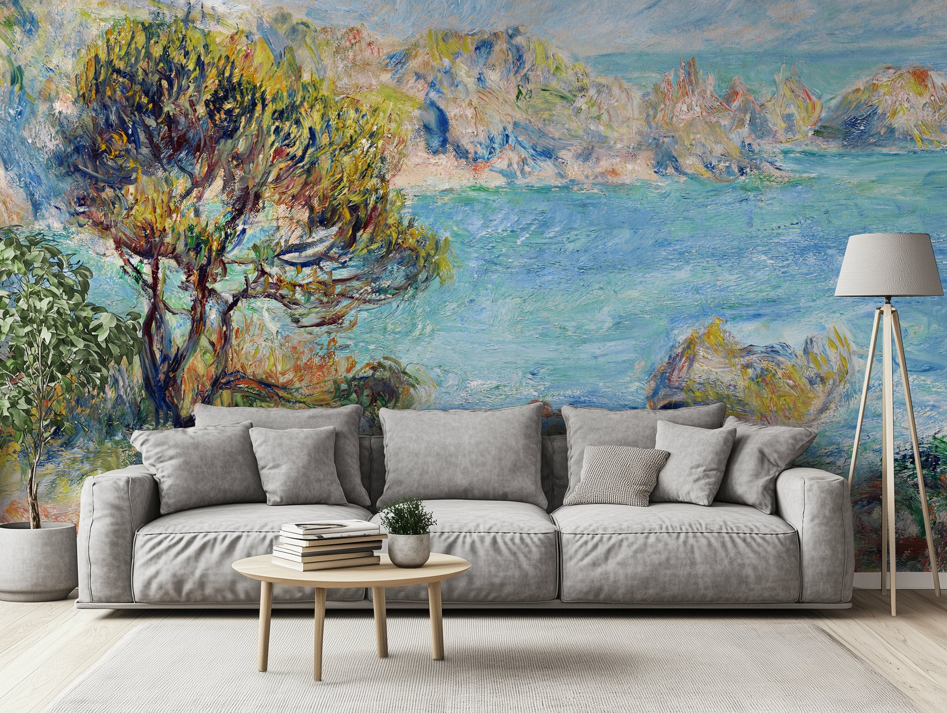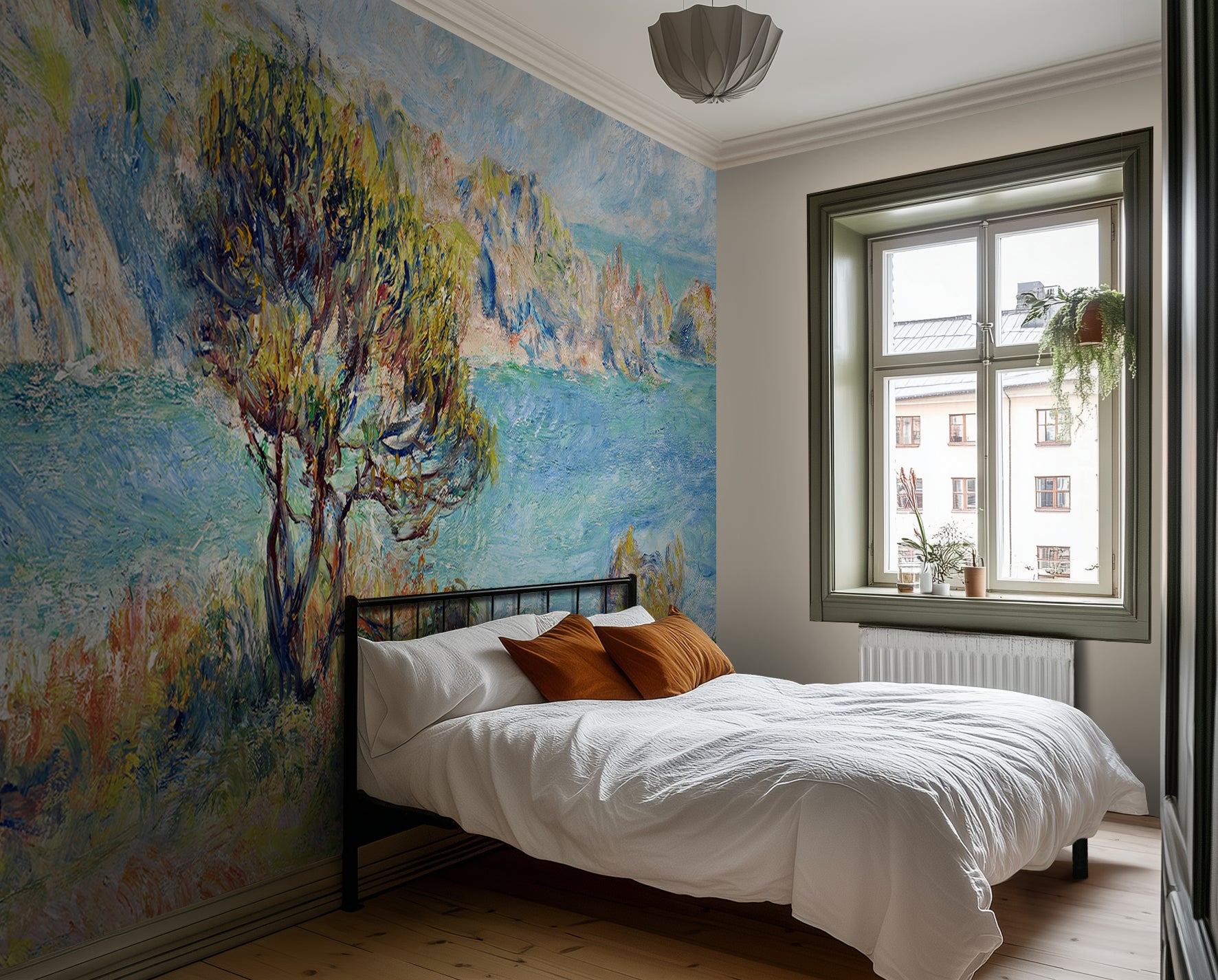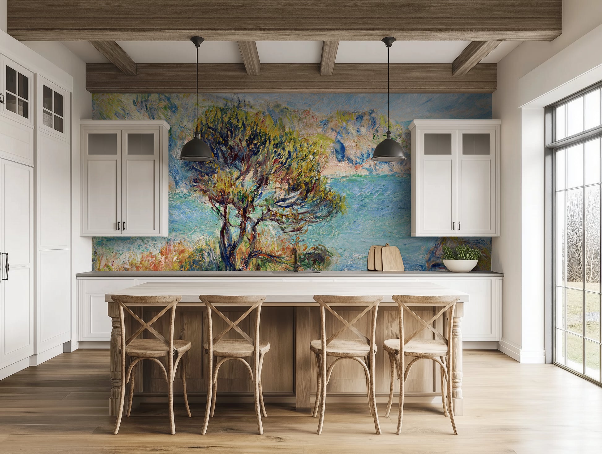 As wallpaper, this mural brings the outdoors in—expansive, windswept, and alive with color. Dusty greens, peach-tinted cliffs, and soft ocean blues create a natural palette that feels both romantic and grounded. It’s a landscape, yes, but one that feels like a memory—blurry at the edges and all the more beautiful for it.