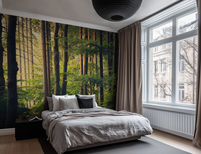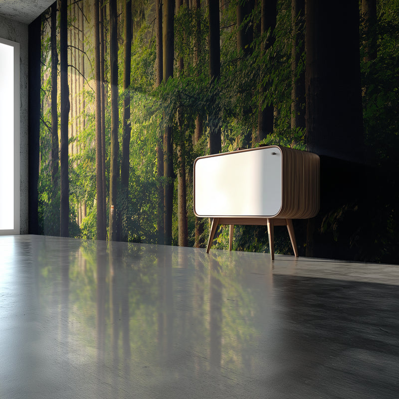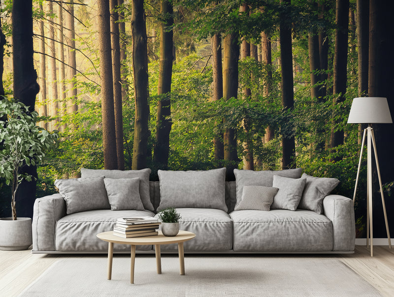 Soft sunlight filters through a dense canopy, dappling the forest floor in gold. Woodwake feels like the moment everything begins to stir—a visual exhale after a long sleep. This sunlit forest wallpaper warms your space with quiet vitality, making it feel rooted, natural, and ready for new beginnings.