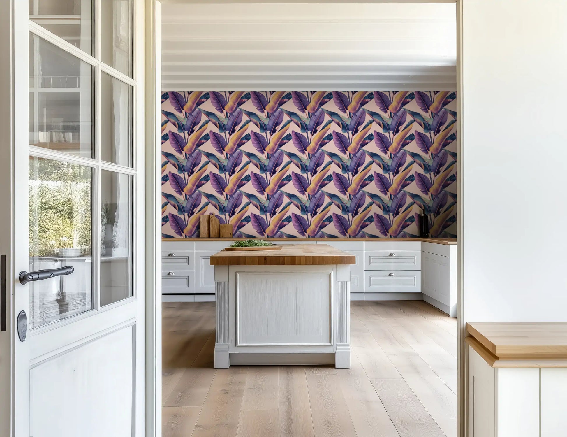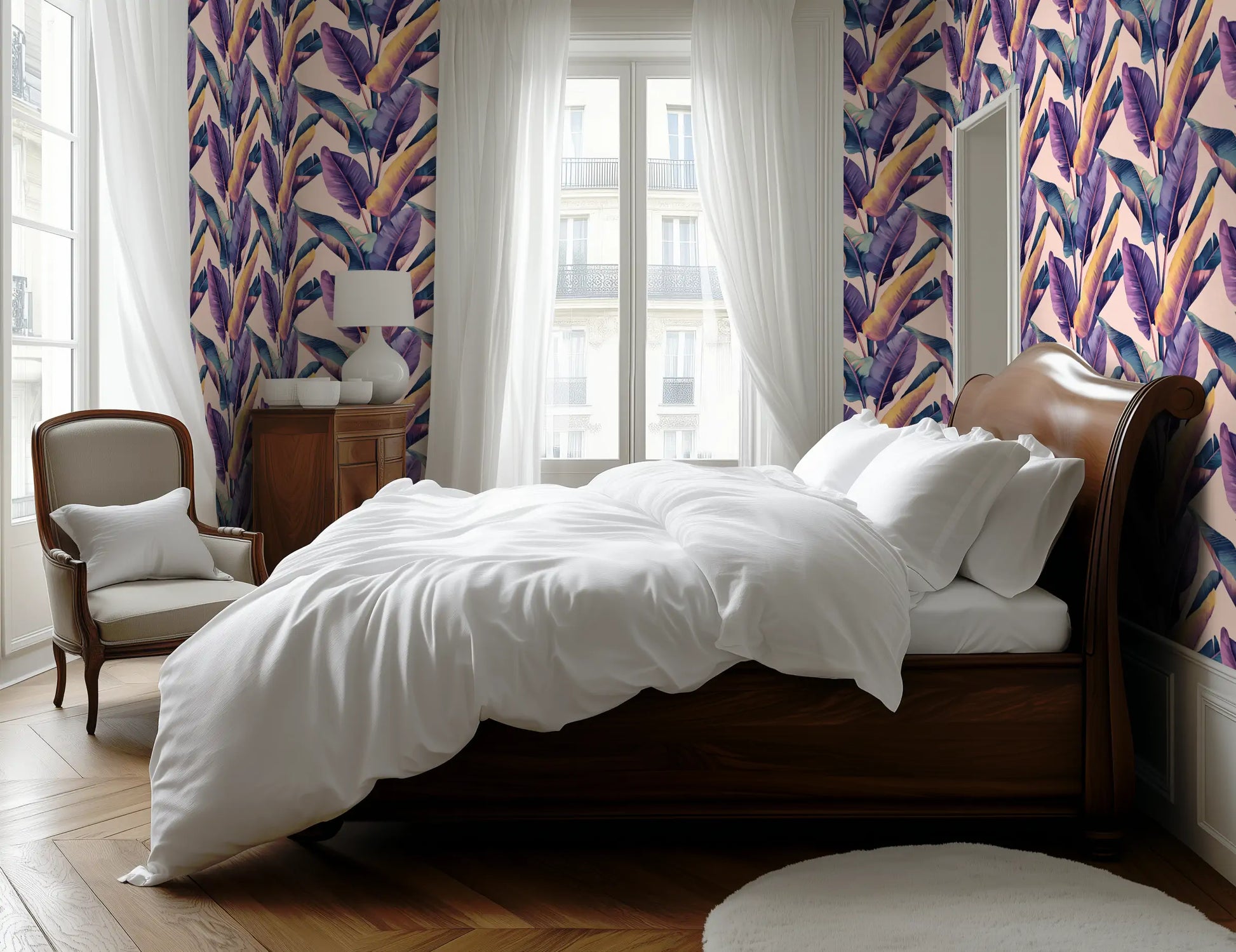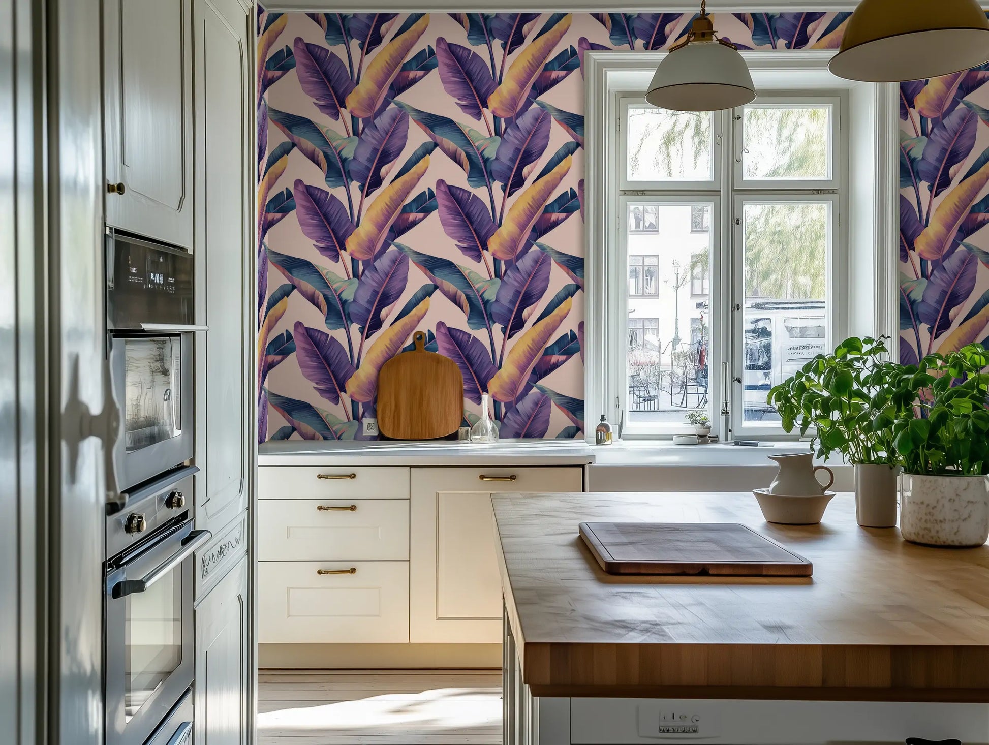 Tropical, but make it nightlife. Disco Palms is Miami heat, neon glow, and endless summer energy wrapped into one bold, botanical statement. Lush banana leaves pulse in electric shades of violet, indigo, and golden sunset, set against a soft blush backdrop that feels like the last light of a perfect beach day. It’s tropical escapism with a retro-glam twist, channeling the golden age of South Beach—where Art Deco meets late-night discos under the palms.