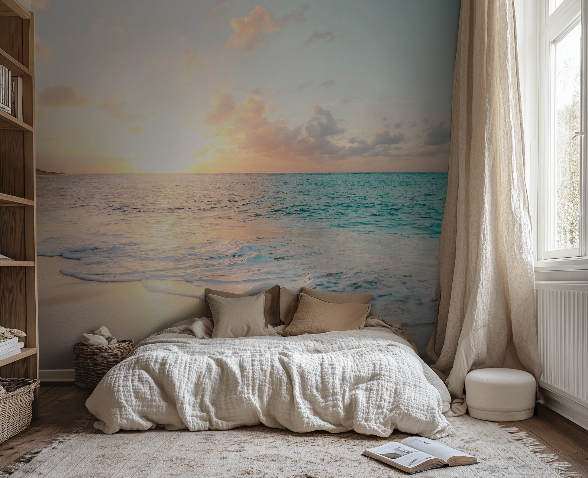 Waves gently pull across soft sand beneath a glowing sky of seafoam and blush. Sundrift is calm made visual—a beach that feels like a lullaby. This pastel coastal wallpaper brings peace into the room, like waking up slow with nowhere to be.