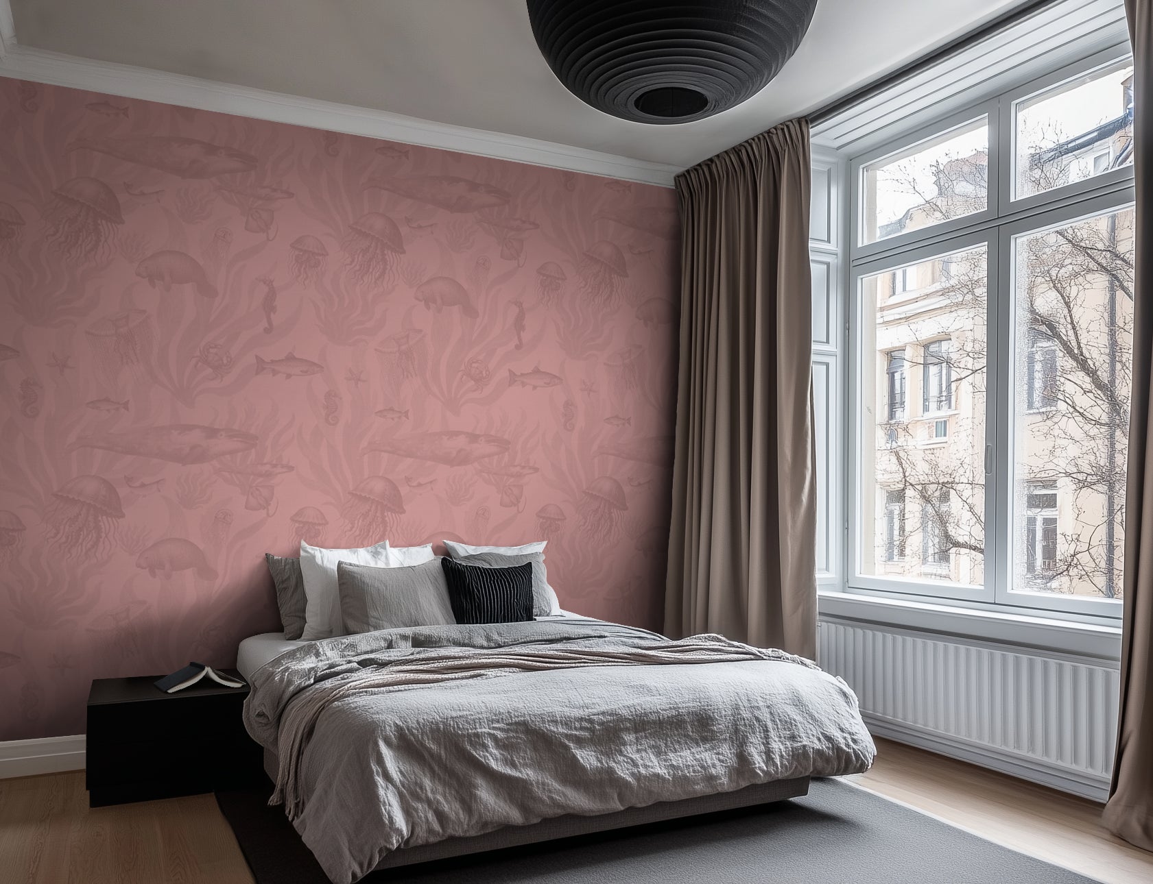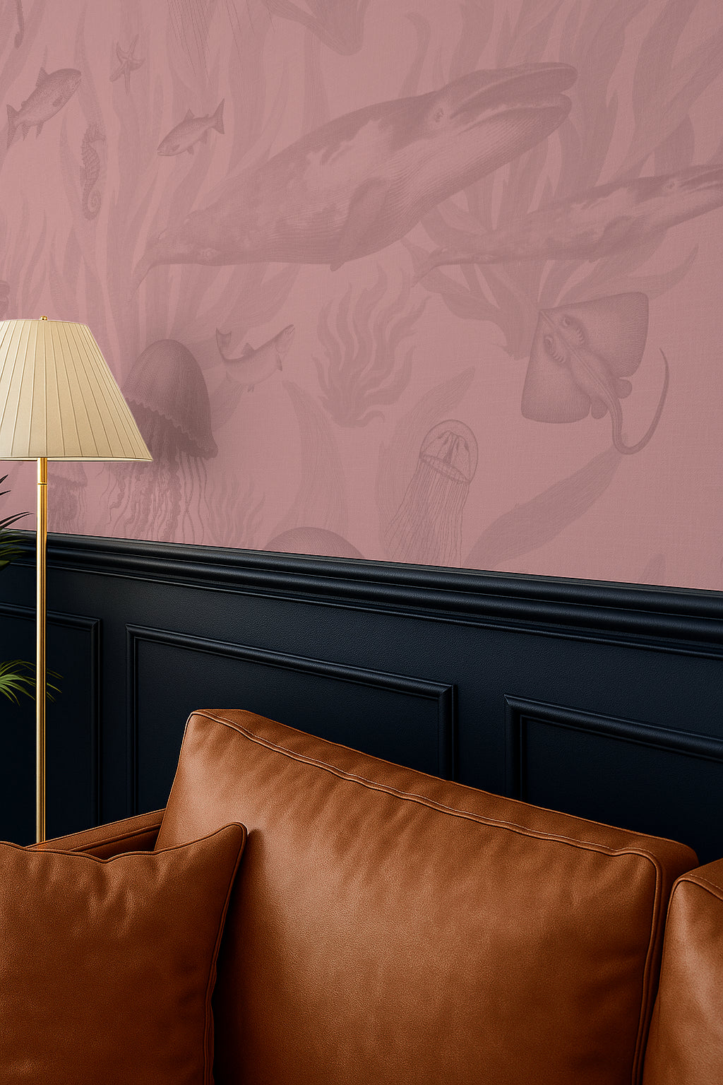 Marine motifs and soft pastels are trending, especially in maximalist-meets-coastal interiors. Dusty Rose on Shell White blends this aesthetic into a warm, sophisticated marine mural.