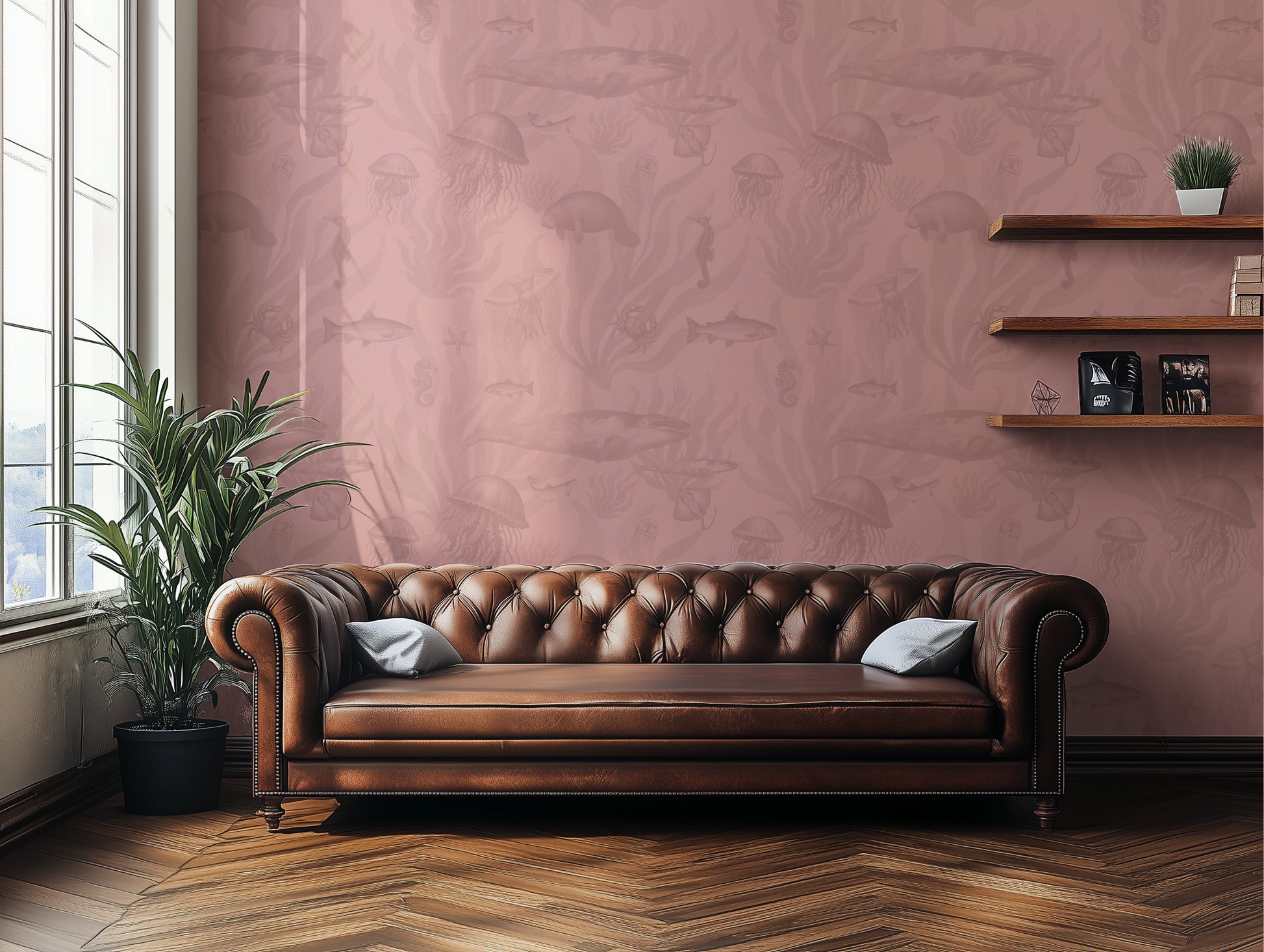 Tidepool Reverie – Dusty Rose on Shell White softens the undersea world into a delicate palette — jellyfish, whales, and seahorses drifting across pale shell white in muted rose tones. Gentle and dreamlike, it brings an unexpected warmth to marine-inspired interiors.