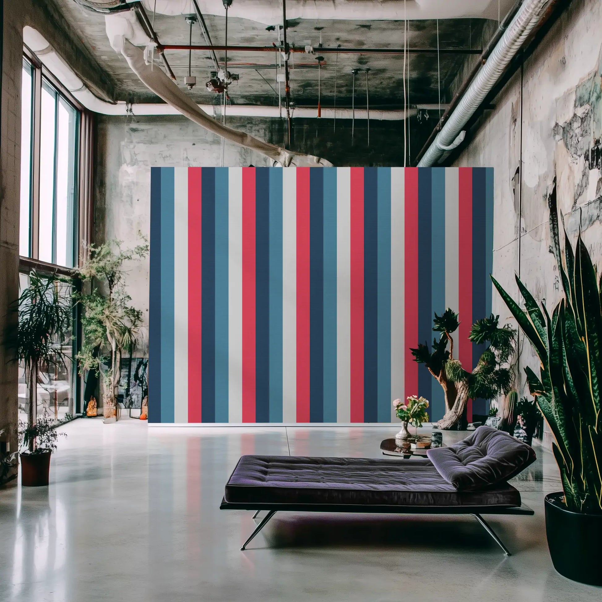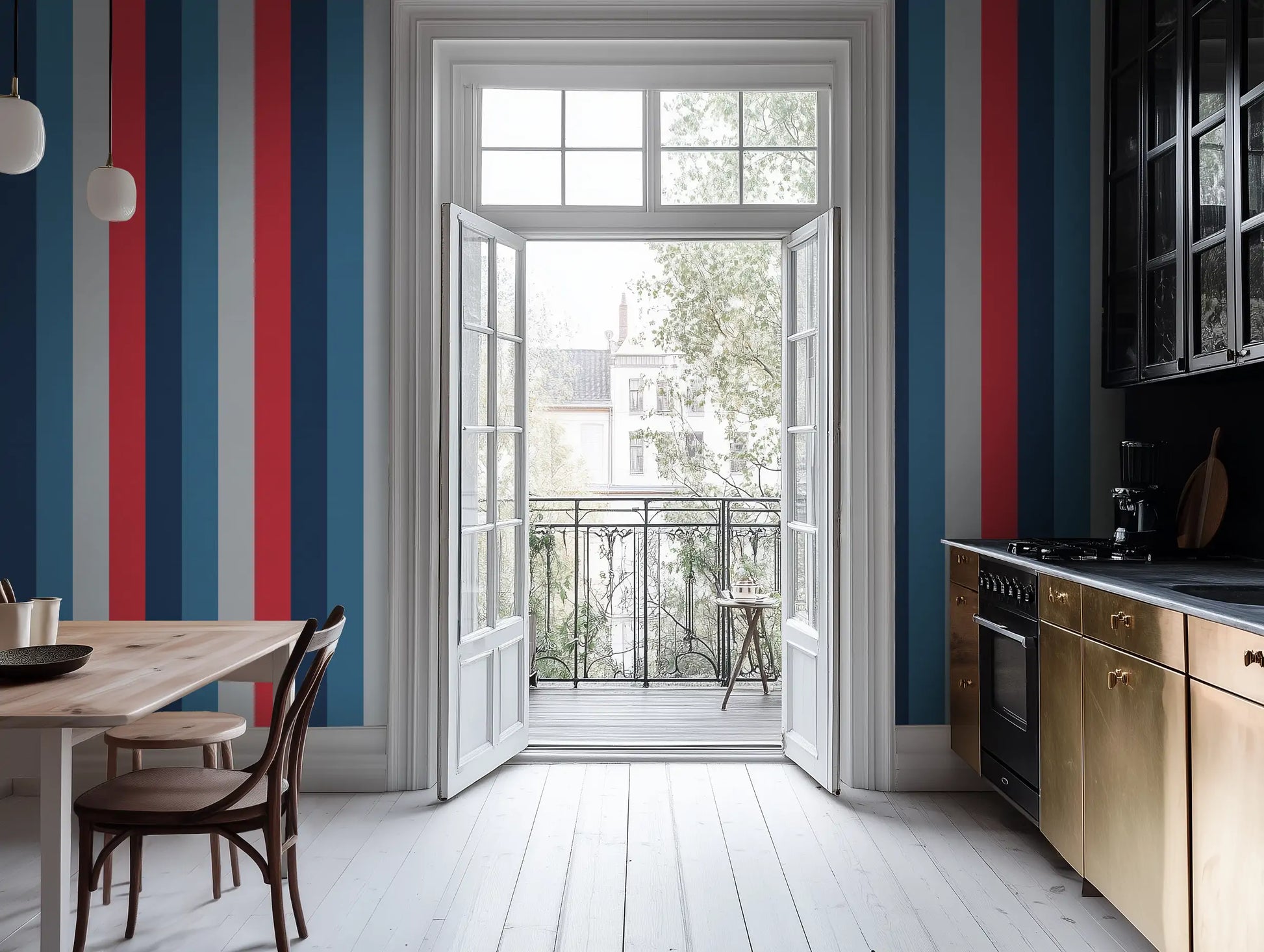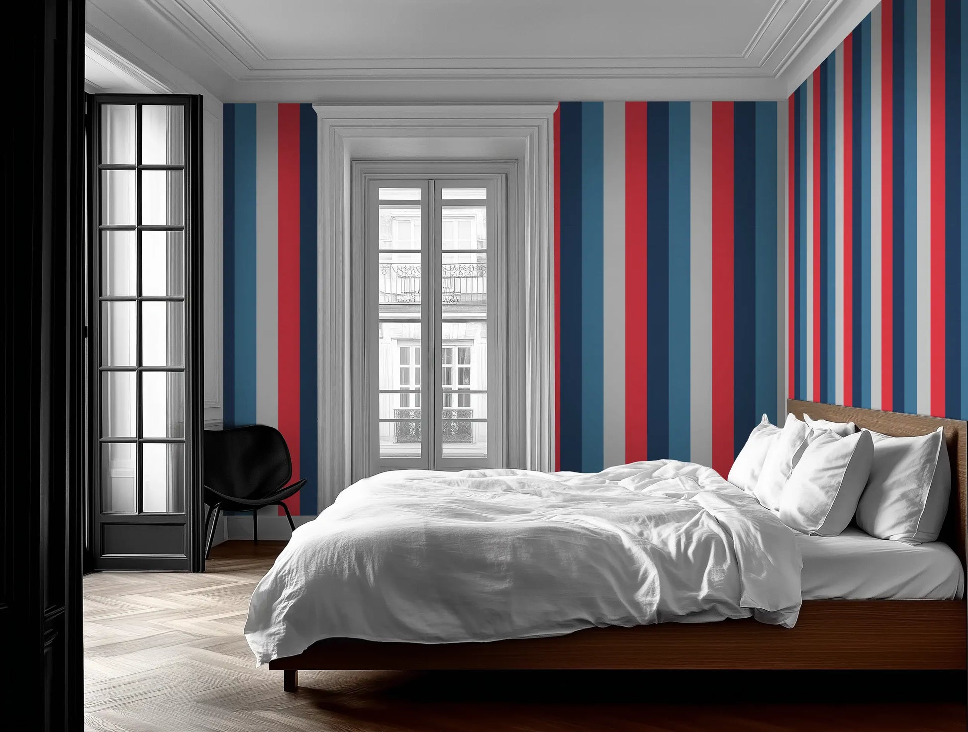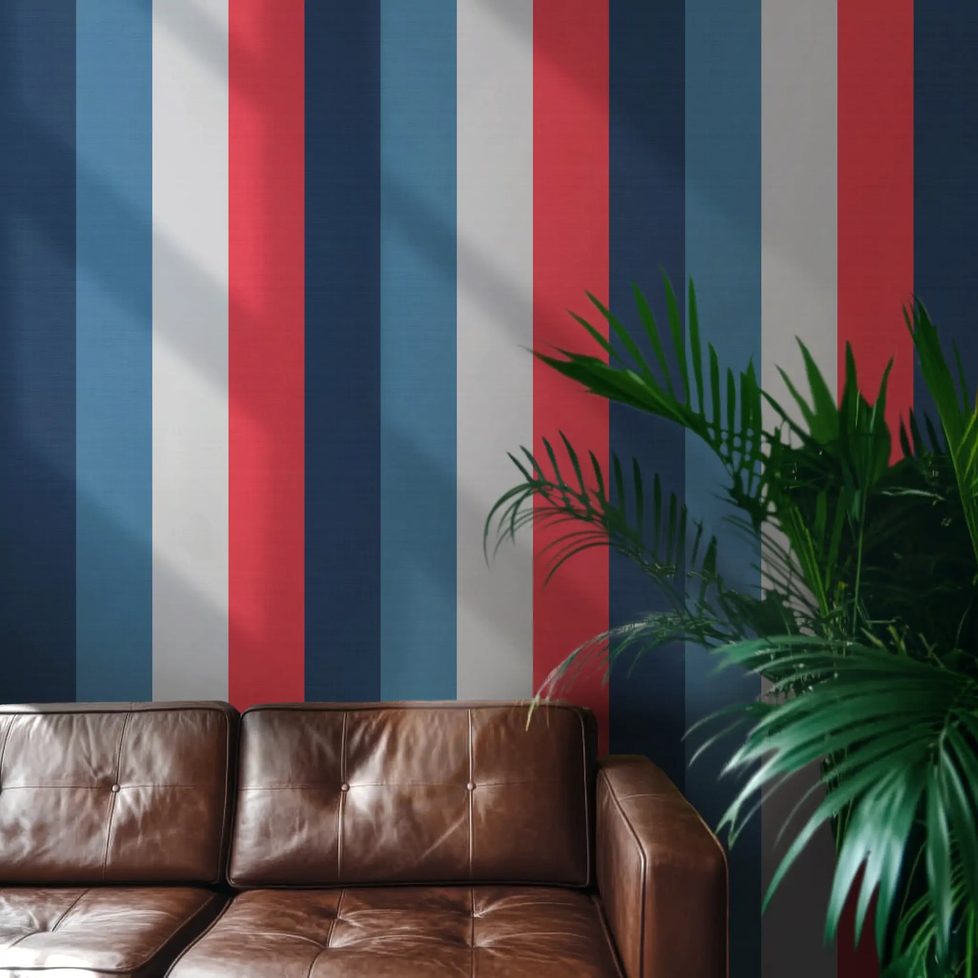 London is sharp tailoring, foggy streets, and deep heritage wrapped in modern cool. We pulled from its navy blue skies, rich red buses, and soft grey stonework to create a structured, refined striped wallpaper mural that’s as timeless as the city itself.