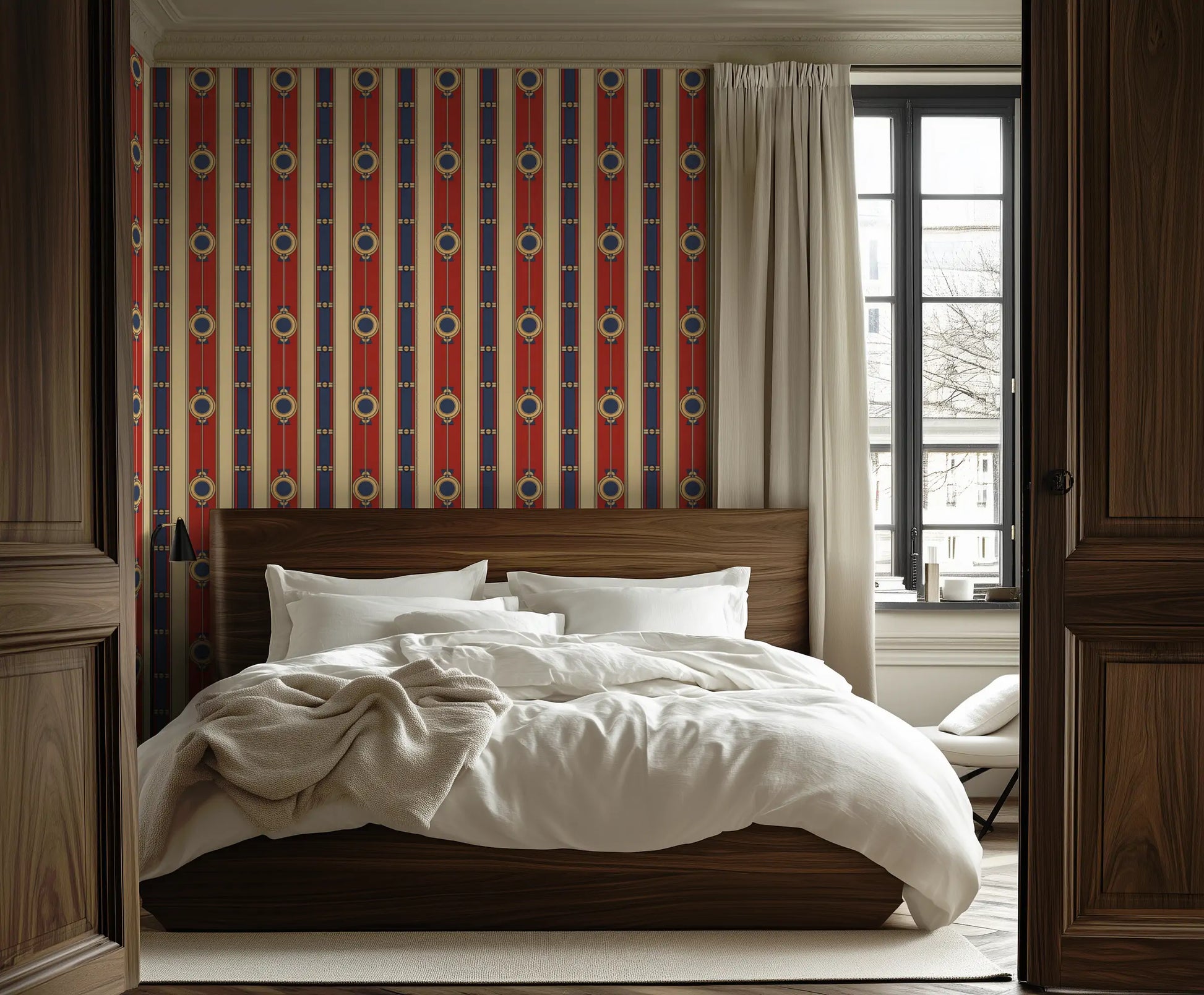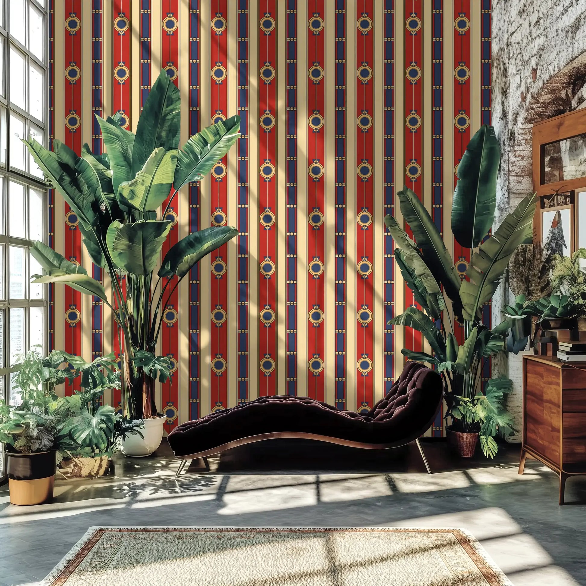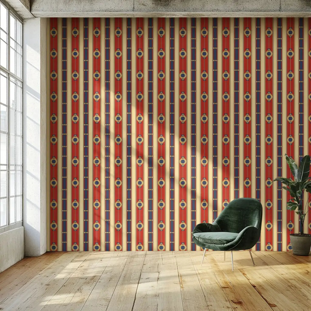 There’s grandeur, and then there’s Habsburg-level grandeur. This wallpaper doesn’t whisper about old money—it declares it, loud, proud, and impeccably dressed. The Habsburgs Called is a stately fusion of royal red, deep navy, and antique gold, structured in perfectly symmetrical stripes reminiscent of aristocratic military regalia and the interiors of palatial train cars bound for Vienna. The circular medallions—ornate, gilded, and unapologetically opulent—add a sense of precision and authority, like a crest that’s been passed down for generations.