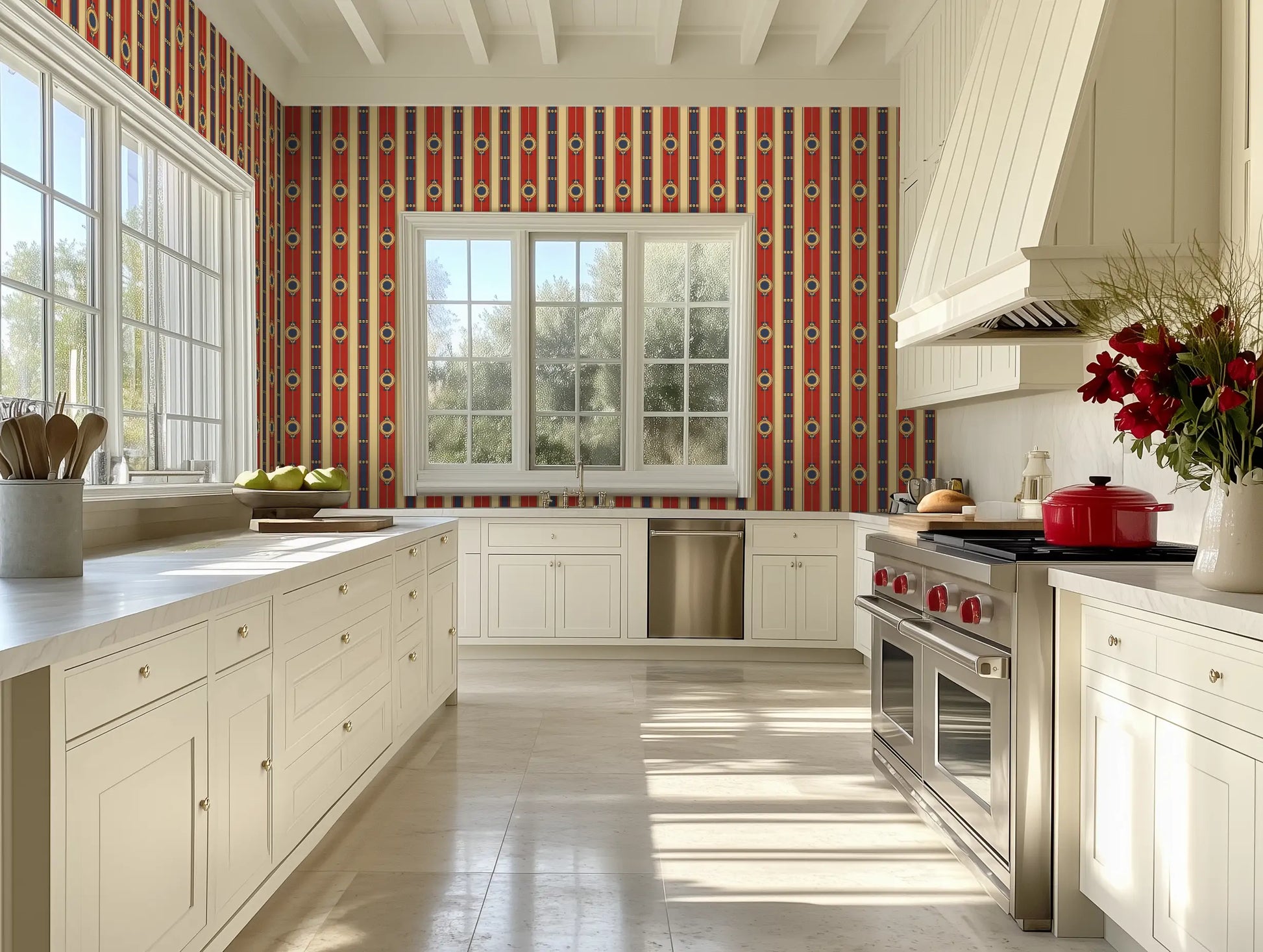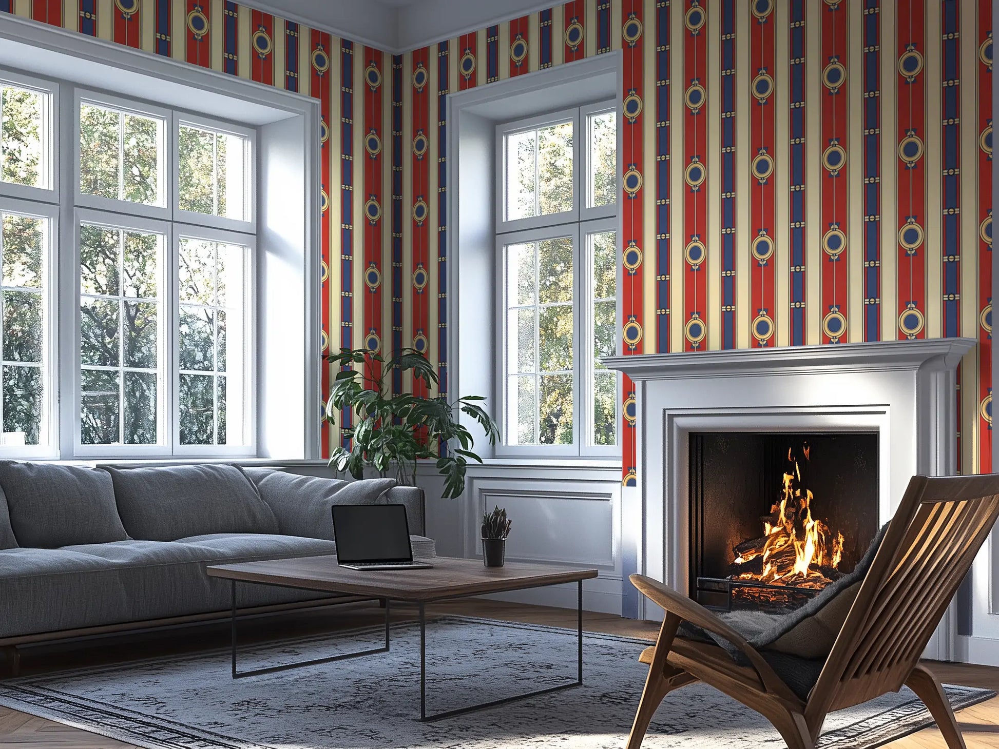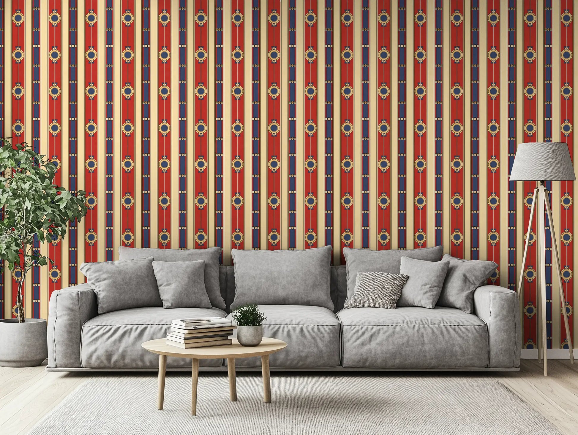 There’s grandeur, and then there’s Habsburg-level grandeur. This wallpaper doesn’t whisper about old money—it declares it, loud, proud, and impeccably dressed. The Habsburgs Called is a stately fusion of royal red, deep navy, and antique gold, structured in perfectly symmetrical stripes reminiscent of aristocratic military regalia and the interiors of palatial train cars bound for Vienna. The circular medallions—ornate, gilded, and unapologetically opulent—add a sense of precision and authority, like a crest that’s been passed down for generations.