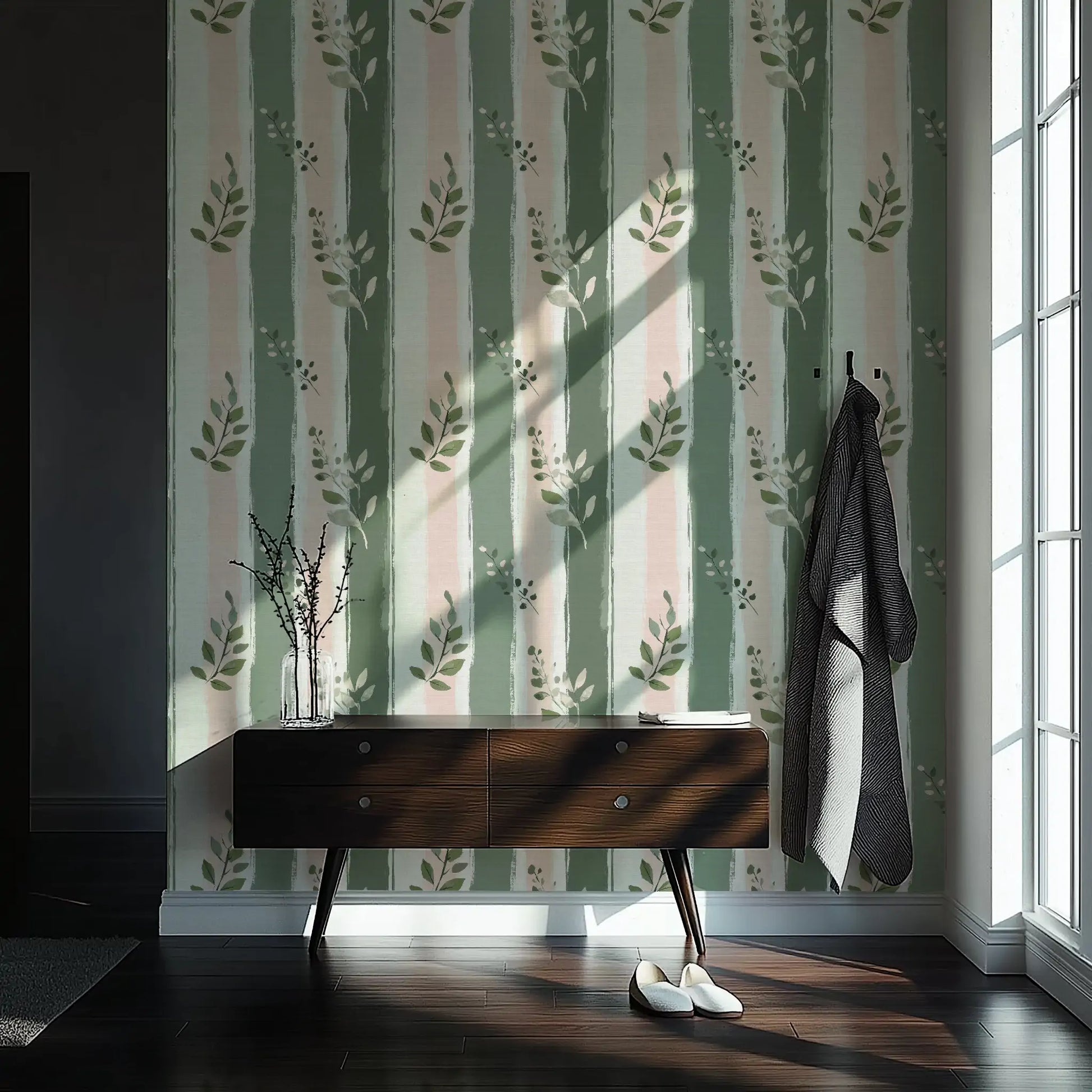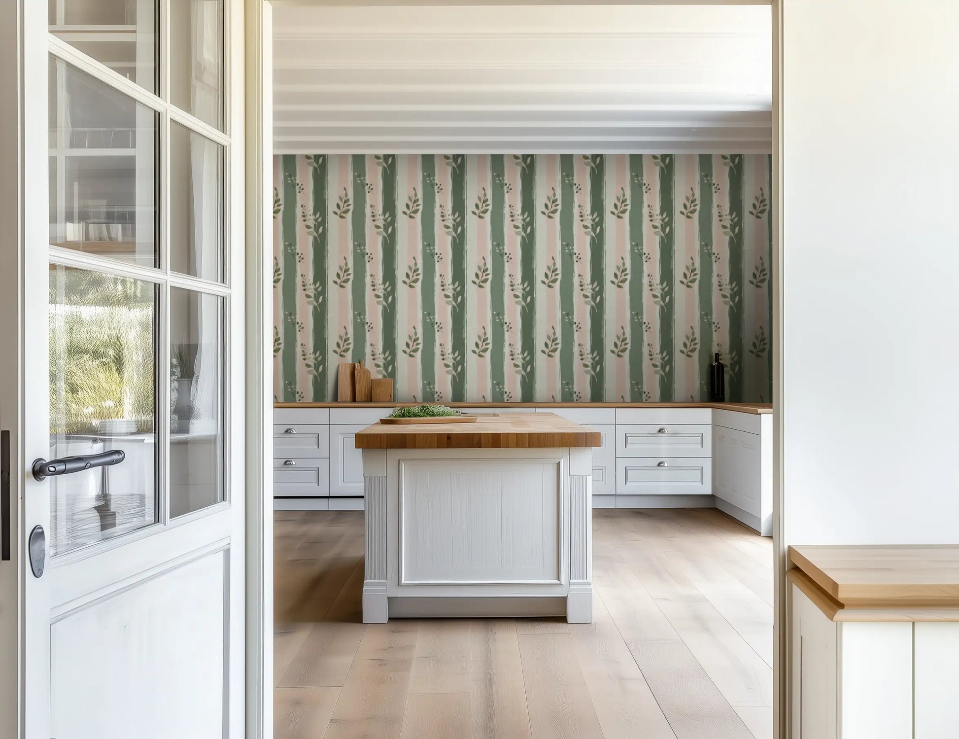 Designed for nature-inspired living rooms, cozy farmhouses, or artistic retreat spaces, this botanical green striped wallpaper pairs beautifully with stone textures, wooden beams, and woven rattan, bringing the tranquil beauty of the French countryside into any home.