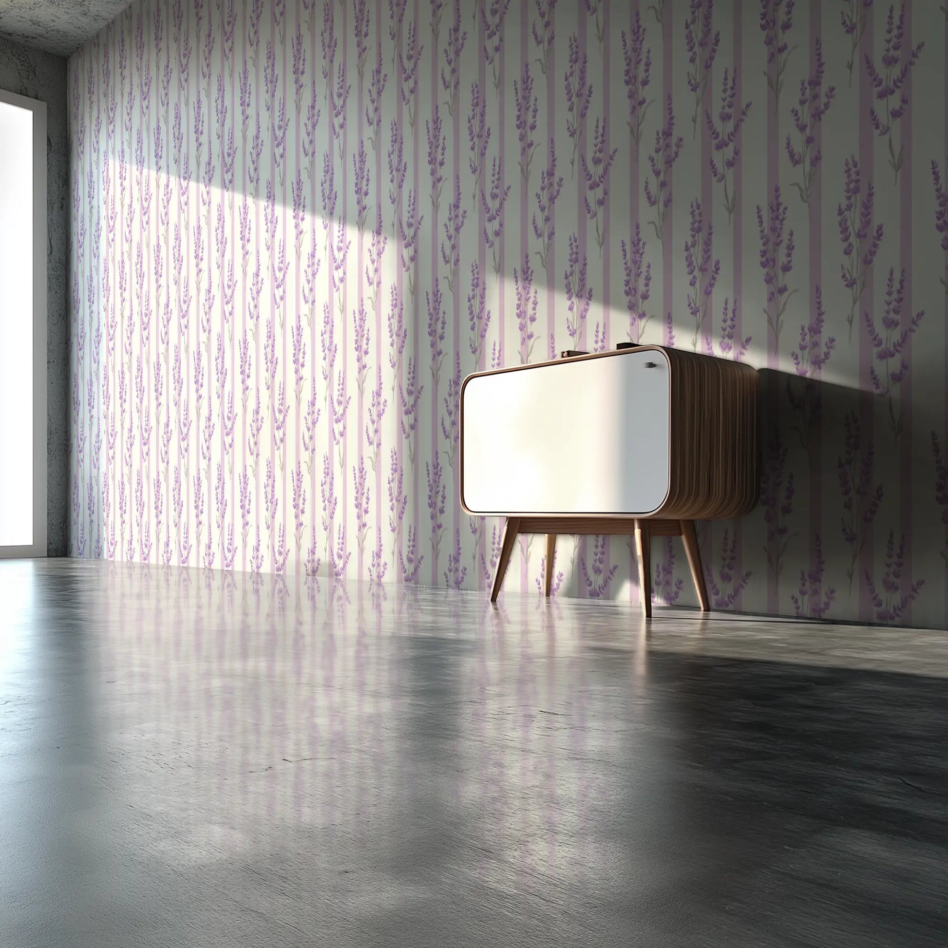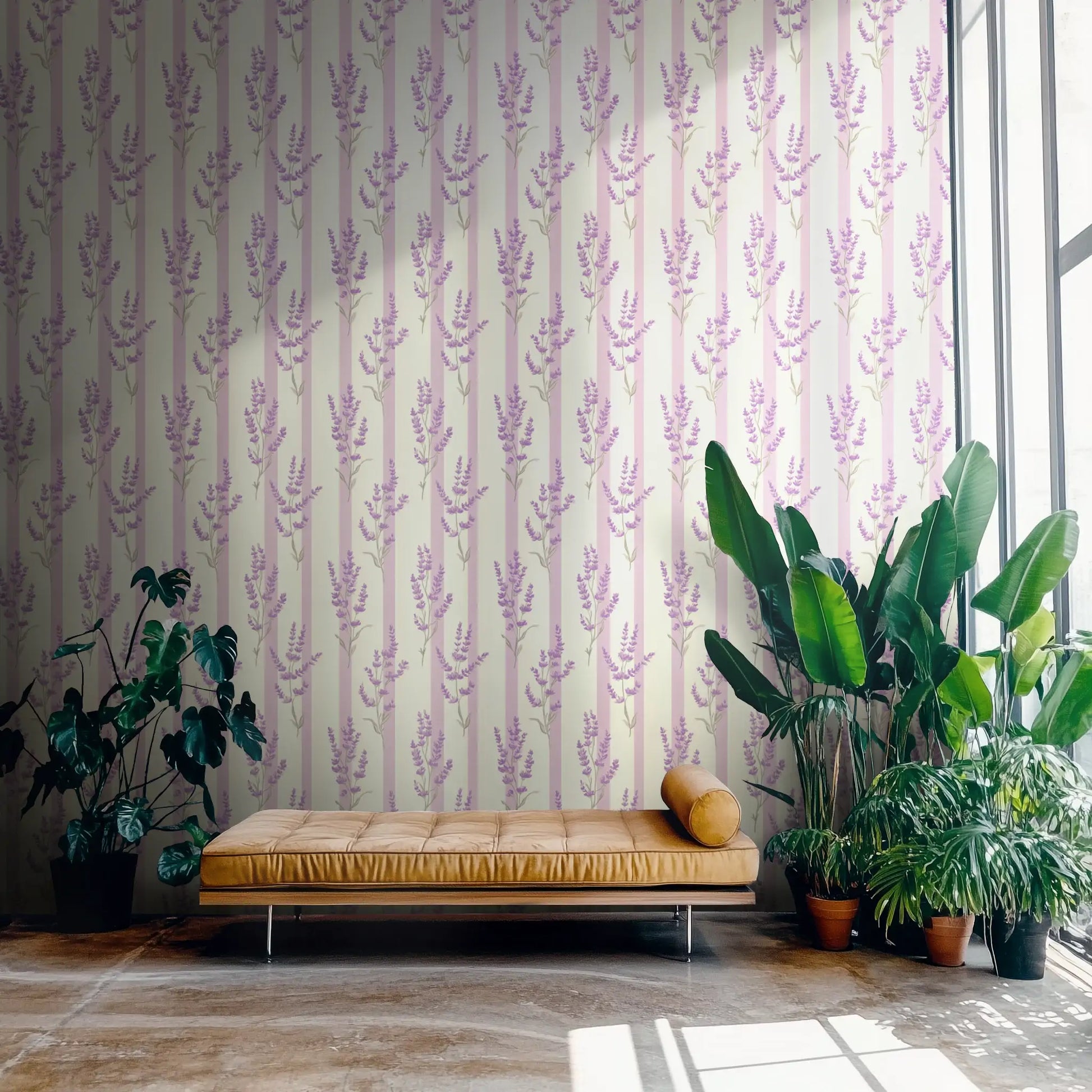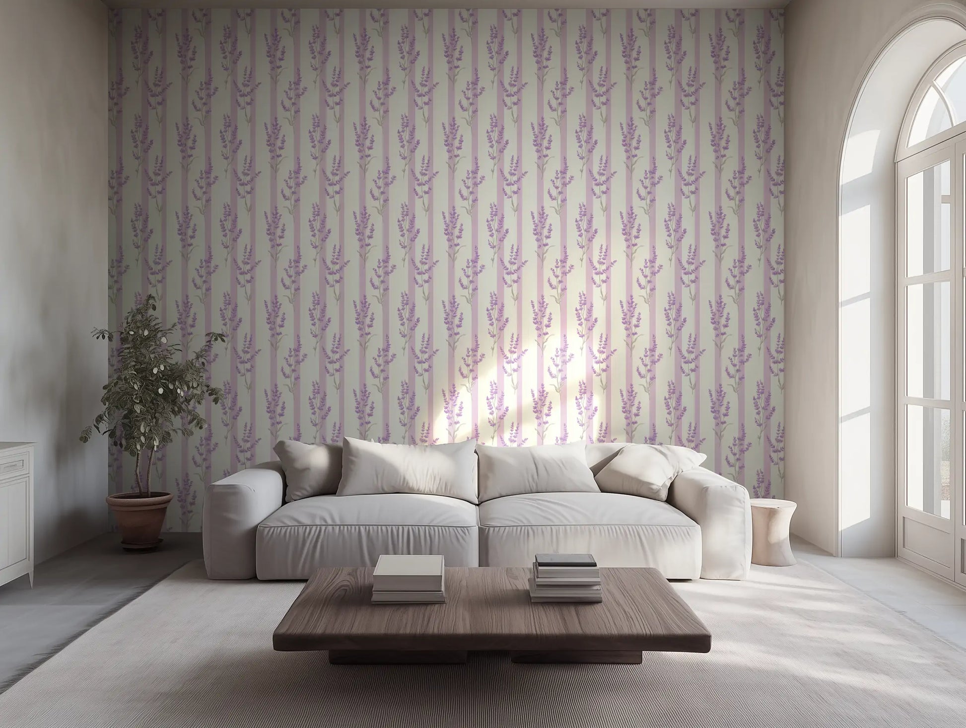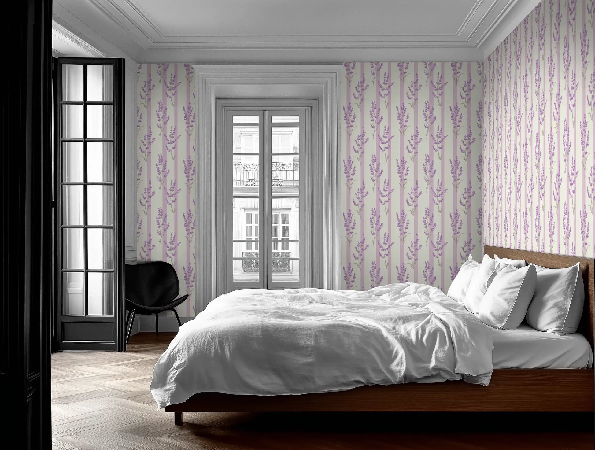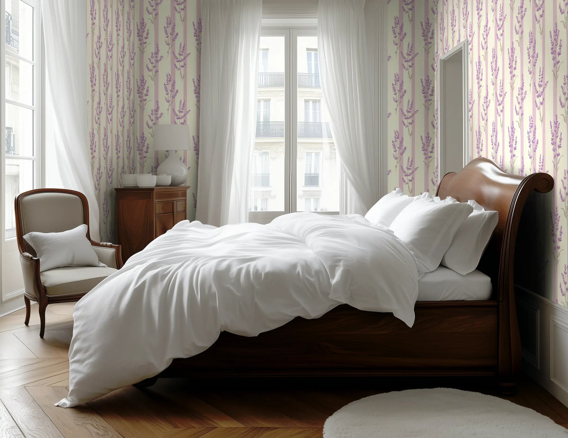 The rolling lavender fields of Provence sway gently in the warm breeze, filling the air with their distinct floral aroma and sunlit beauty. Lavender Fields brings this iconic French landscape to life, featuring delicate lavender sprigs set between soft cream and dusty lilac stripes, evoking the peaceful simplicity of country life.