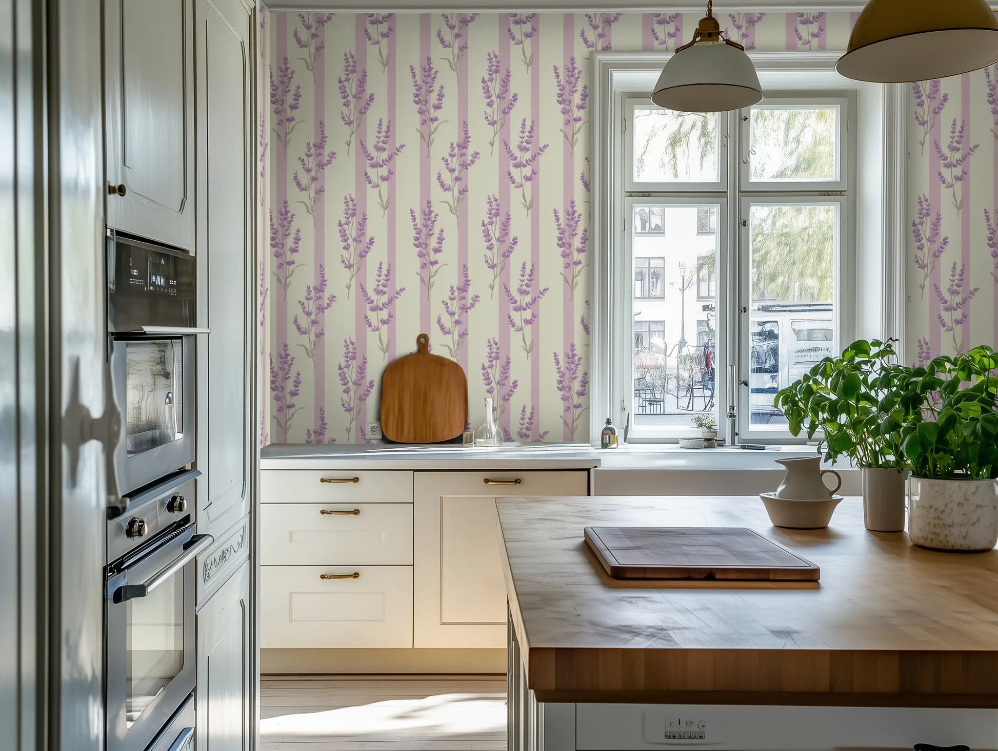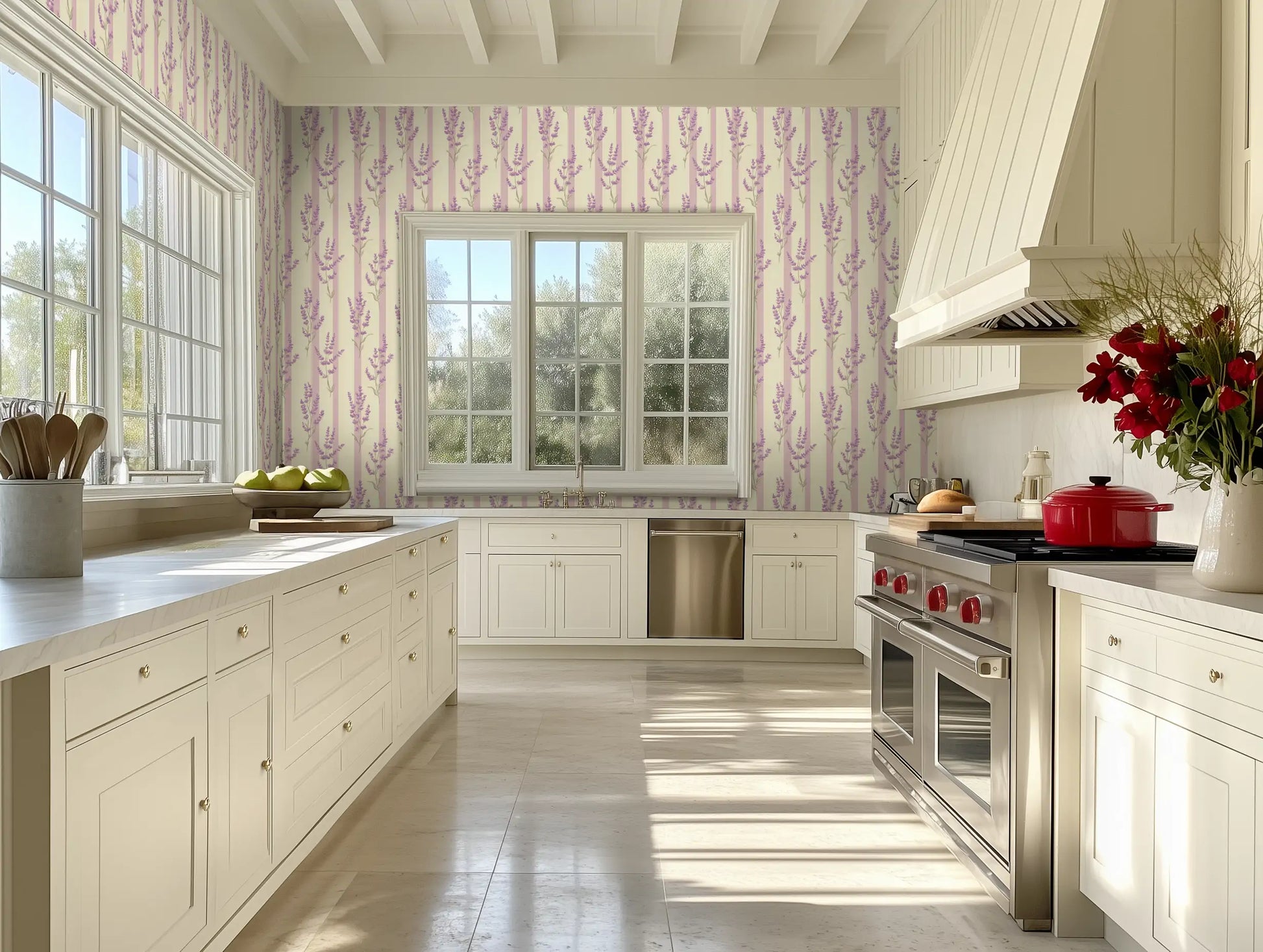 Perfect for nature-inspired kitchens, cozy sunrooms, or romantic bedrooms, this botanical striped wallpaper pairs effortlessly with light linens, vintage ceramics, and weathered wooden accents, creating an interior that feels fresh, airy, and forever in bloom.