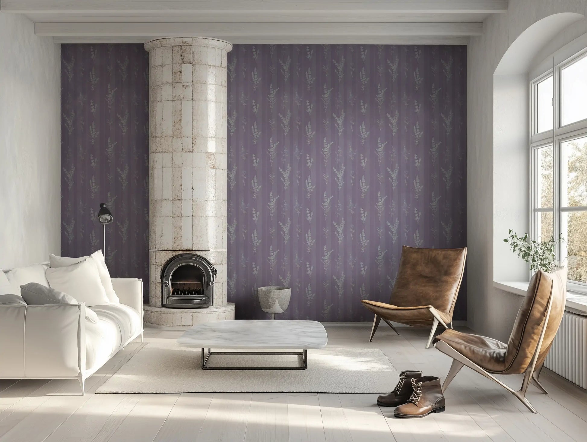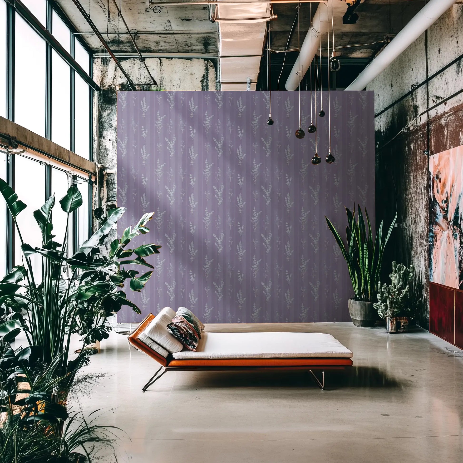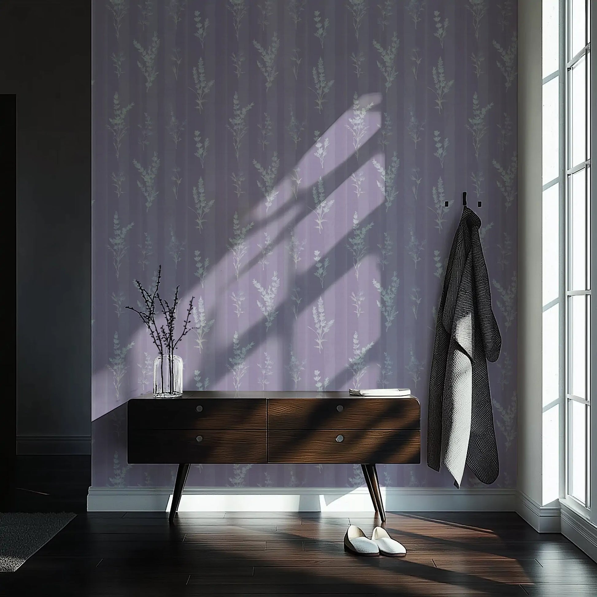 The scent of fresh lavender drifts through the open windows of a rustic farmhouse, blending with the warm Provençal air. Moonlit Lavender is a botanical striped wallpaper, where lavender sprigs dance between muted cream and pale lilac stripes, bringing the essence of the French countryside into any room.