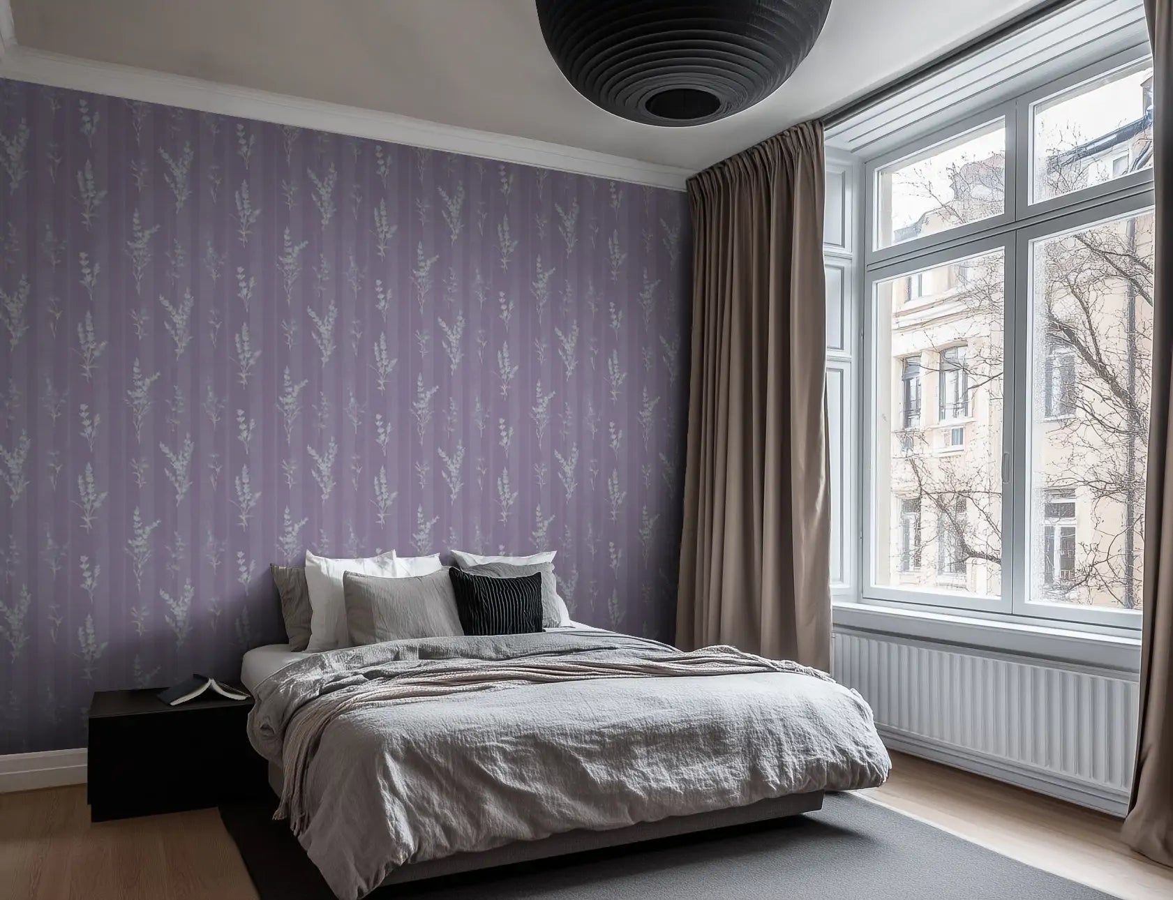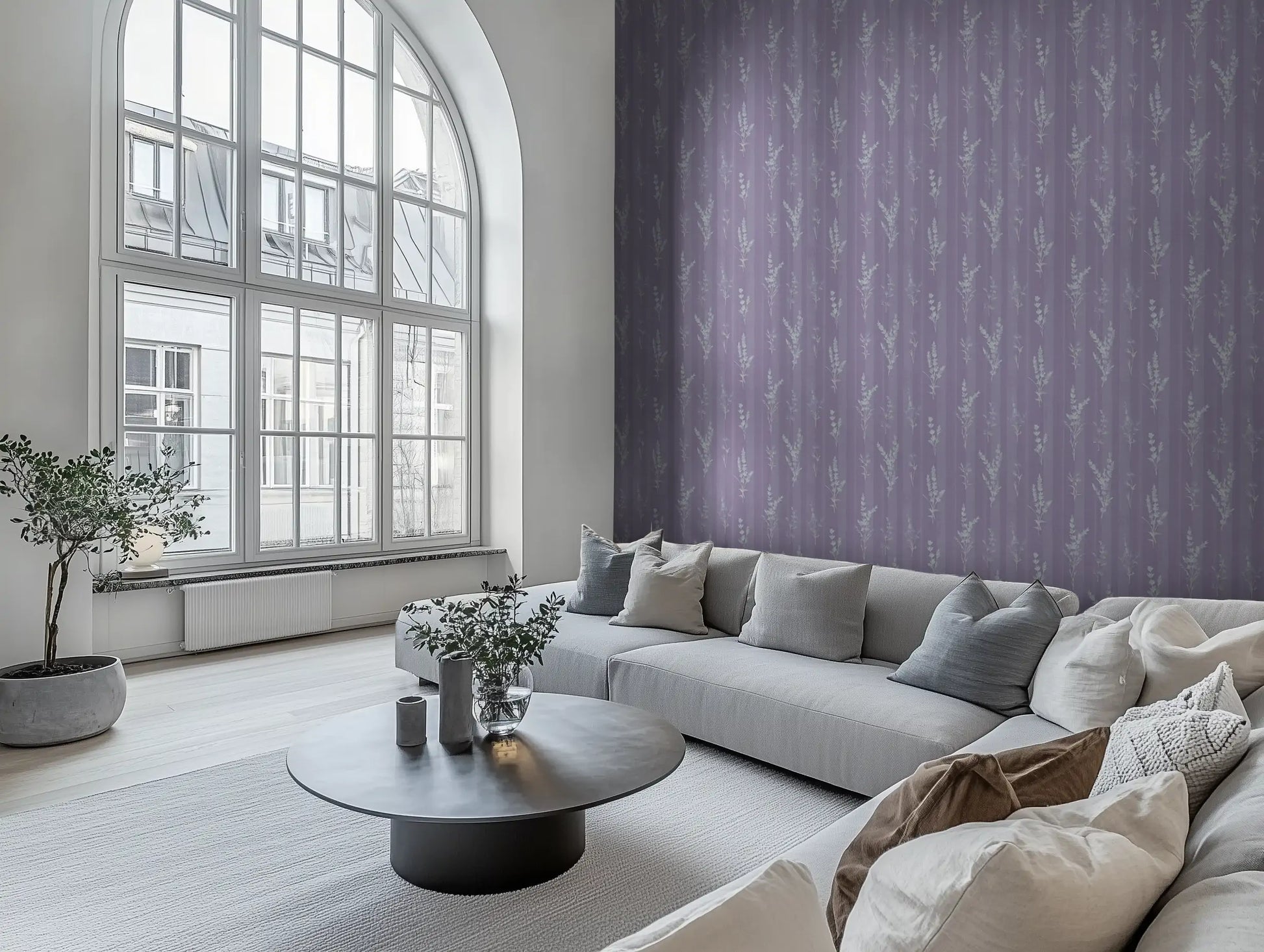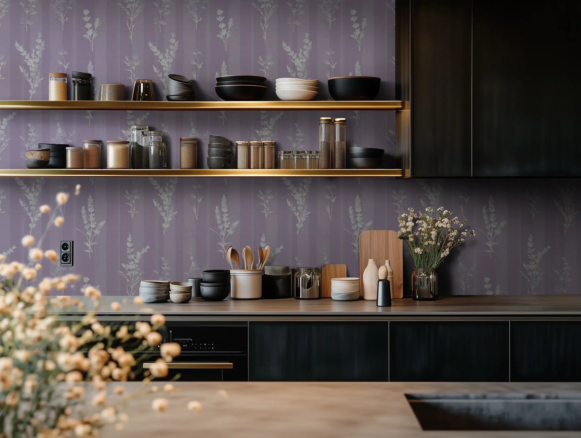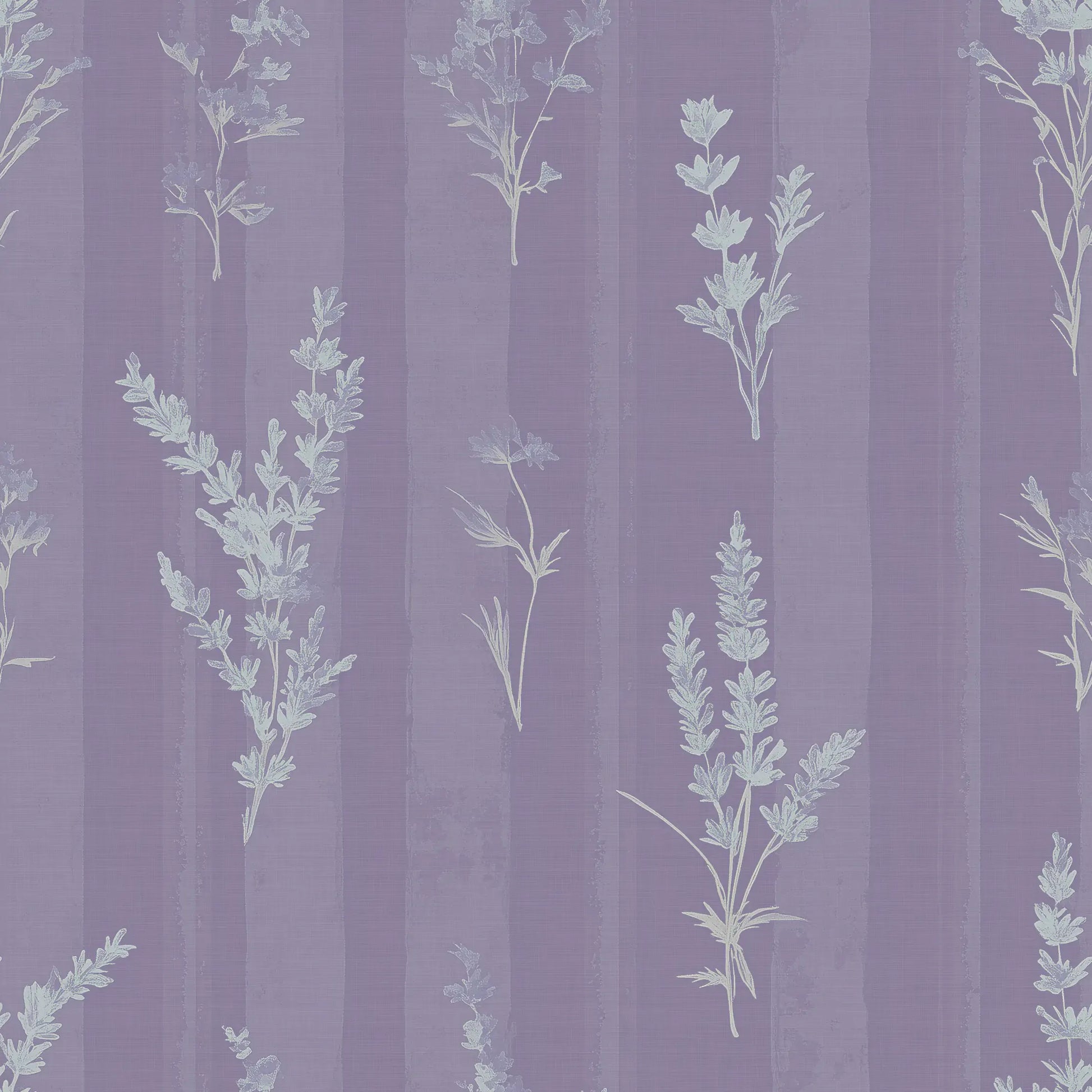 The scent of fresh lavender drifts through the open windows of a rustic farmhouse, blending with the warm Provençal air. Moonlit Lavender is a botanical striped wallpaper, where lavender sprigs dance between muted cream and pale lilac stripes, bringing the essence of the French countryside into any room.