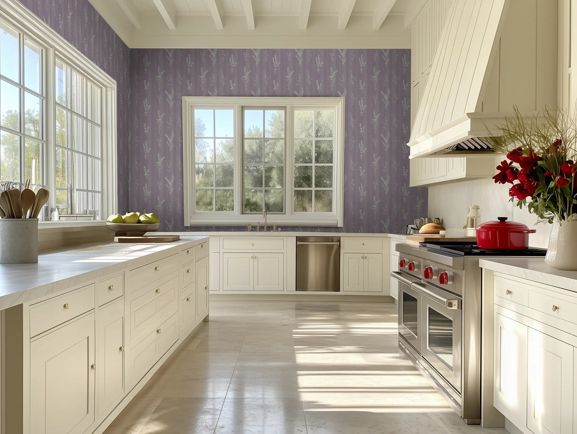 Ideal for sun-drenched kitchens, cozy guest rooms, or modern farmhouse spaces, this floral Provence wallpaper mural pairs beautifully with distressed wood, antique ceramics, and soft linen accents, creating an interior that feels fresh, airy, and forever in bloom.
