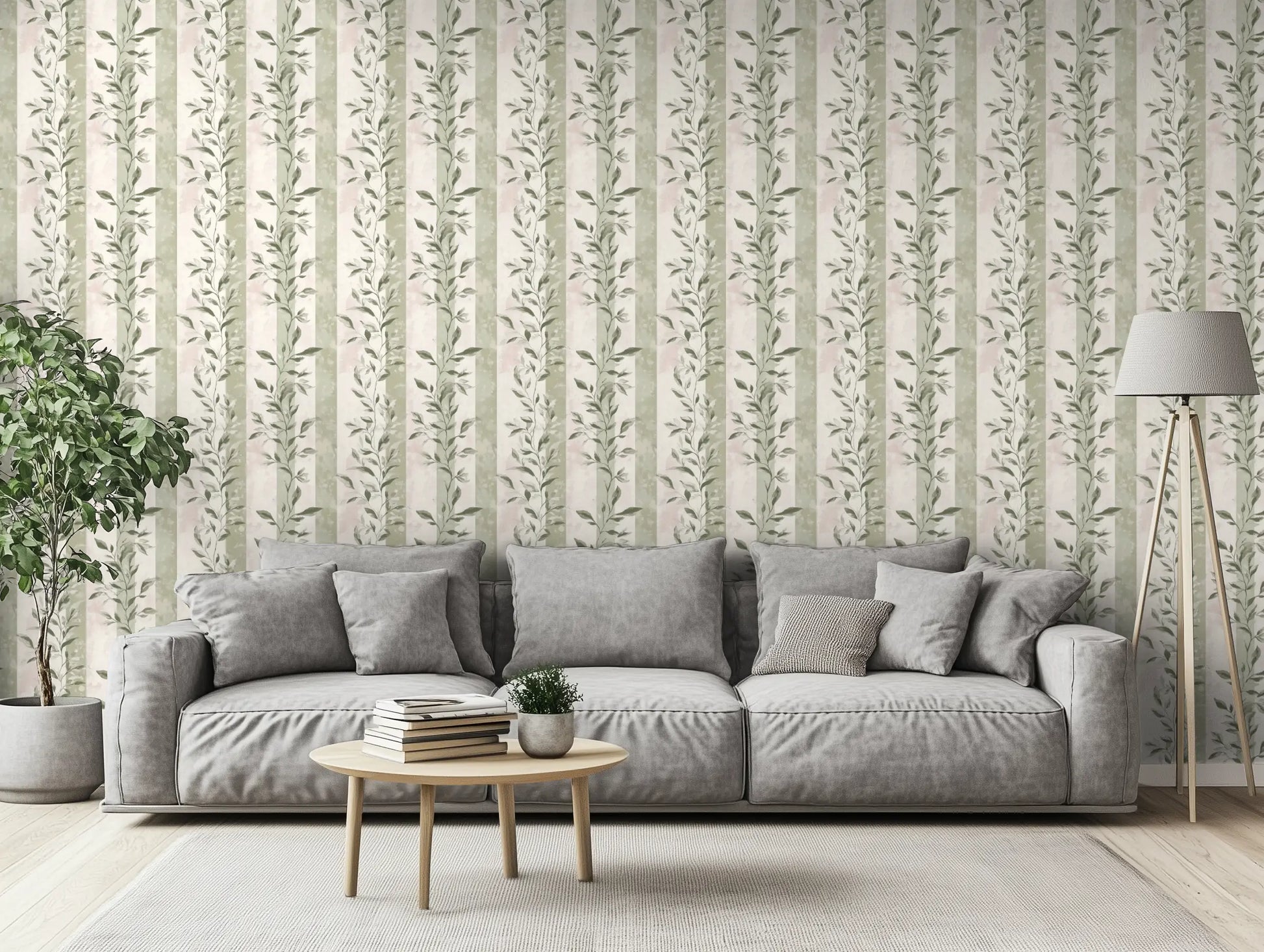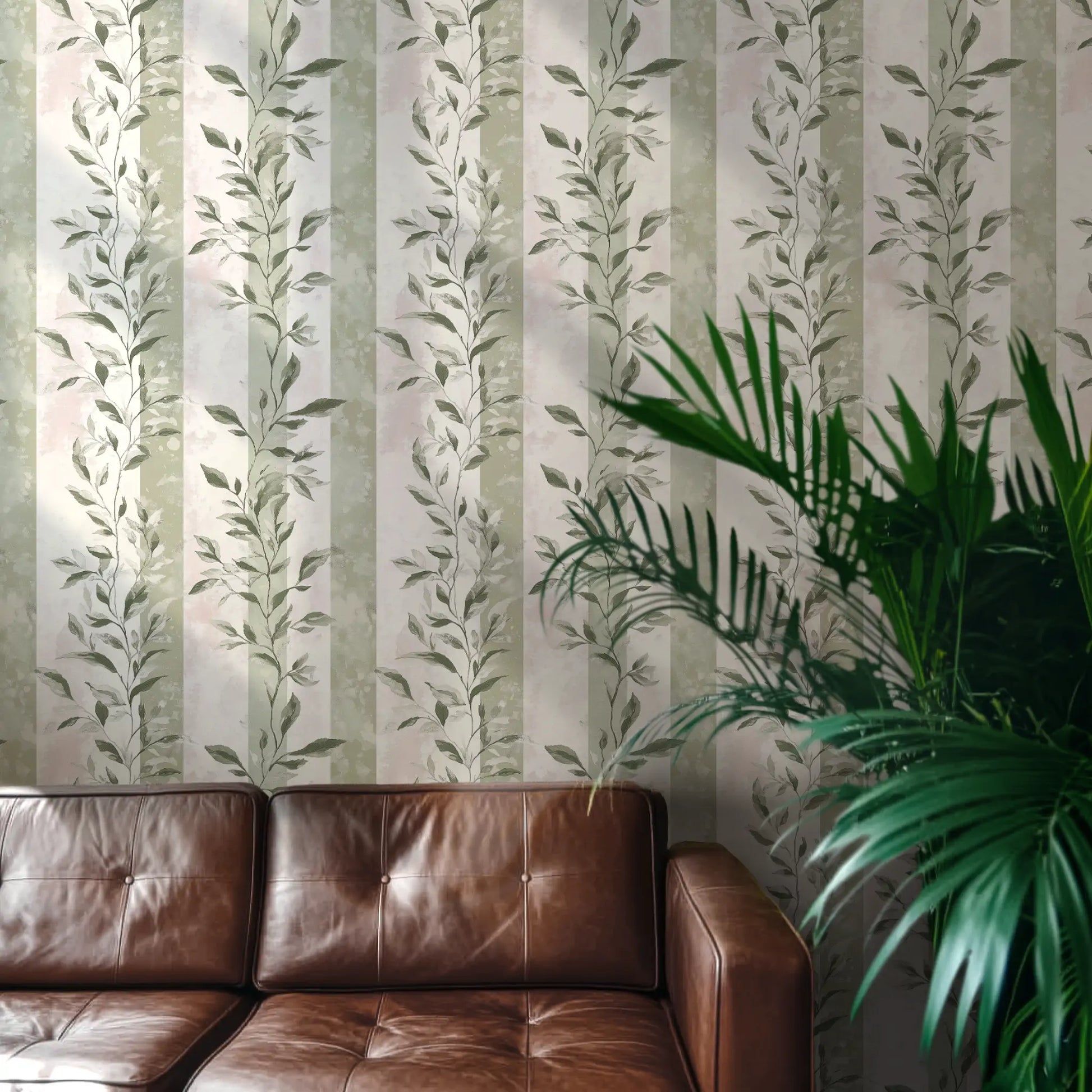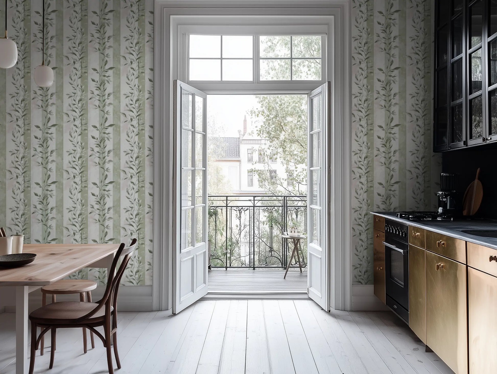 Perfect for botanical-inspired interiors, spa-like bathrooms, or sunlit kitchens, this vintage floral striped wallpaper pairs effortlessly with aged brass, linen textures, and earthen ceramics, creating a space that feels fresh, organic, and elegantly rustic.