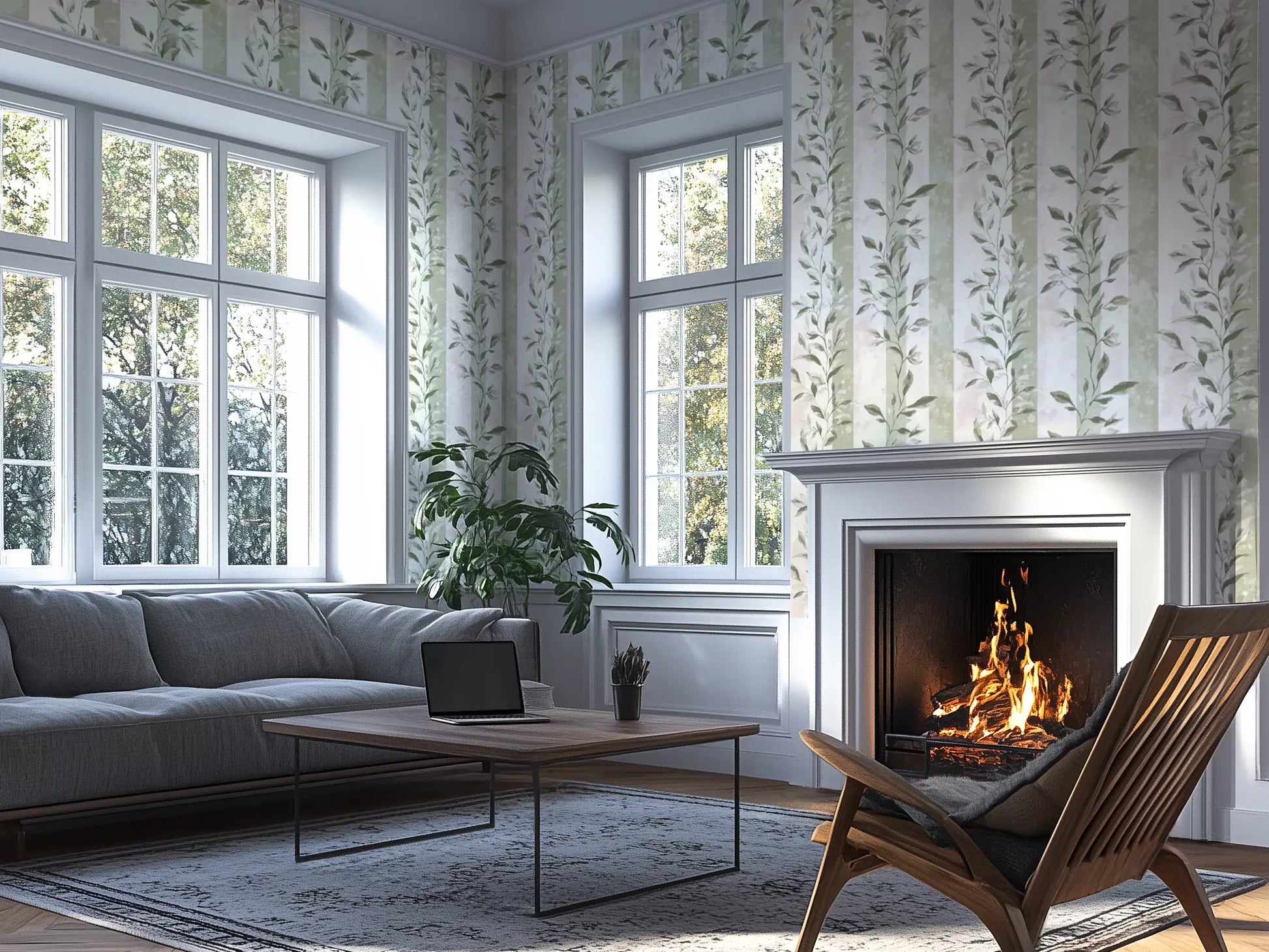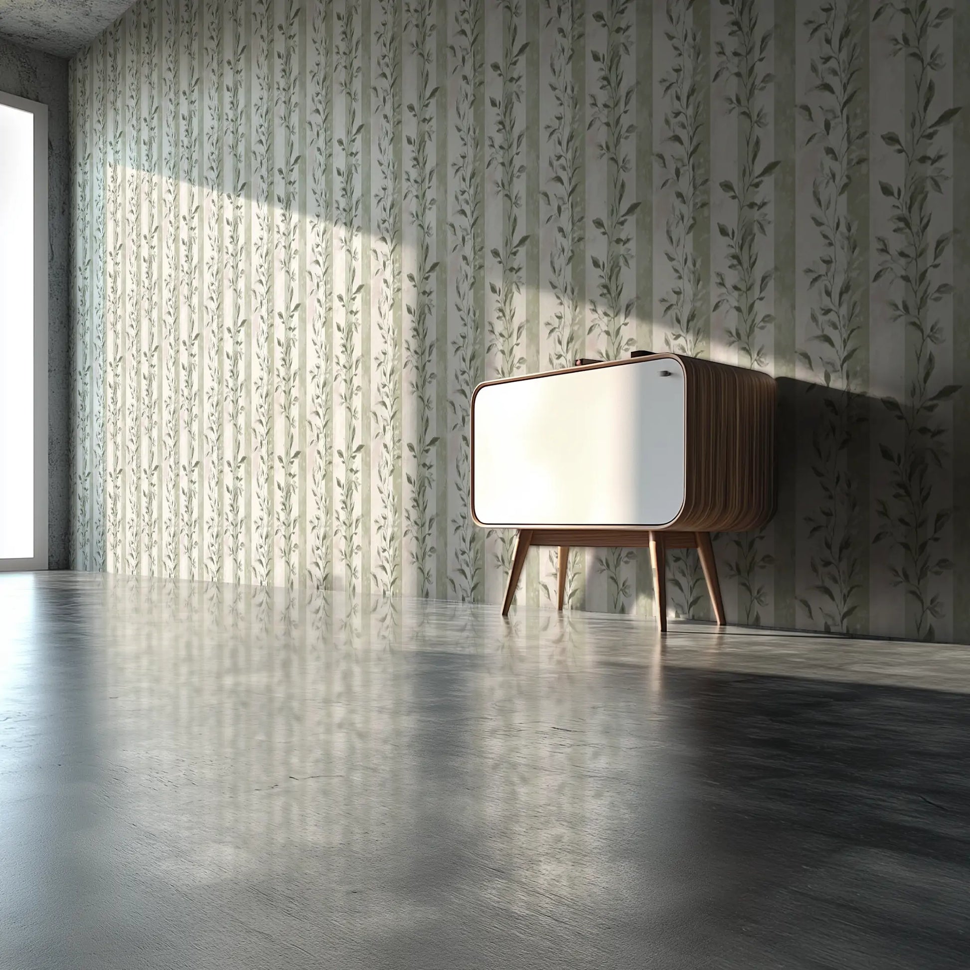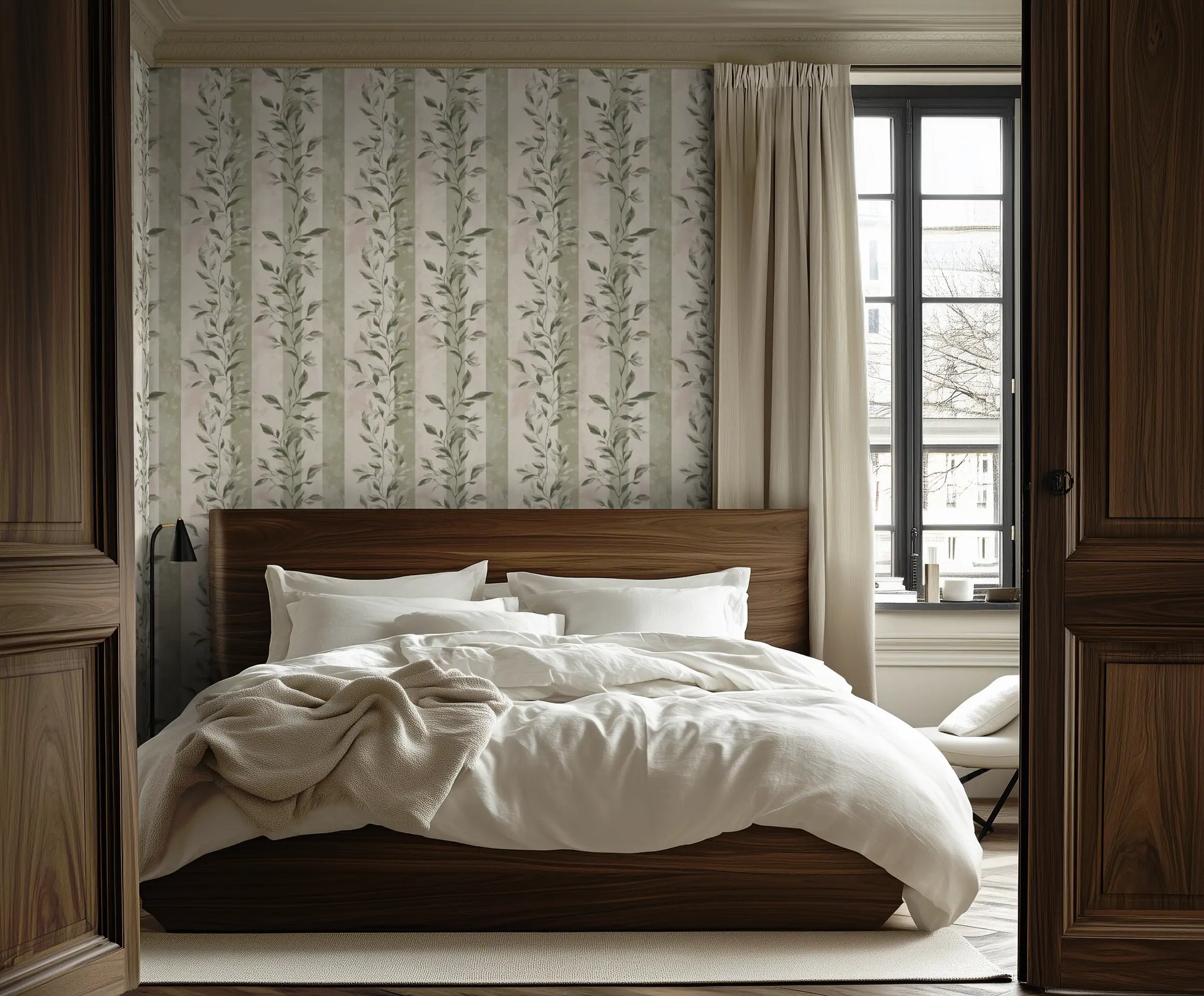 Perfect for botanical-inspired interiors, spa-like bathrooms, or sunlit kitchens, this vintage floral striped wallpaper pairs effortlessly with aged brass, linen textures, and earthen ceramics, creating a space that feels fresh, organic, and elegantly rustic.