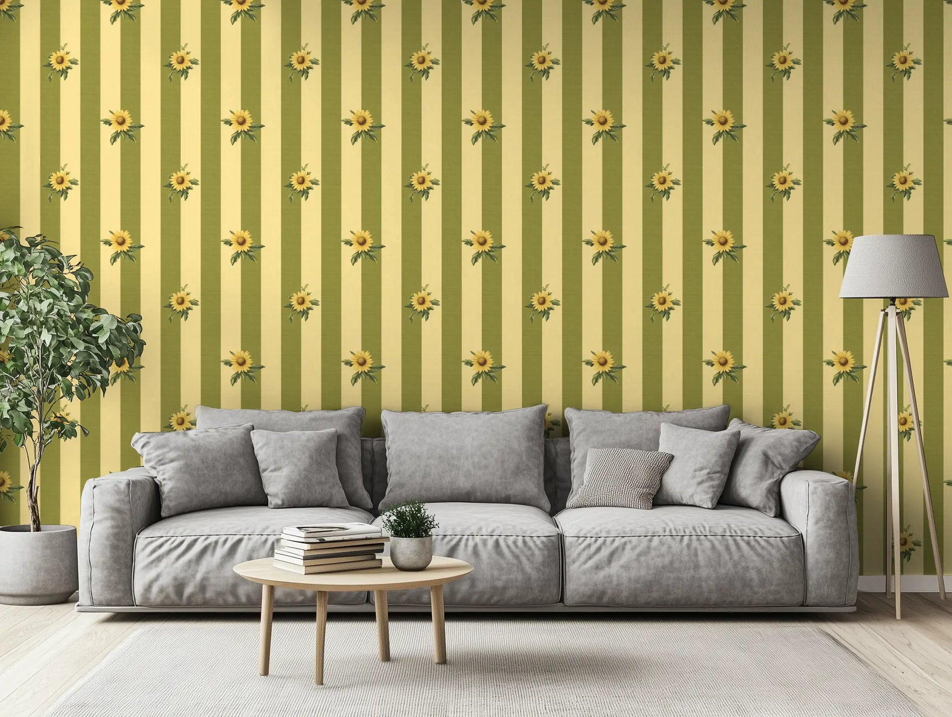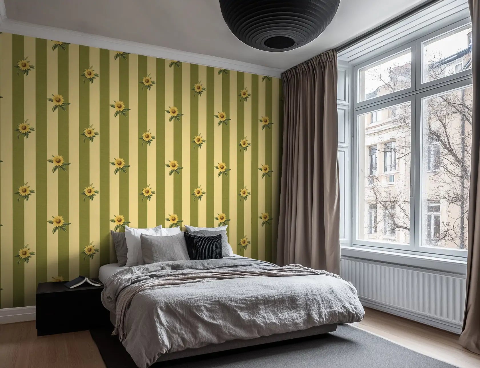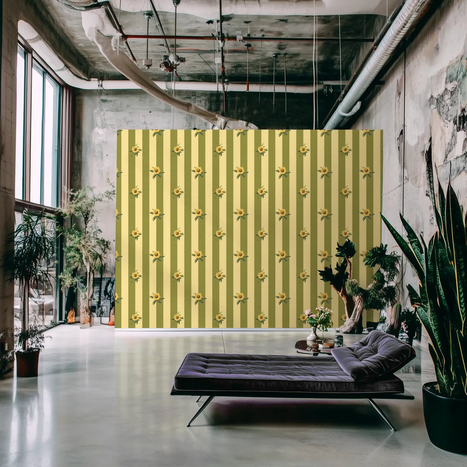 The fields of Provence glow in the late afternoon sun, their golden waves interrupted only by the bold faces of sunflowers, turning lazily toward the light. Soleil d’Or captures the warmth of endless golden fields, blending sun-faded yellow, soft cream, and delicate botanical motifs into a classic French stripe pattern.