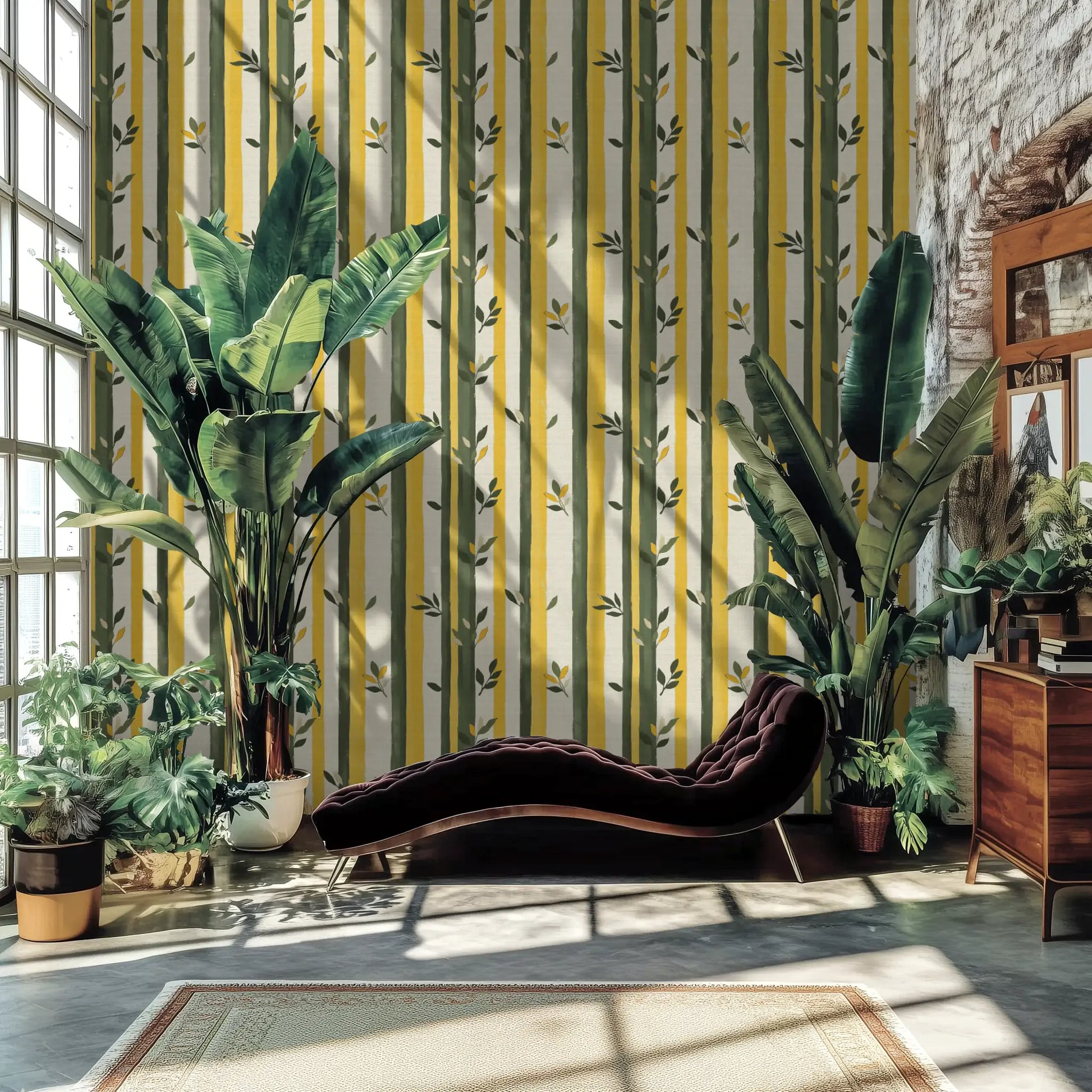 Among the vine-covered walls of Provençal estates, olive branches stretch toward the sky, casting playful shadows over the sun-warmed stone. Verdant Provence captures this lush, nature-infused aesthetic, weaving botanical details through soft sage and golden ochre stripes.