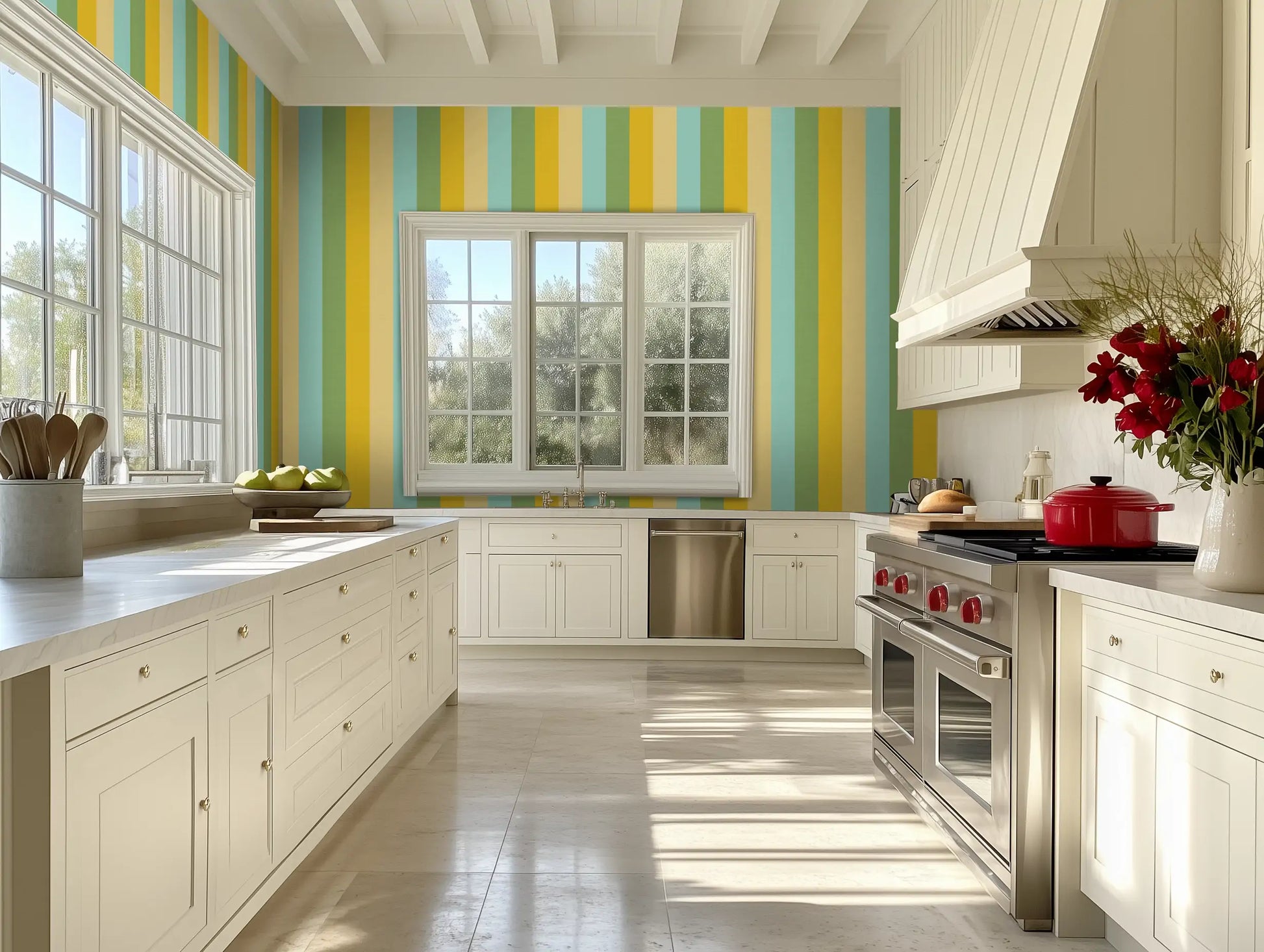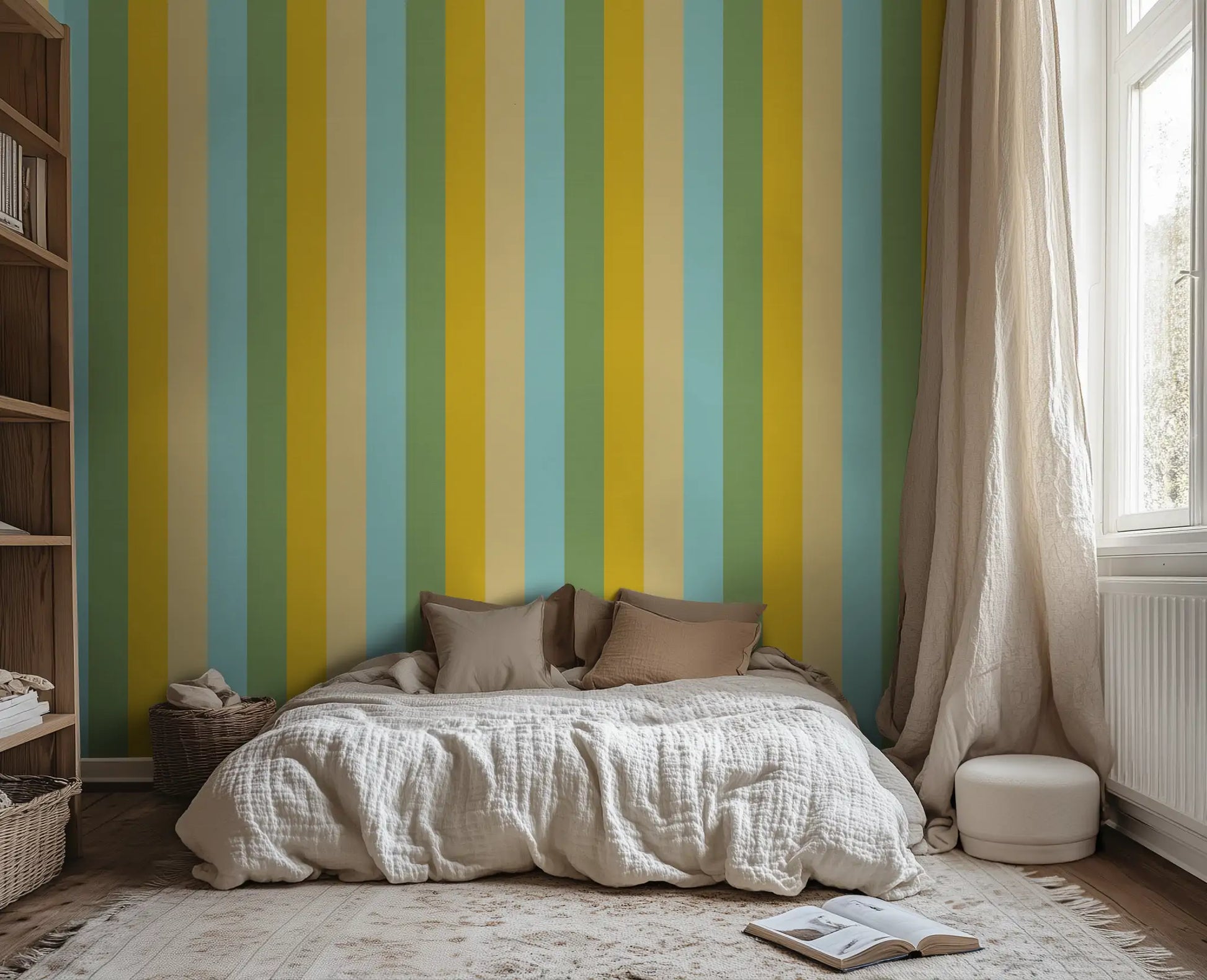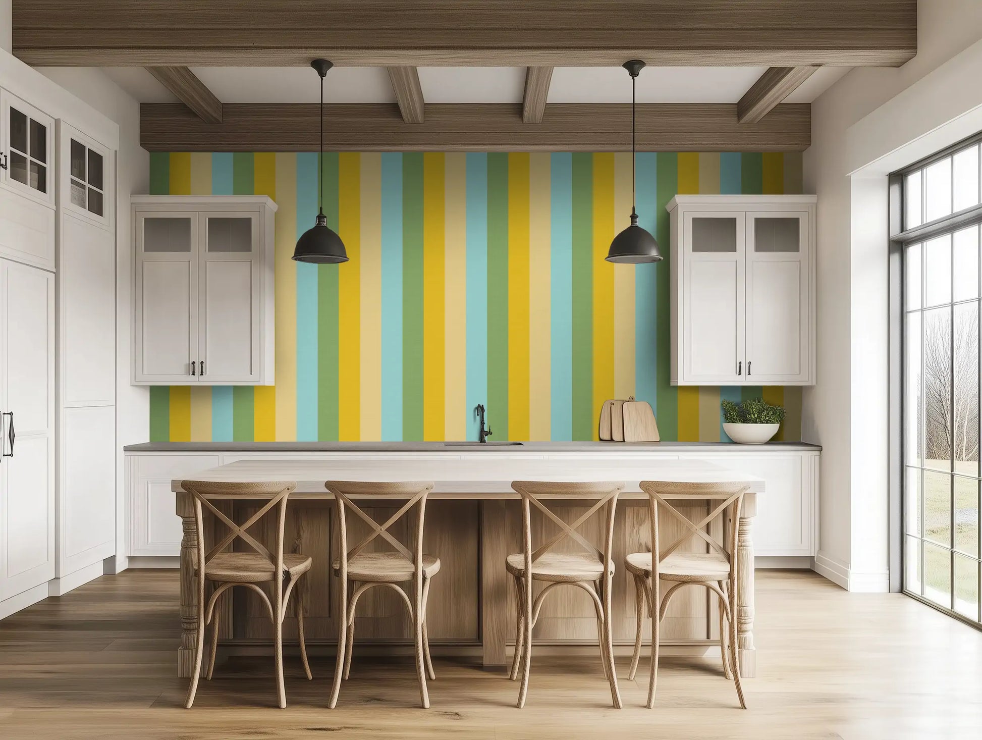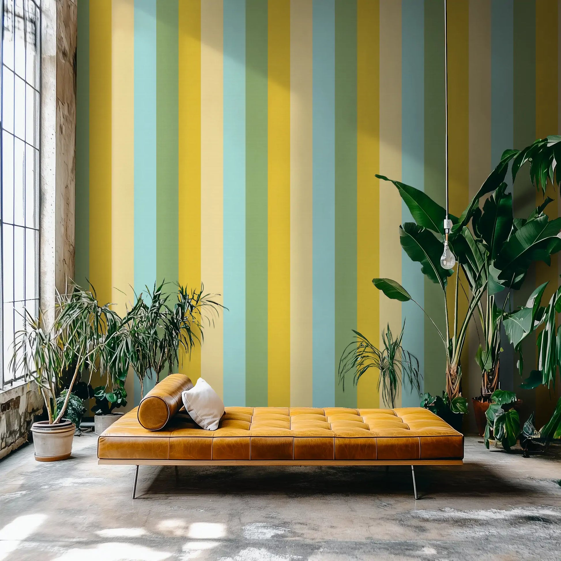 Cape Town is where the golden coastline meets deep blue waters, where sun-drenched vineyards roll into rugged cliffs, and where color is as bold as the culture itself. We’ve extracted the city’s essence—warm sandy yellows, fresh seafoam greens, and cool Atlantic blues—and transformed it into a sophisticated striped wallpaper mural that feels as effortless as a South African summer.