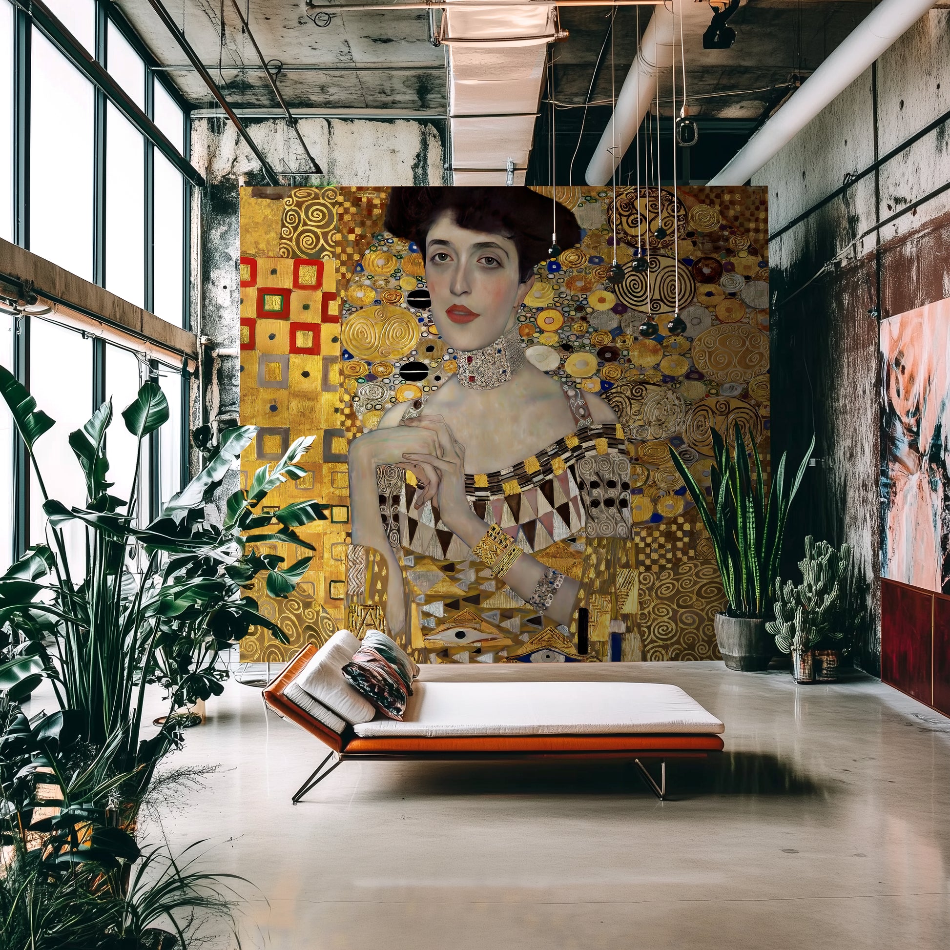Every inch of the painting is a study in ornament—geometric spirals, ancient symbols, floral flourishes—all surrounding a woman of striking elegance and intellect. Klimt didn’t just paint her; he enshrined her. As wallpaper, this mural becomes a bold, glamorous statement, ideal for maximalist interiors, decadent dressing rooms, or anywhere that deserves to feel like a palace.