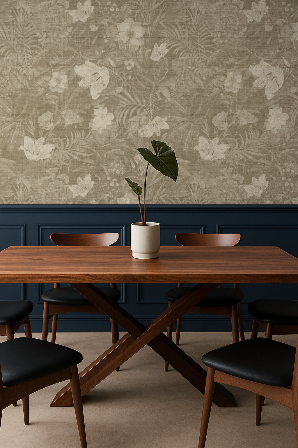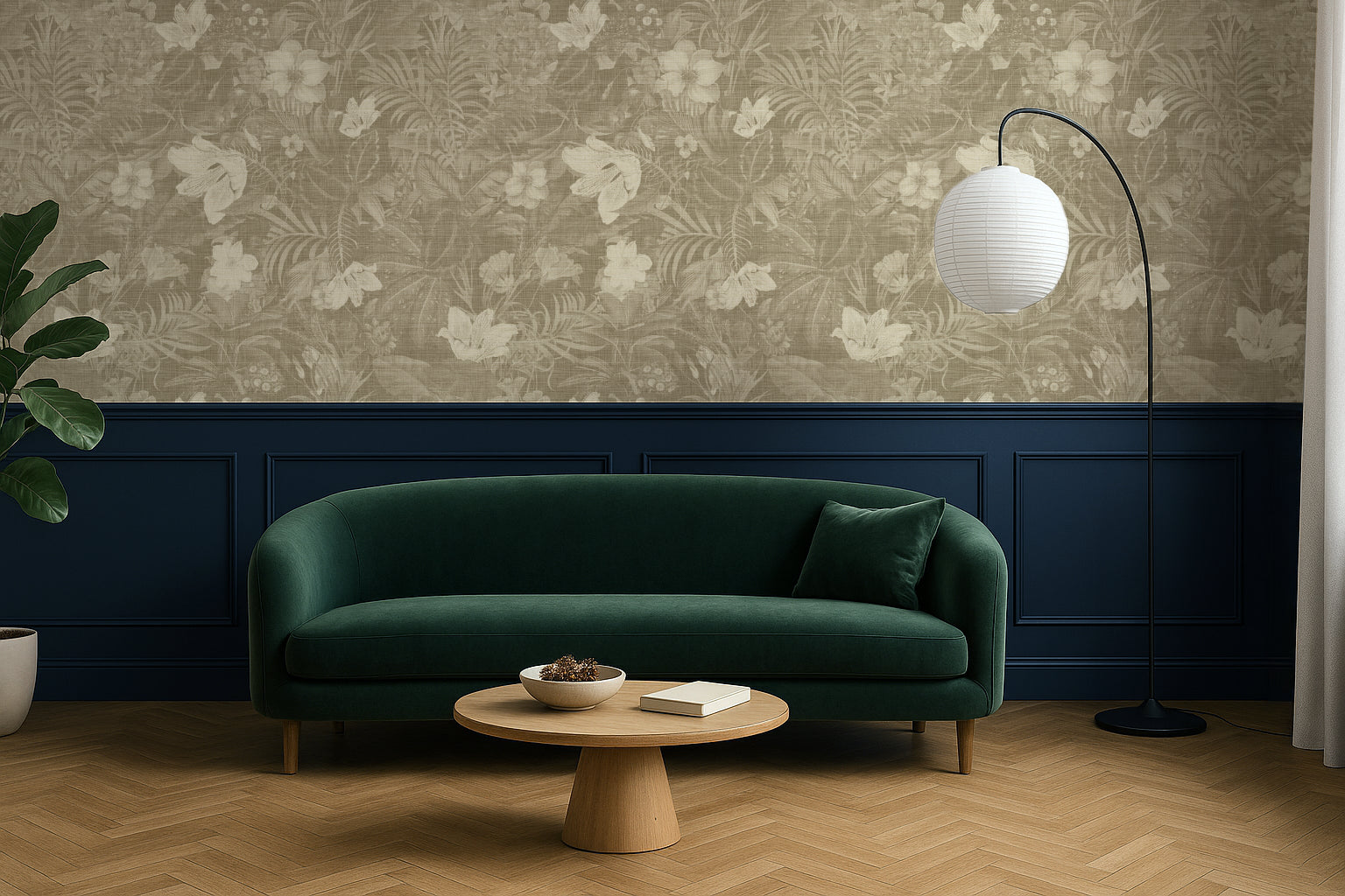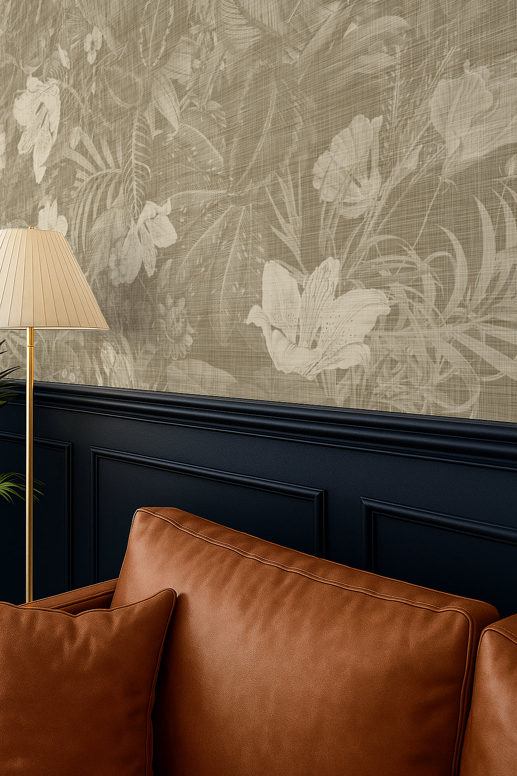 A warm, neutral-botanical design that adds softness without being floral-heavy