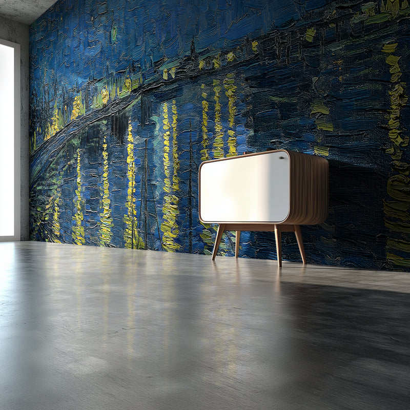 This was Van Gogh chasing light—not just celestial, but emotional. He wrote of the “terrible need for religion” that painting gave him, and you can feel it here: a reverence for beauty, for peace, for love under an infinite sky. As wallpaper, this mural transforms your room into a sanctuary of calm and starlight—perfect for bedrooms, reading corners, or anywhere you want to invite a little night magic in.