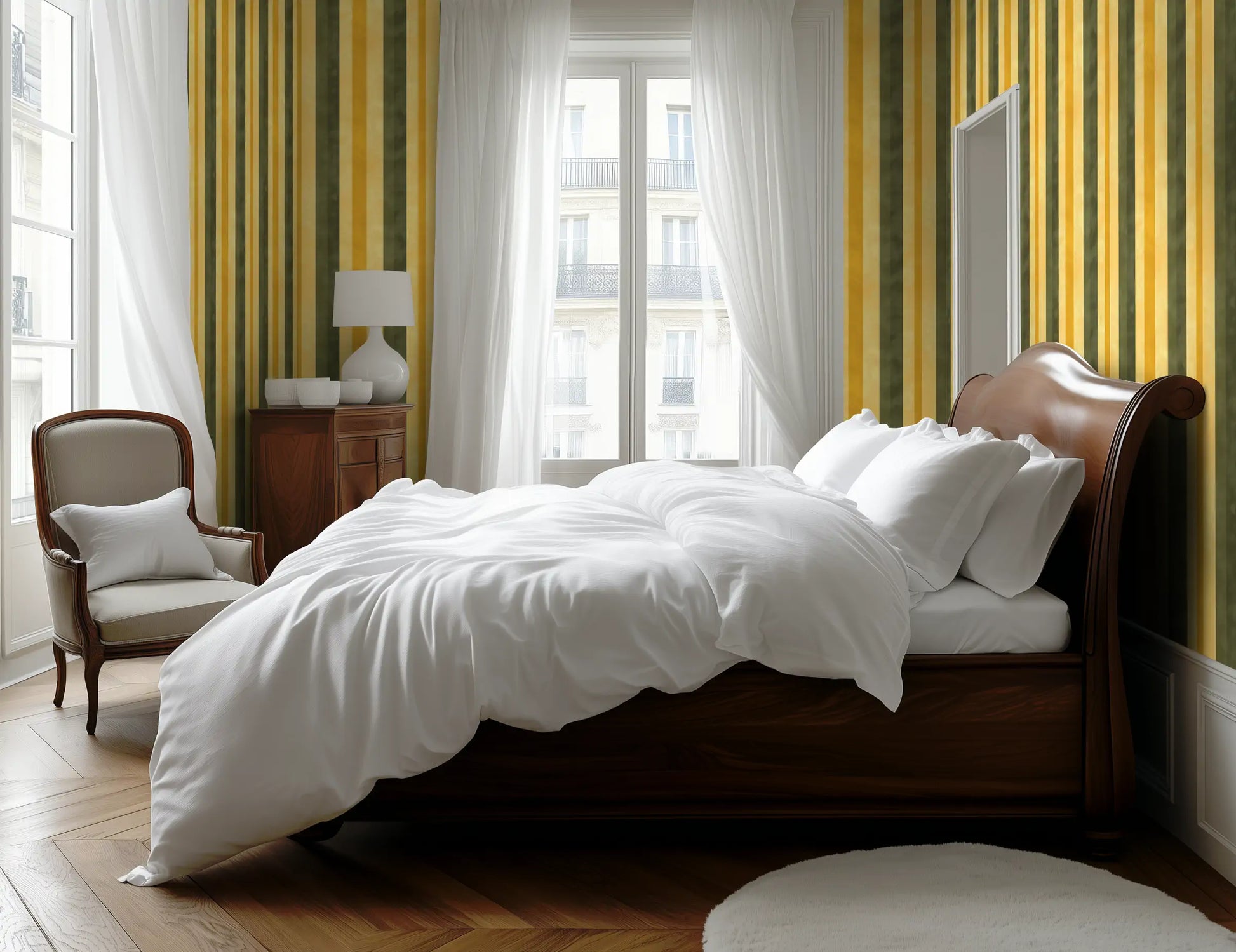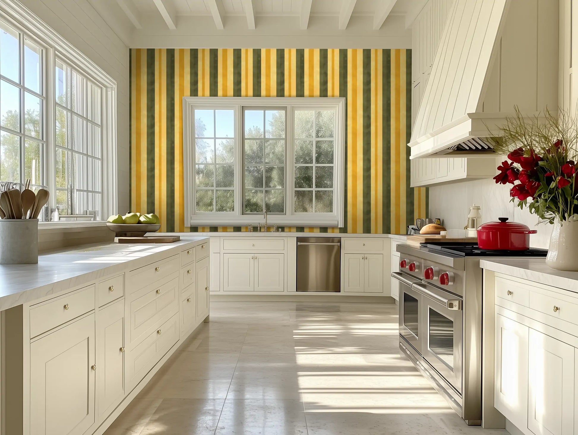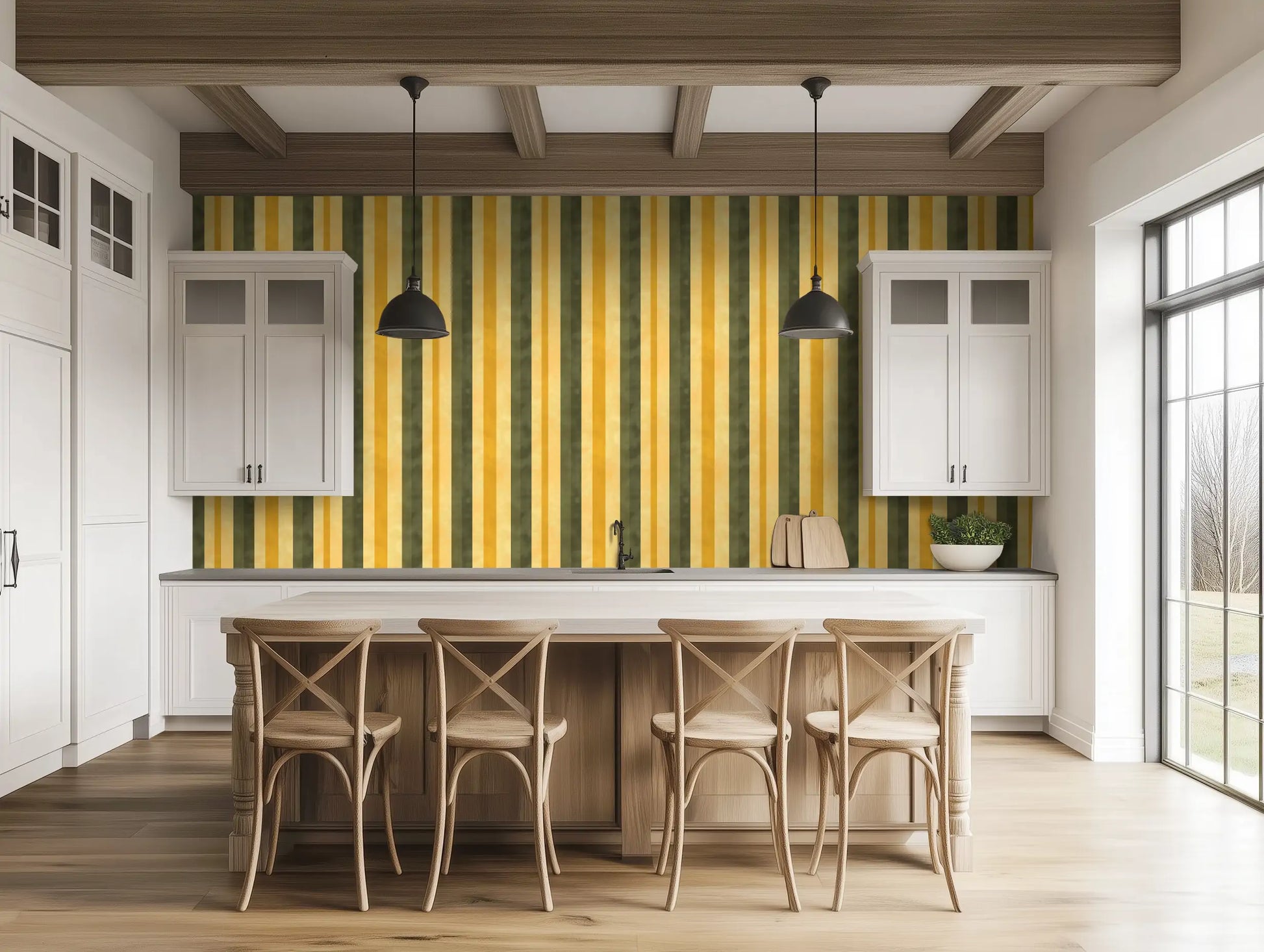 Perfect for cozy dining spaces, Tuscan-inspired interiors, or modern rustic homes, this Provence striped wallpaper pairs beautifully with aged brass, ceramic vases, and woven textures, bringing a sense of earthy elegance to contemporary spaces.